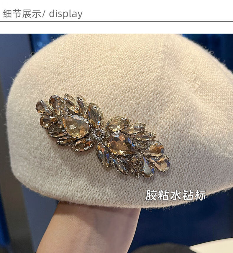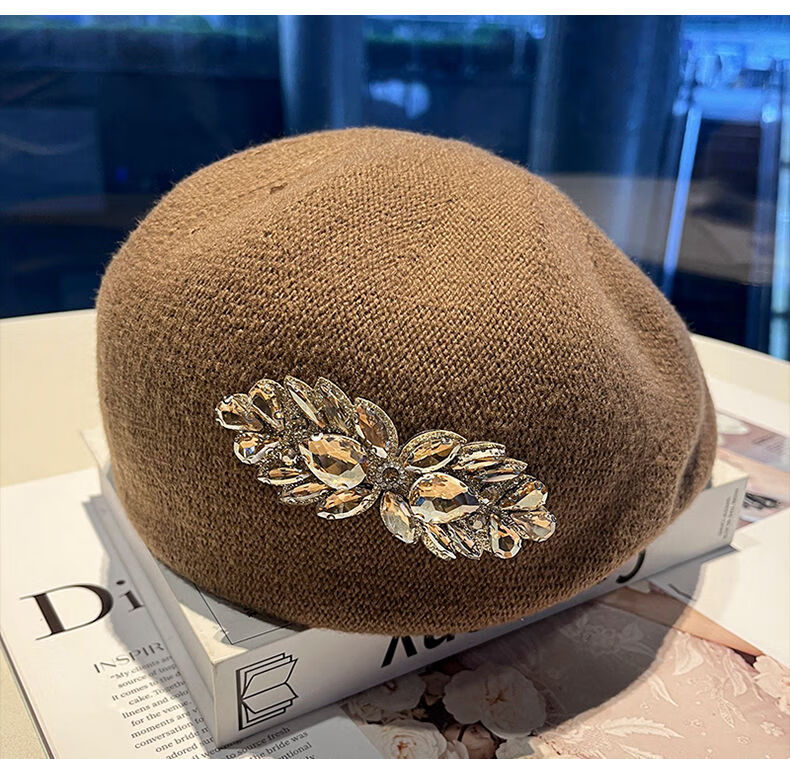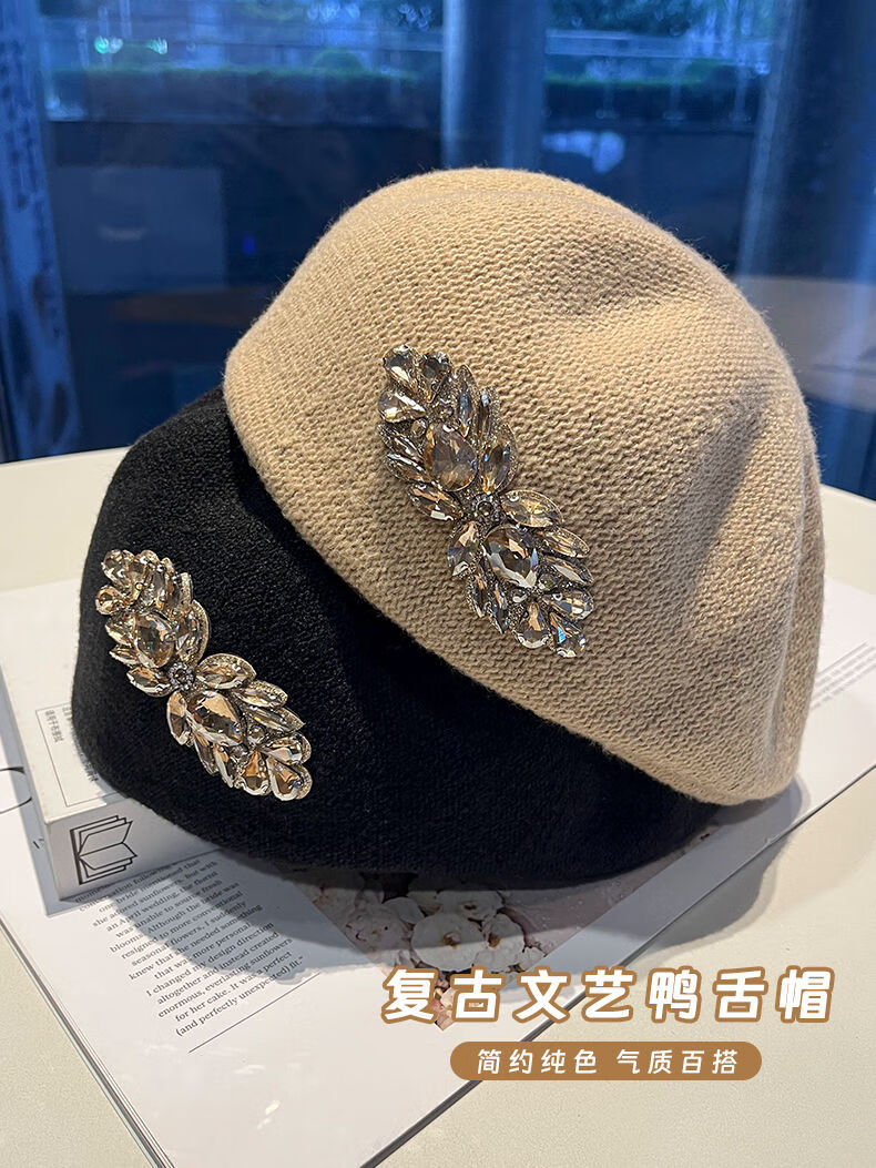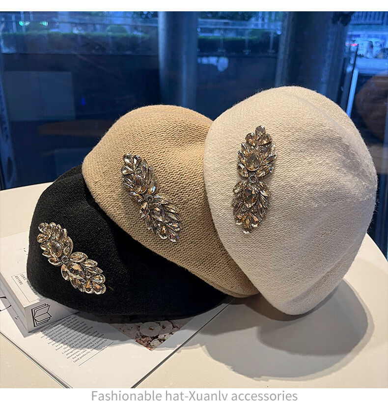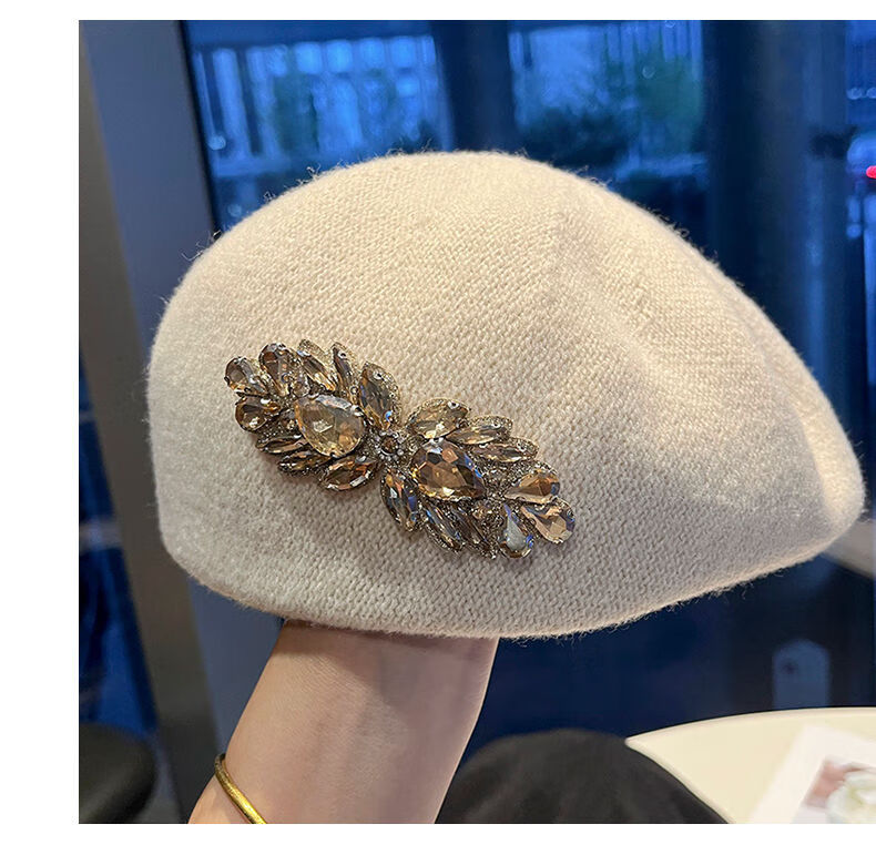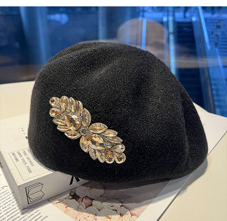 Pisces Rabbit Winter Retro Rhinestone Flower Beret Feminine Face Revealing Small Navy Hat Top Hat Women's Hat Black Rhinestone Flower (Autumn and Winter) One Size 56-58cm (Inside Adjustable)