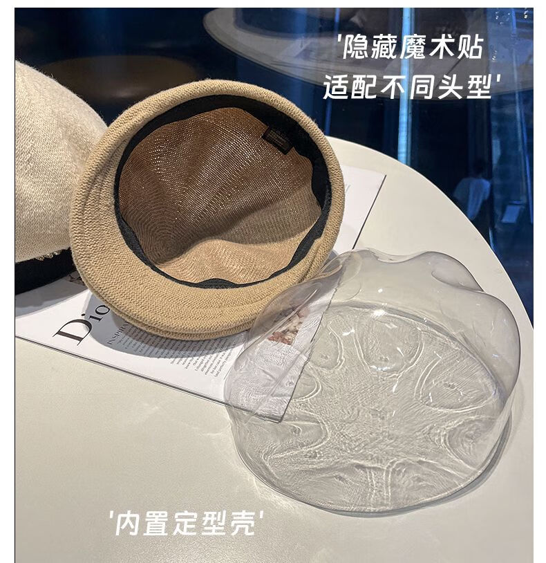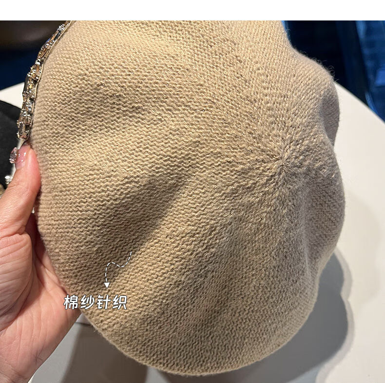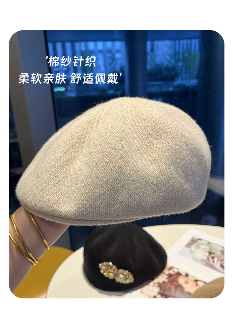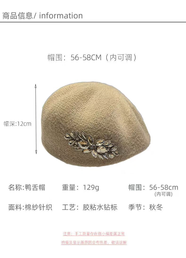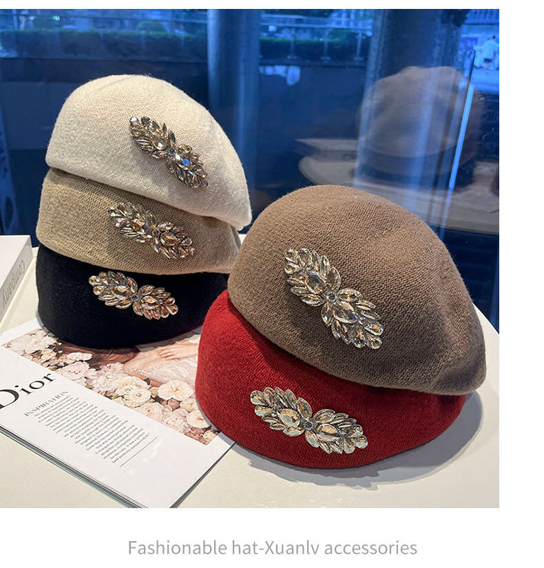Pisces Rabbit Winter Retro Rhinestone Flower Beret Feminine Face Revealing Small Navy Hat Top Hat Women's Hat Black Rhinestone Flower (Autumn and Winter) One Size 56-58cm (Inside Adjustable)