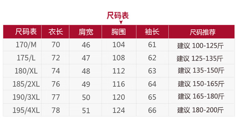 China (cm) 165 / 88-90 170 / 96-98 175 / 108-110 180 / 118-122 185 / 126-130