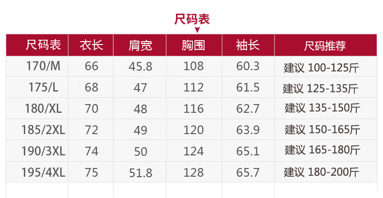 China (cm) 165 / 88-90 170 / 96-98 175 / 108-110 180 / 118-122 185 / 126-130