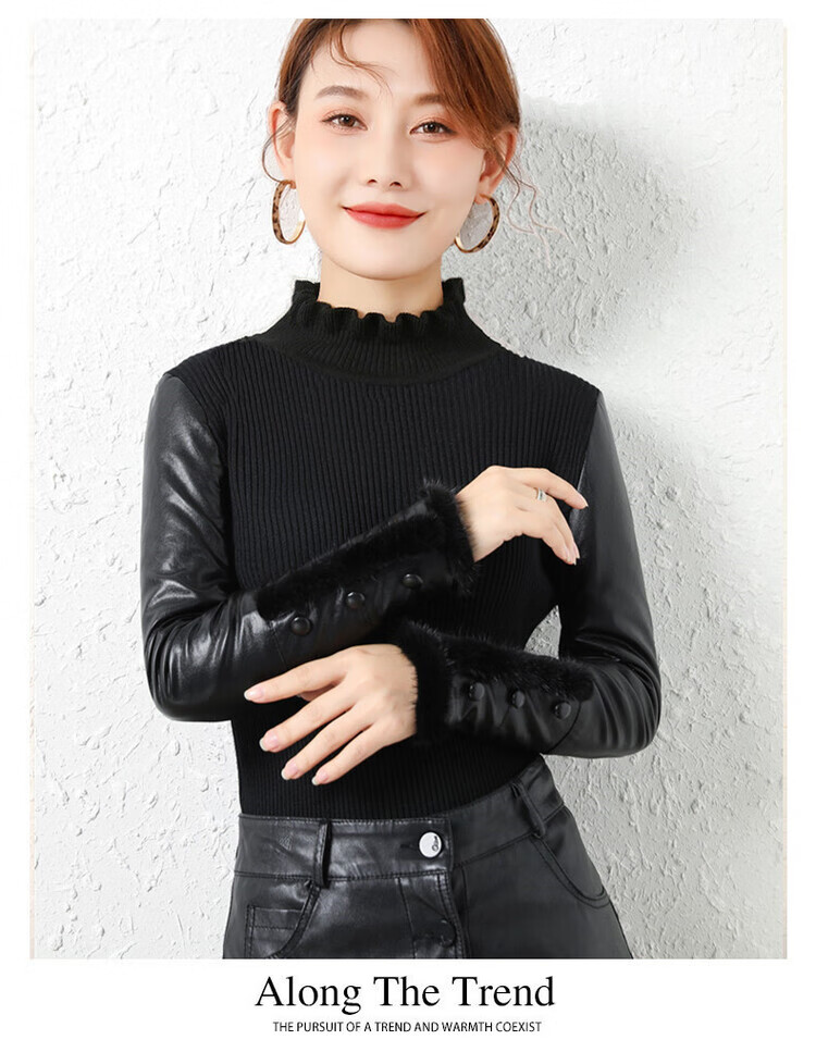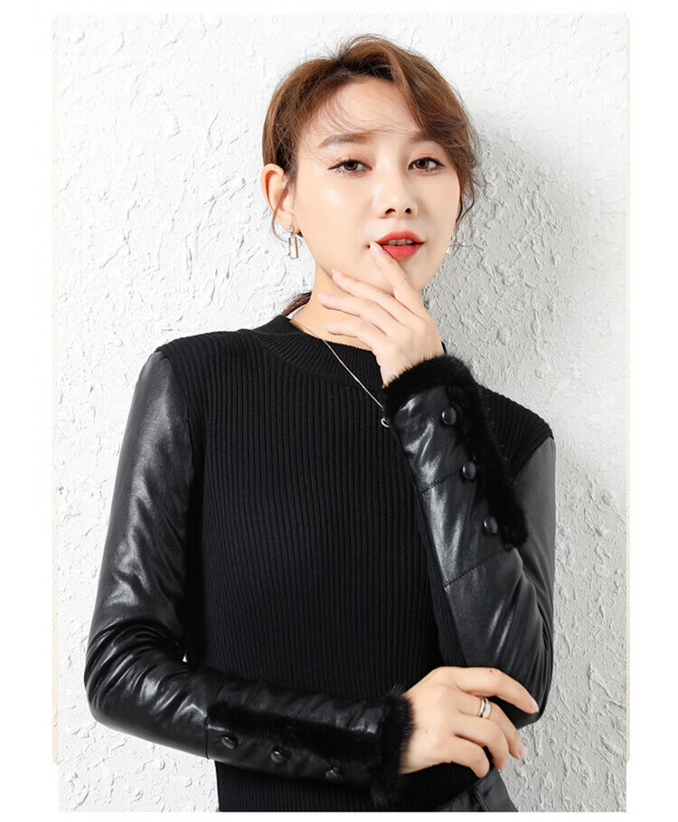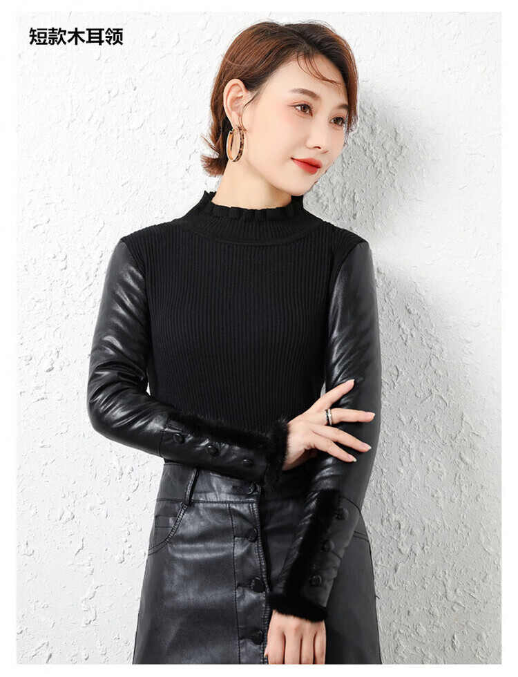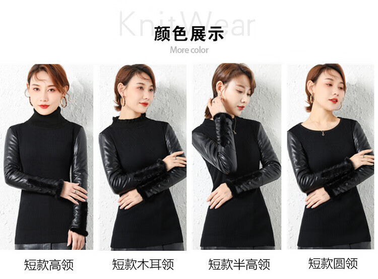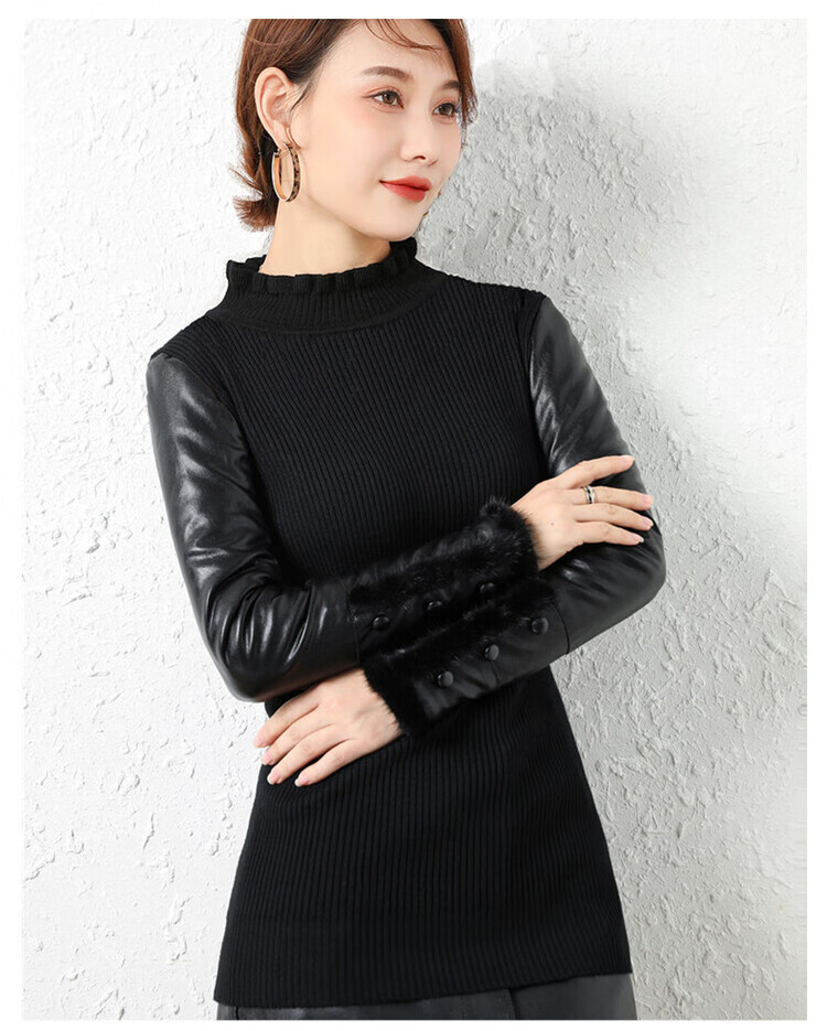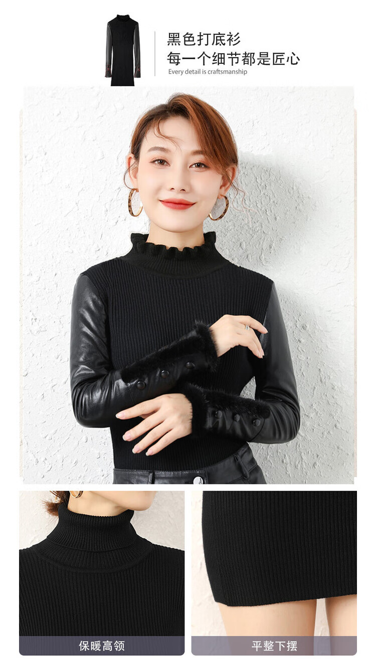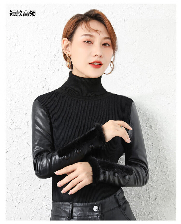 CARSEMKEITN Leather Sleeve Bottoming Shirt Women's Winter Slim Fit Plus Velvet Inner Knitted Sweater with Fur Down Cotton Sleeves Versatile Thickened Sweater Short Turtle Collar Velvet Sleeves S Recommended 80-95 Jin Jin equals 0.5 kg