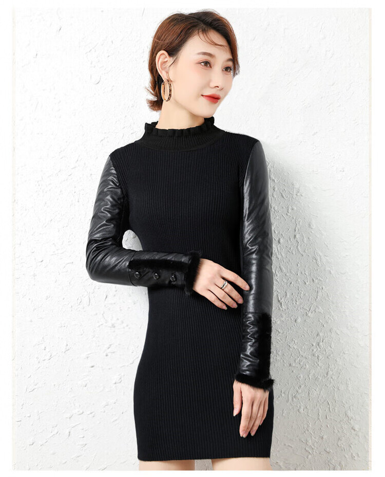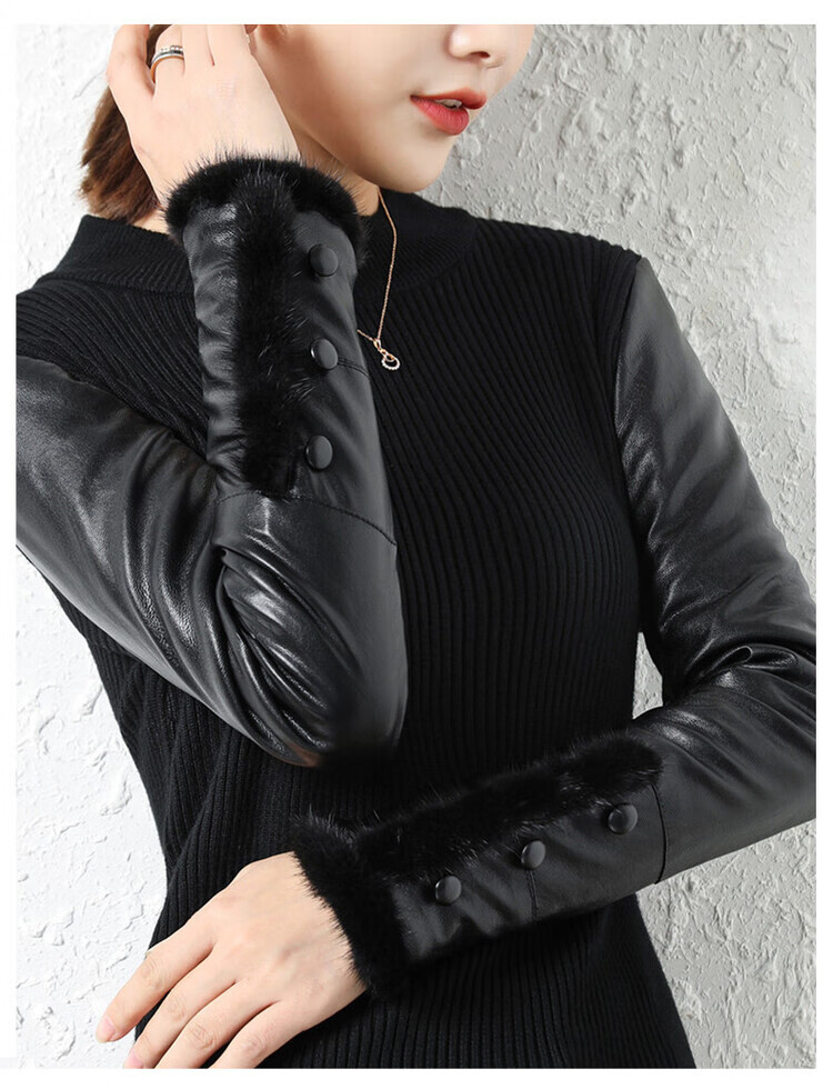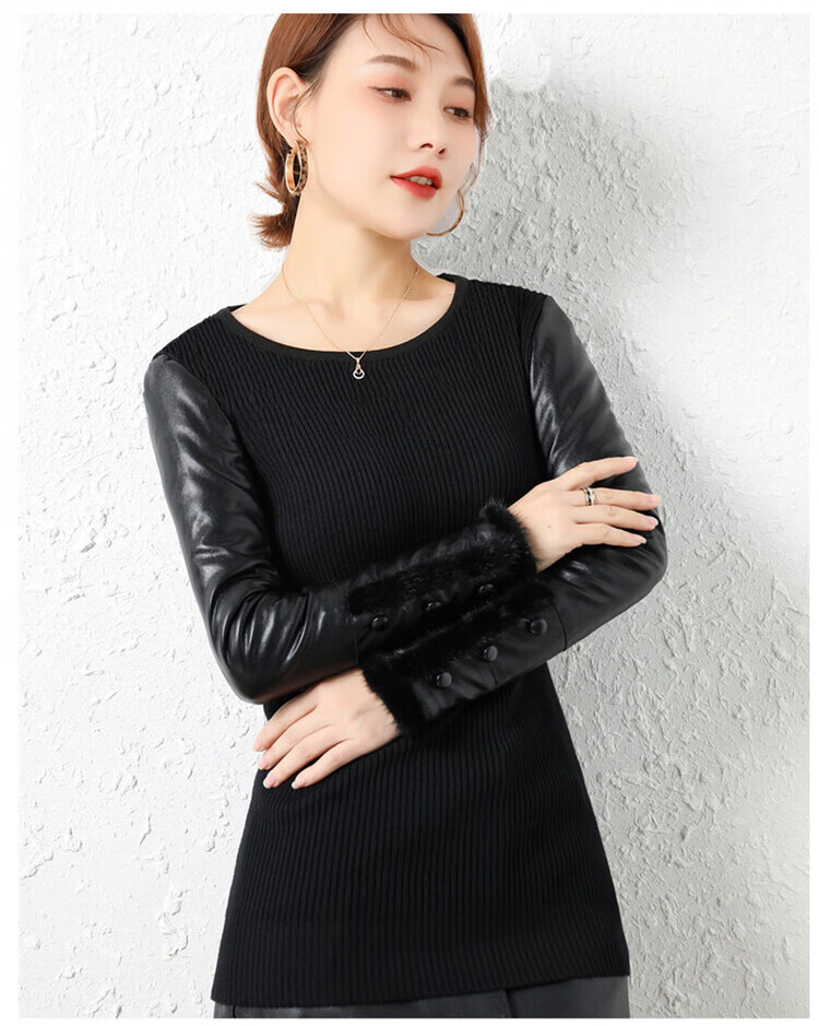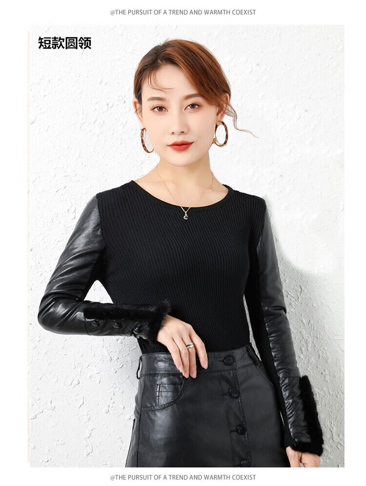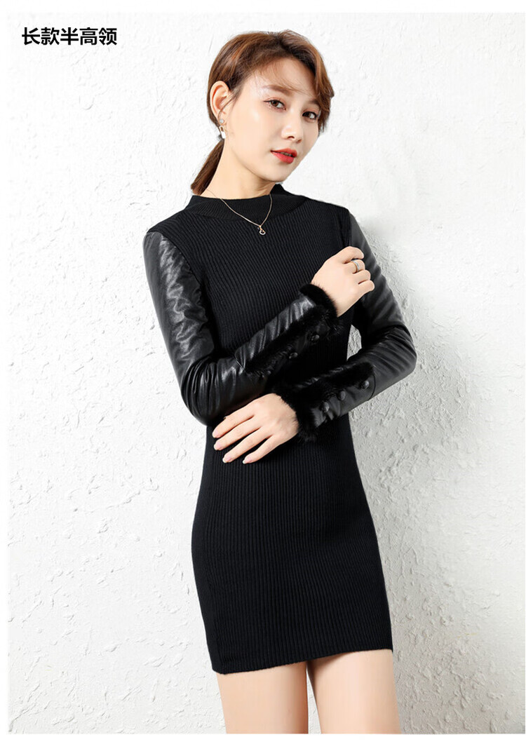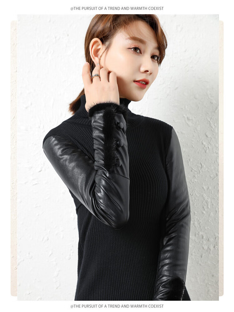 CARSEMKEITN Leather Sleeve Bottoming Shirt Women's Winter Slim Fit Plus Velvet Inner Knitted Sweater with Fur Down Cotton Sleeves Versatile Thickened Sweater Short Turtle Collar Velvet Sleeves S Recommended 80-95 Jin Jin equals 0.5 kg