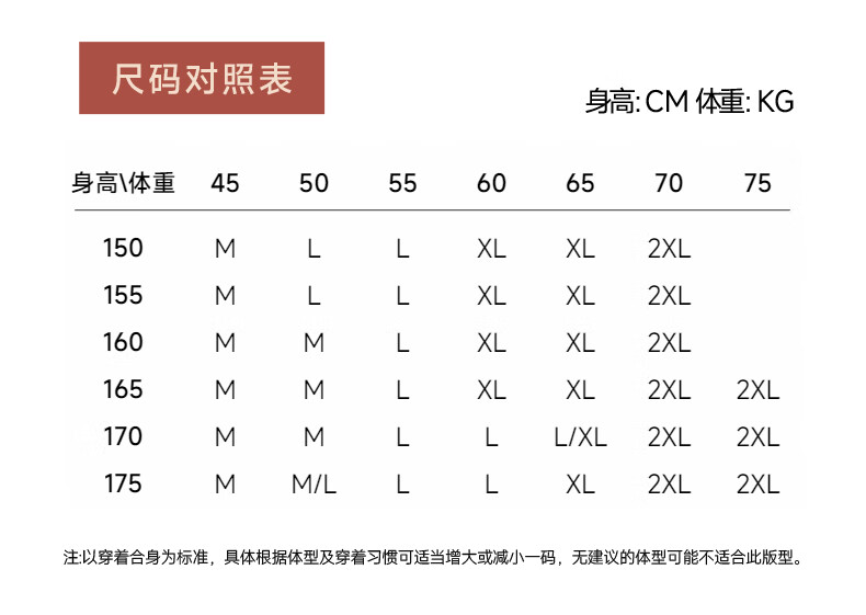 China (cm) 160-165/84-86 165-170 / 88-90 167-172 / 92-96 168-173 / 98-102 170-176 / 106-110