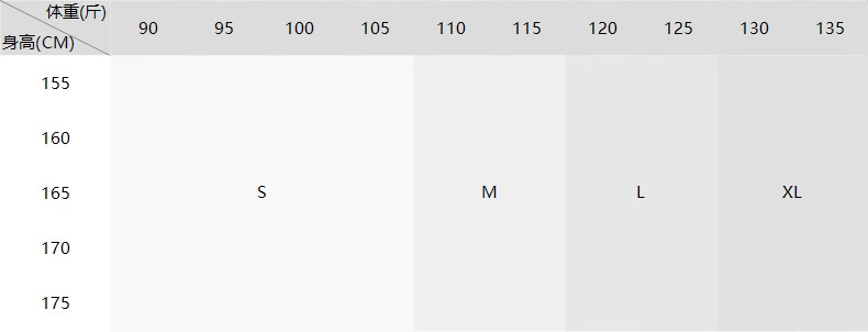 China (cm) 160-165/84-86 165-170 / 88-90 167-172 / 92-96 168-173 / 98-102 170-176 / 106-110
