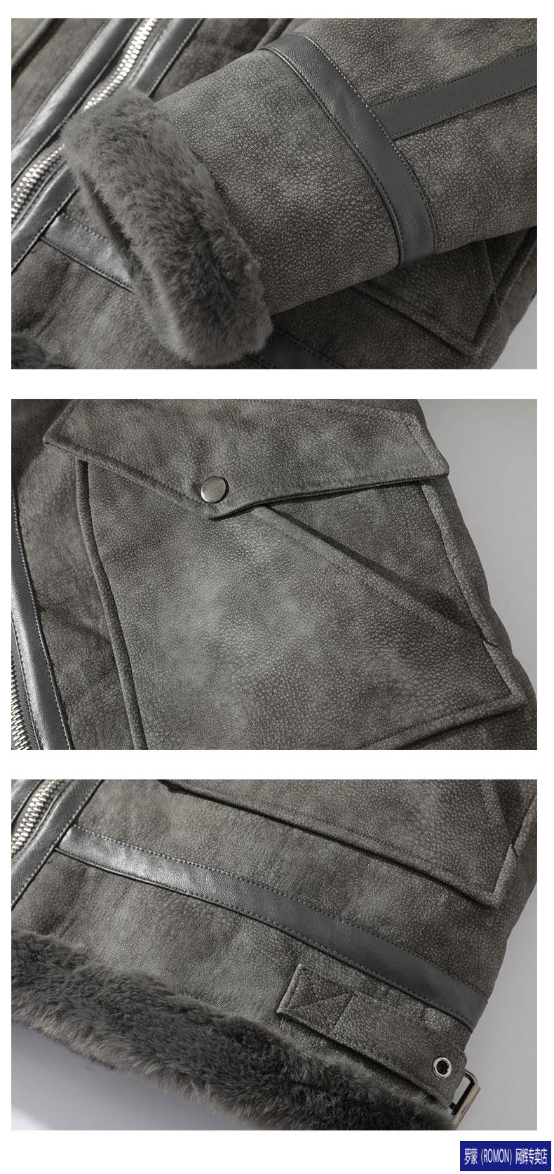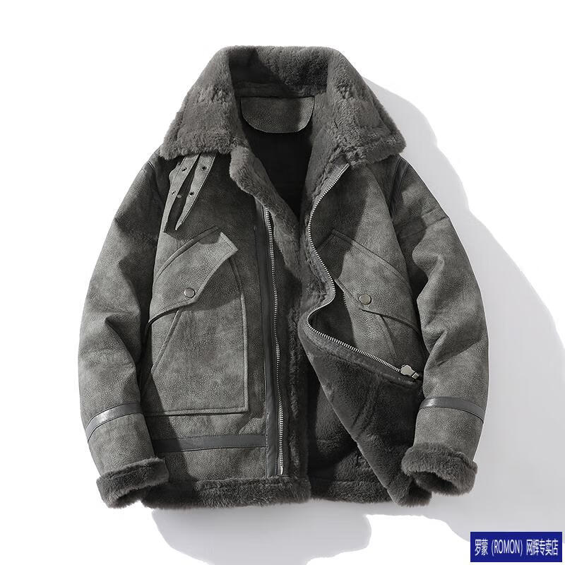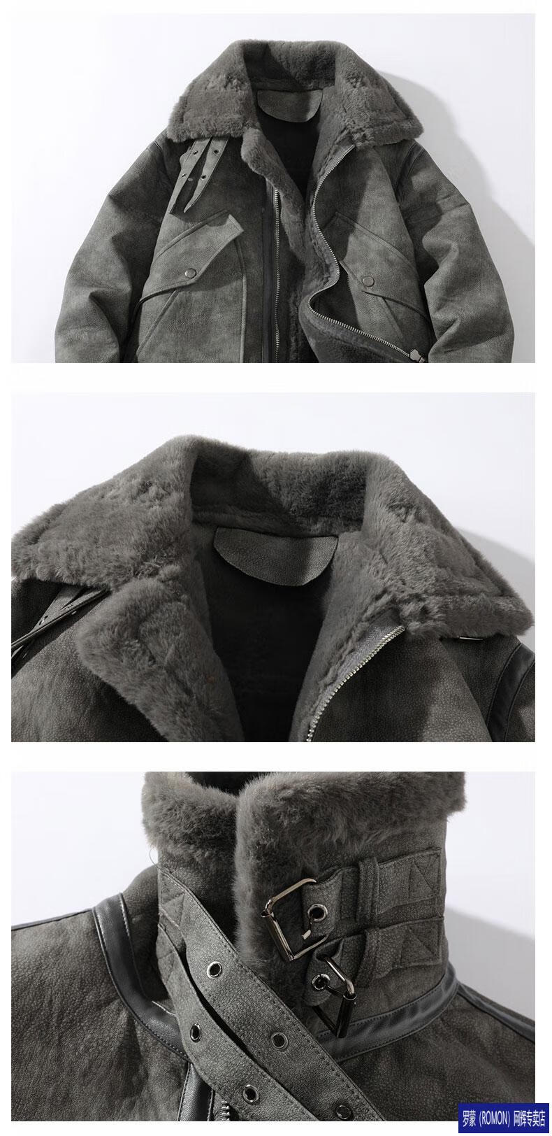 ROMON fur integrated men's winter large size velvet thickened leather jacket short motorcycle jacket leather jacket men's lamb wool jacket gray M
