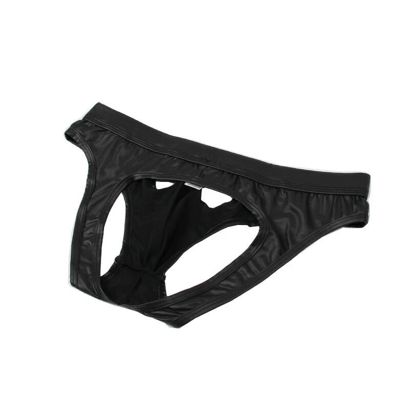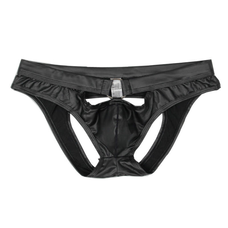 Men's underwear, imitation leather, double thong briefs, sexy patent leather youth stage performance briefs, black M