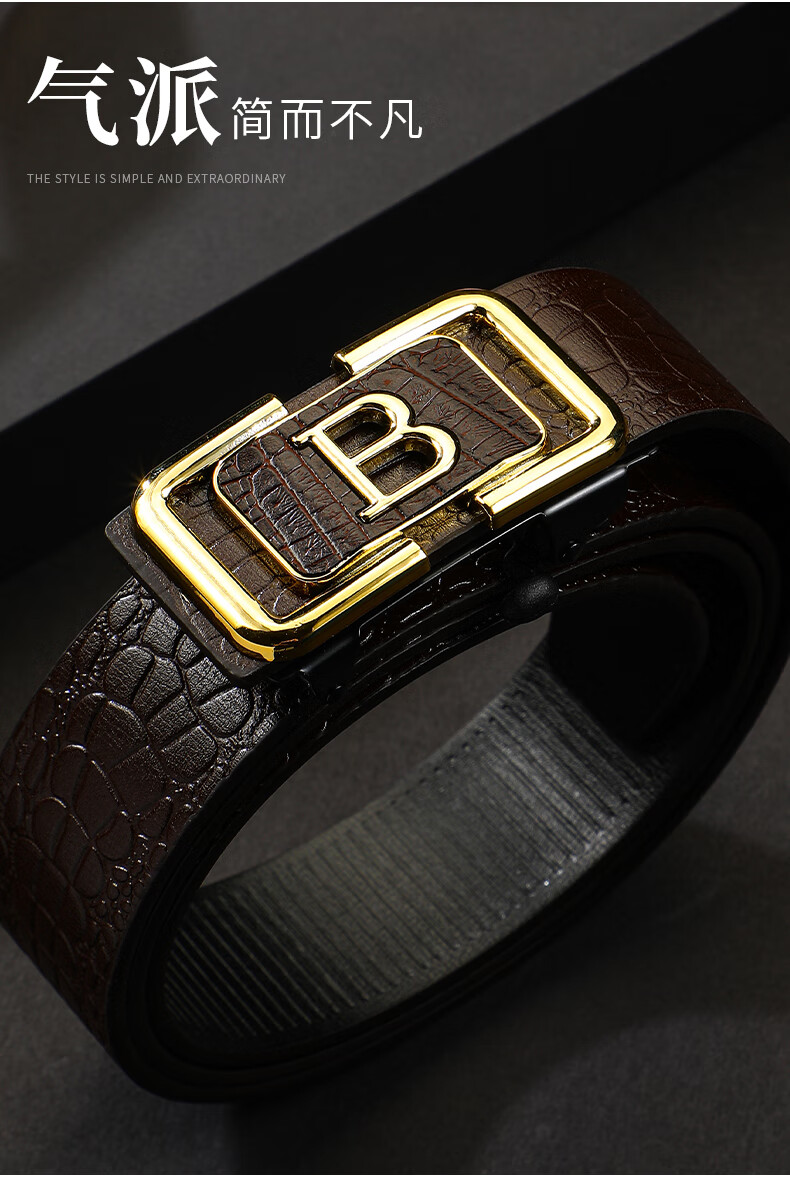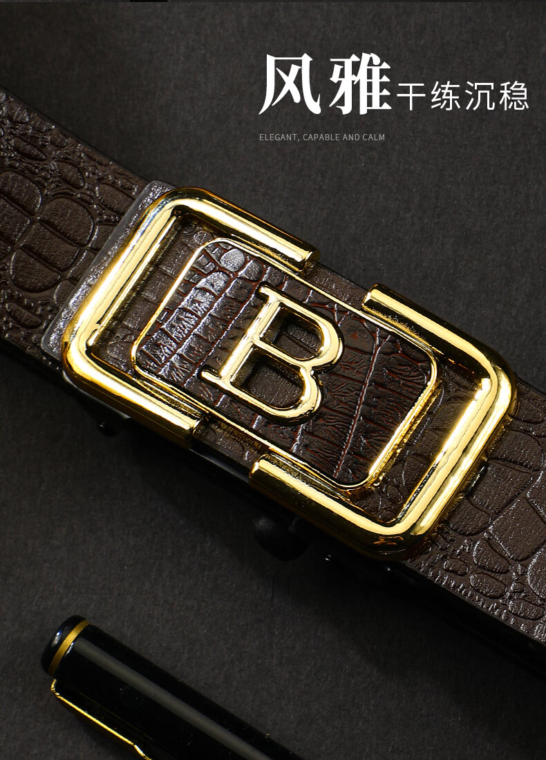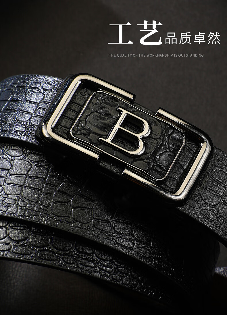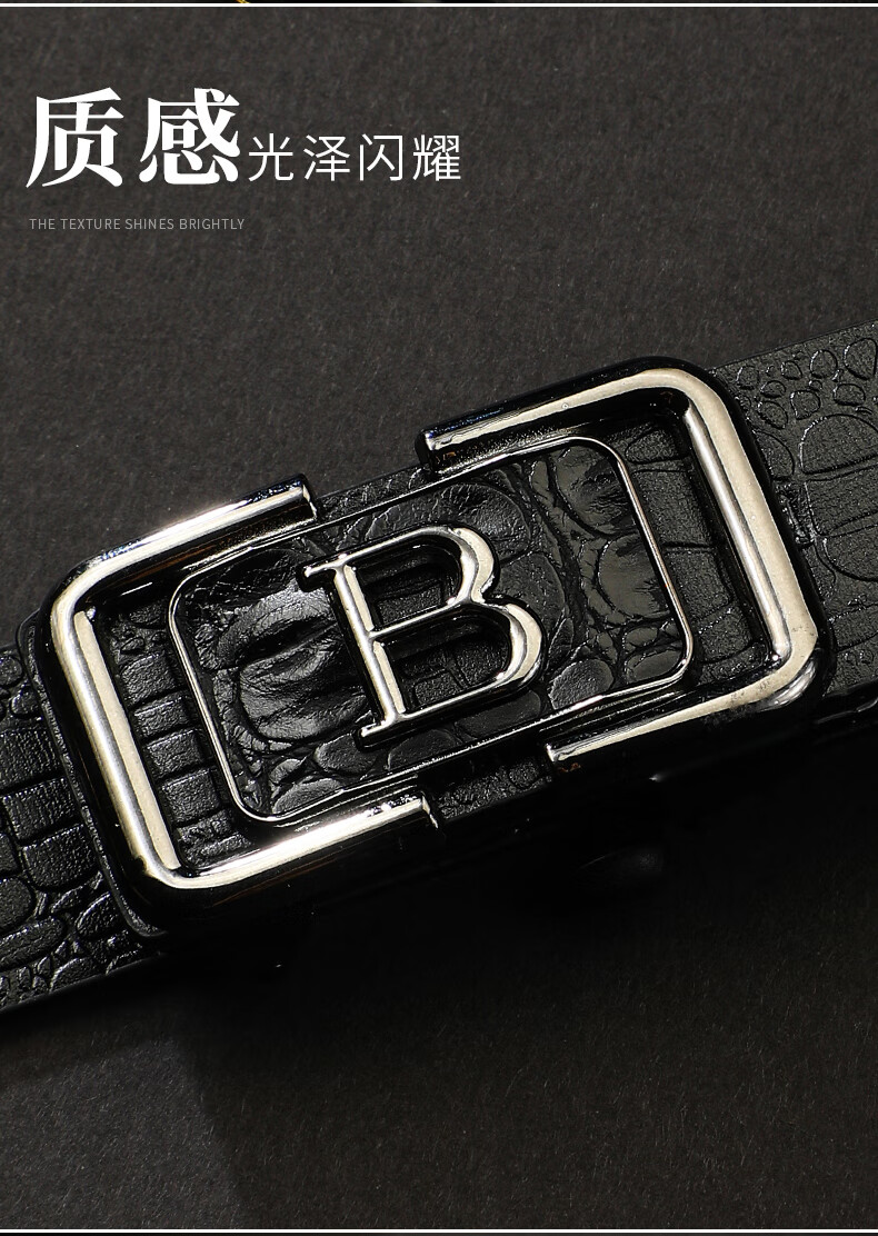 Men's belt crocodile pattern belt toothless automatic buckle letter B young fashion trend versatile casual business black edge black leather crocodile pattern + black crocodile belt 120cm