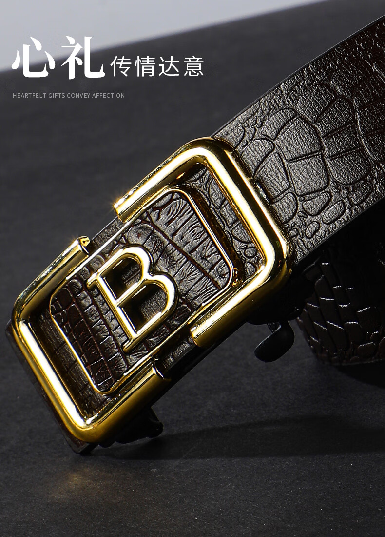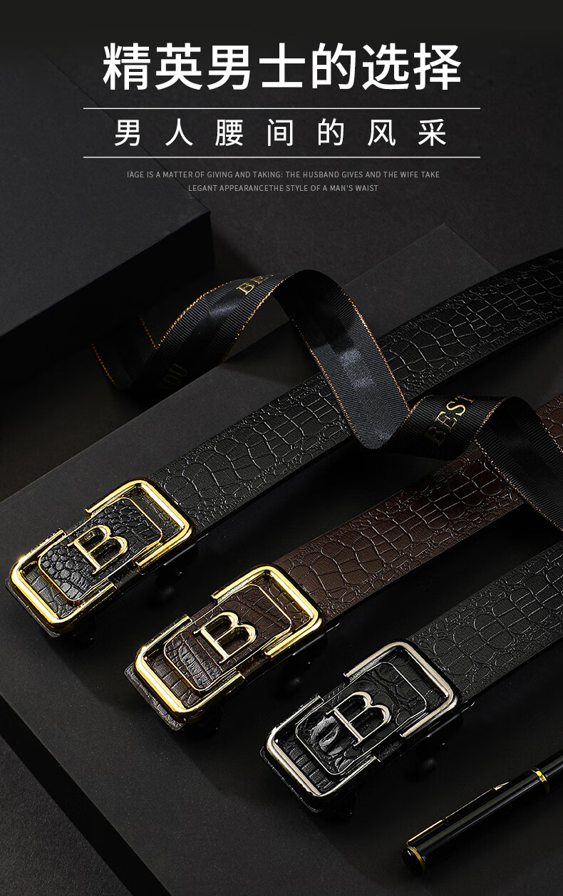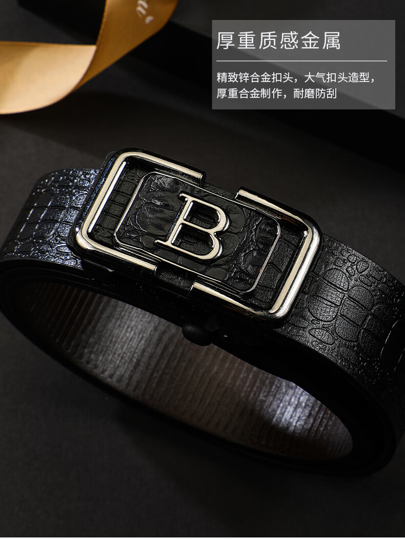 Men's belt crocodile pattern belt toothless automatic buckle letter B young fashion trend versatile casual business black edge black leather crocodile pattern + black crocodile belt 120cm