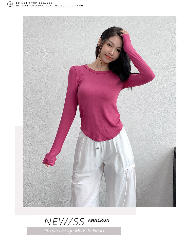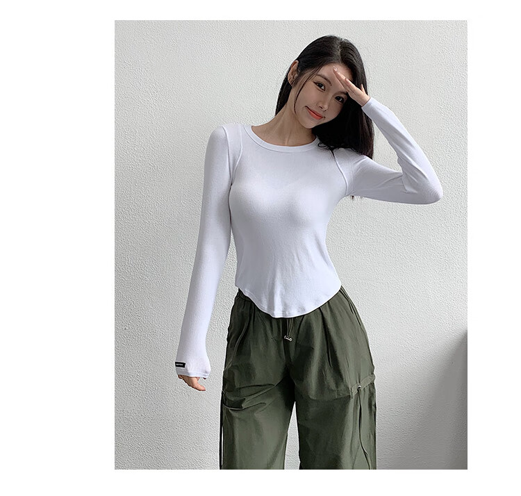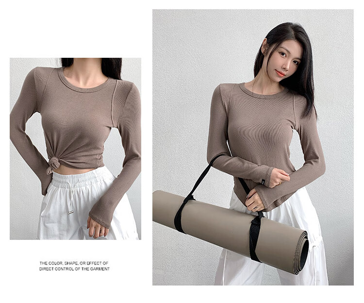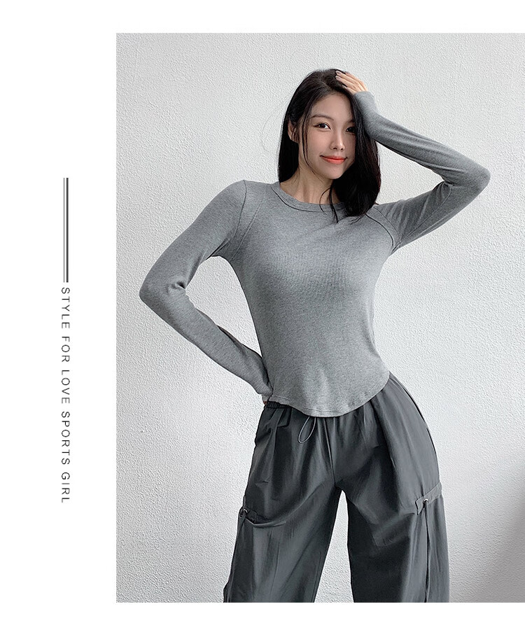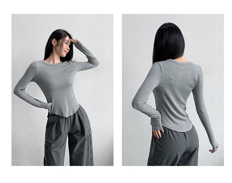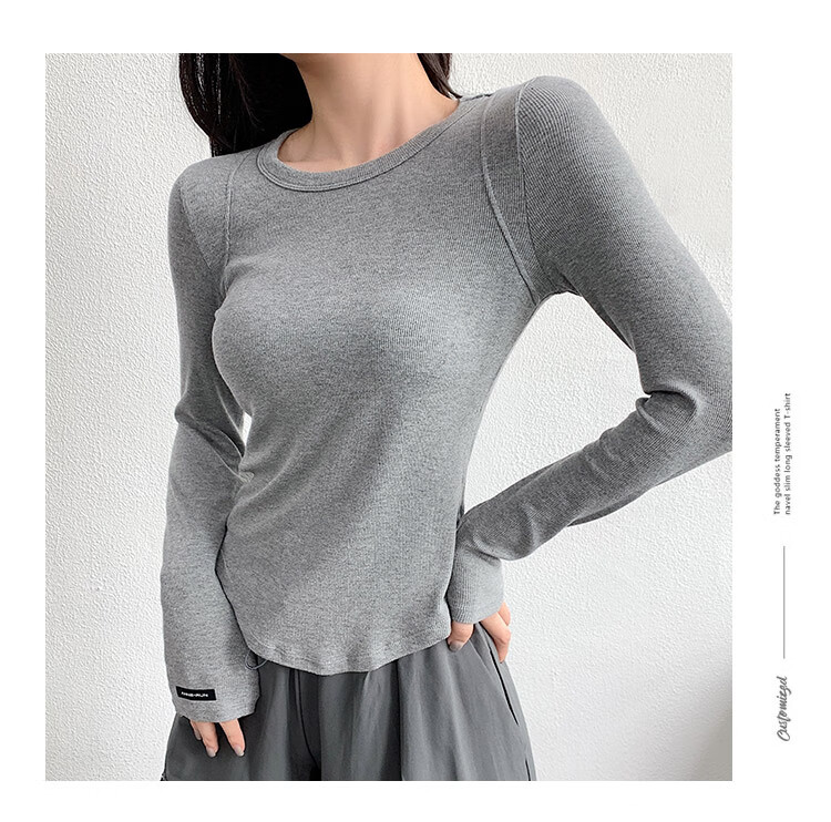 KEJIMITAO European and American ins sports long-sleeved T-shirt women's round neck yoga clothes slim fit breathable fitness Pilates quick-drying top hemp gray S recommended (85-98Jin Jin equals 0.5 kg)