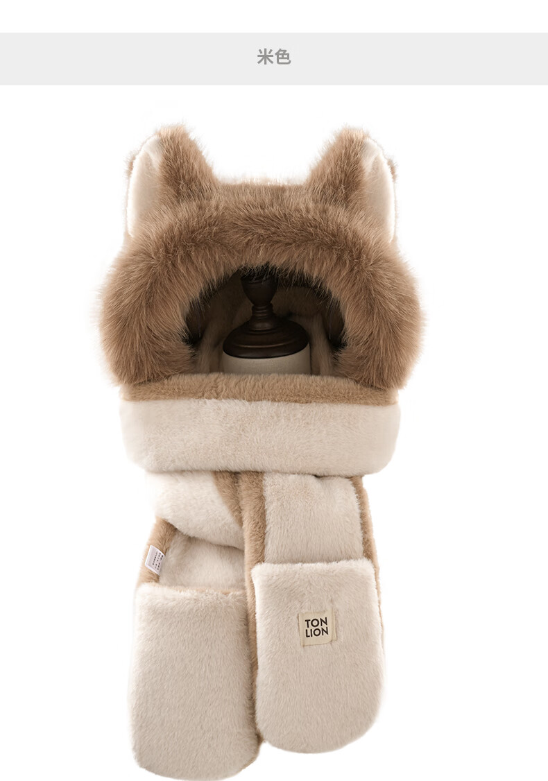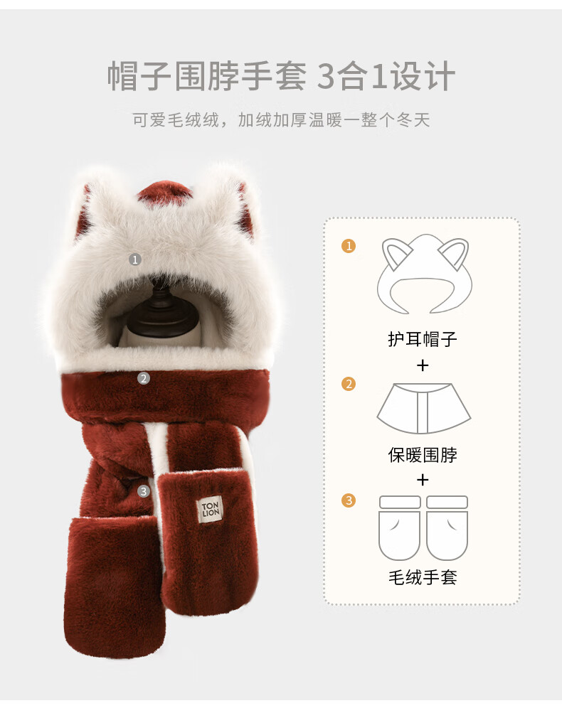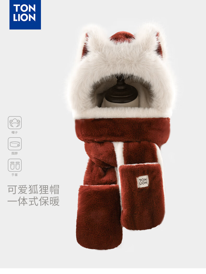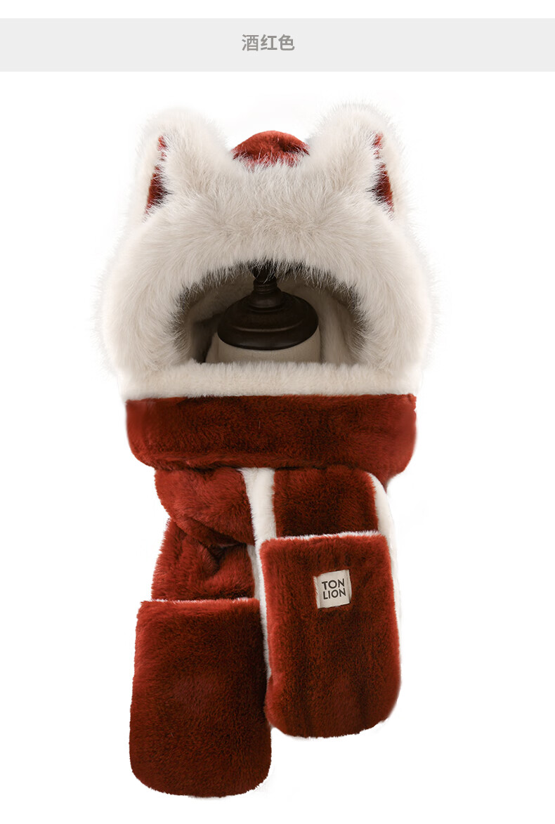 TonLion 2025 New Cute Fox New Year Red Plush Hat Scarf Gloves One-piece Women's Winter Lei Feng Hat Burgundy