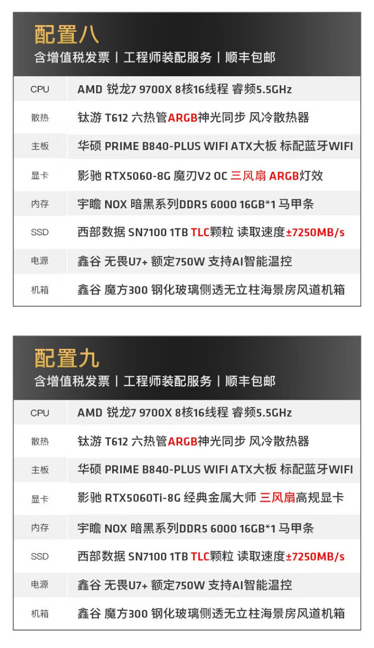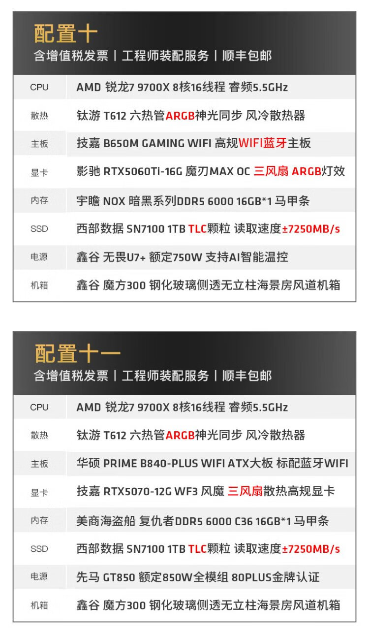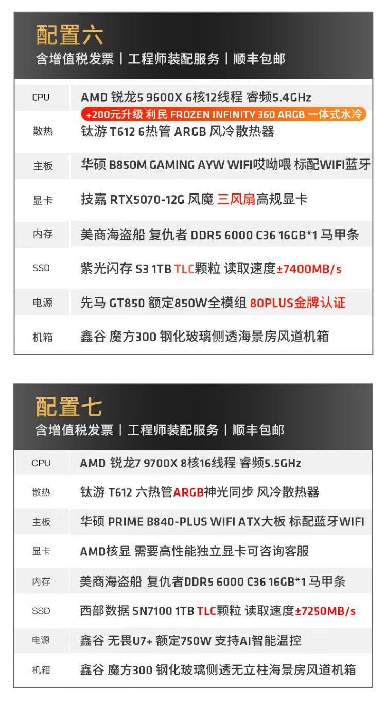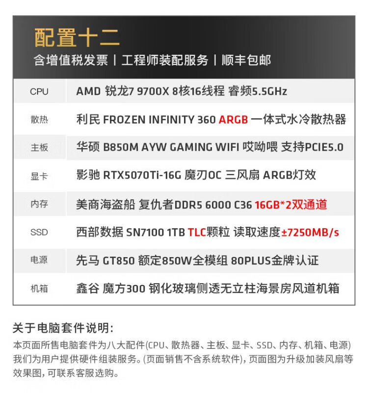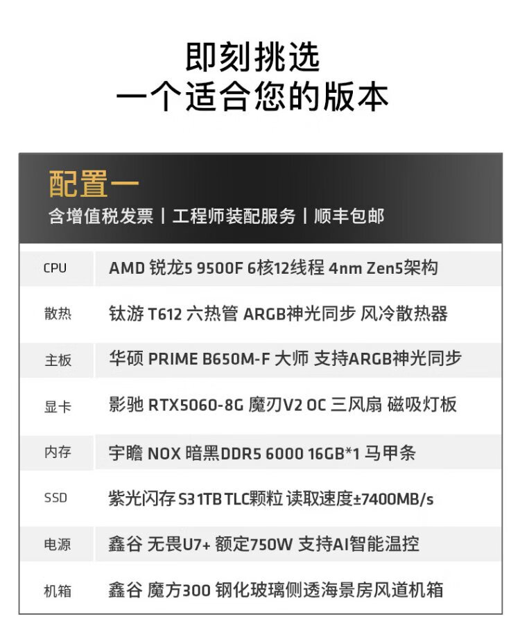 AMD/Lang 9600X/9700X assembled computer 5060/5070 graphics card DIY sea view room game console entertainment live broadcast desktop computer to play the Delta machine configuration ten R7-9700X+RTX5060Ti16G host kit