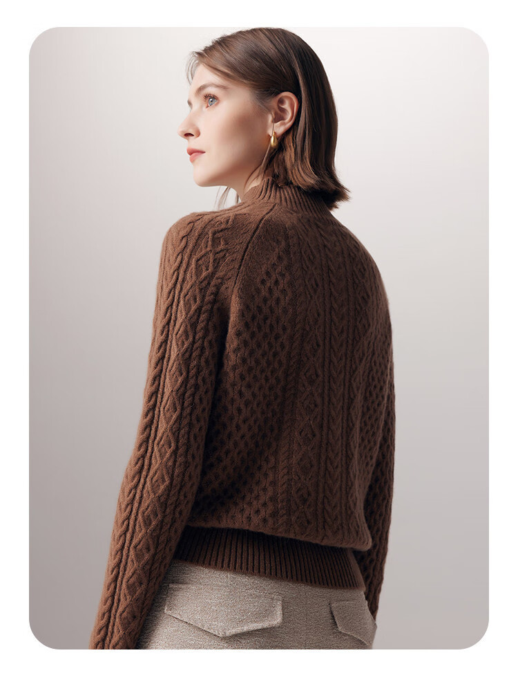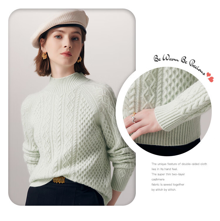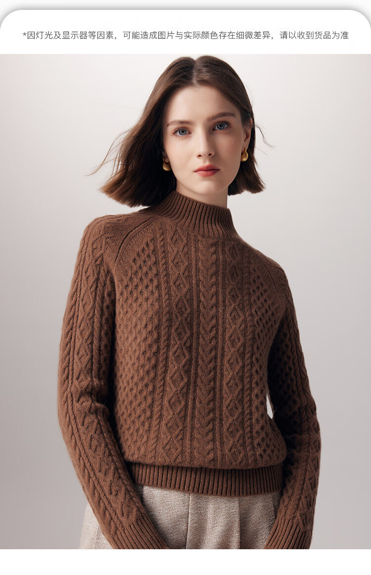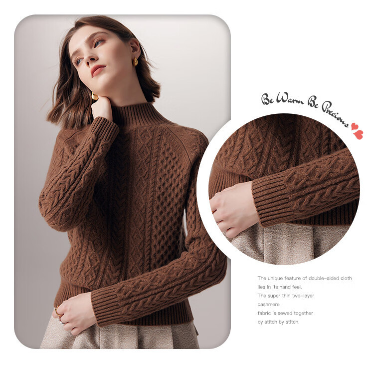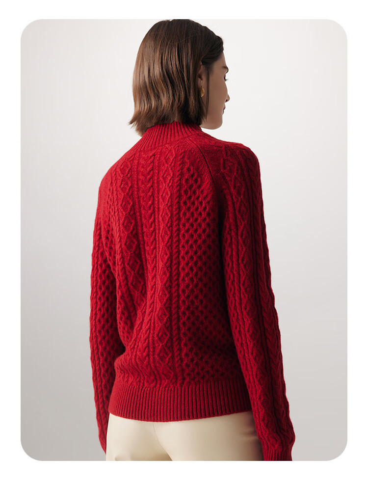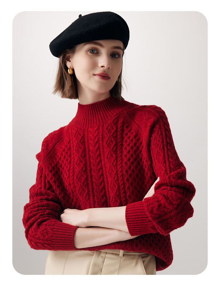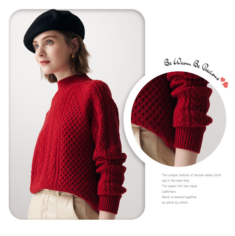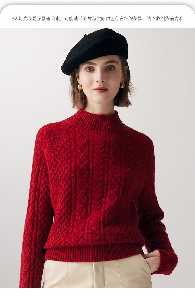 PALUOPO25 winter new solid color half turtleneck cable women's pure cashmere sweater pullover warm sweater ET20067R bright red clip flower M (100)
