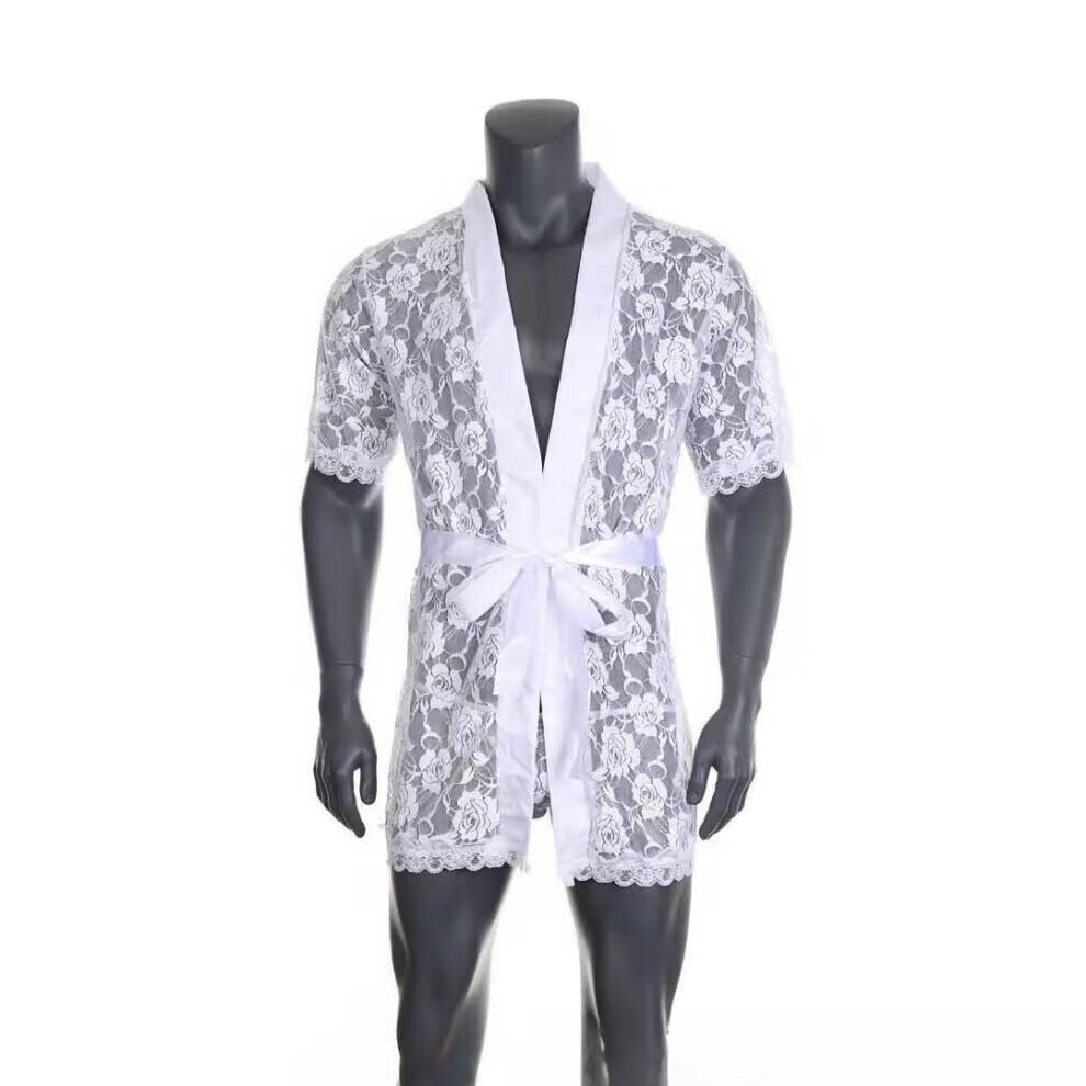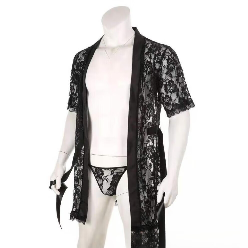 Boys Men's Sexy Nightgown Super Sexy Lace Transparent Thong Bathrobe Lounge Suit 2XL Black