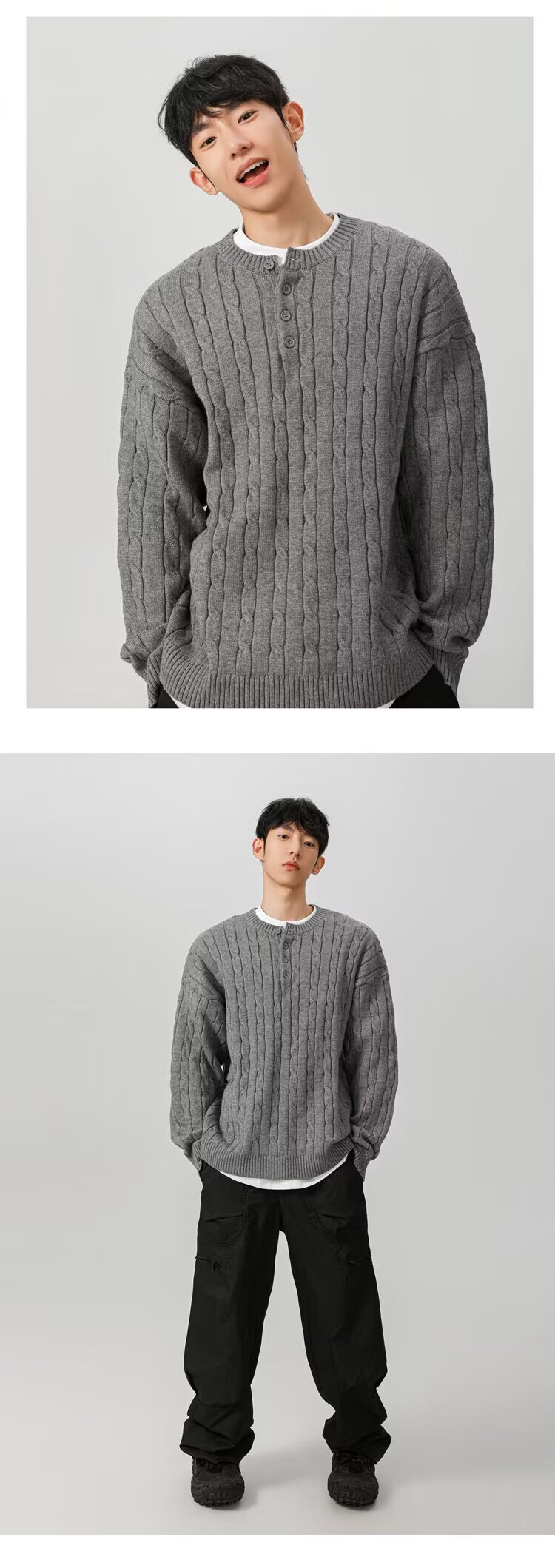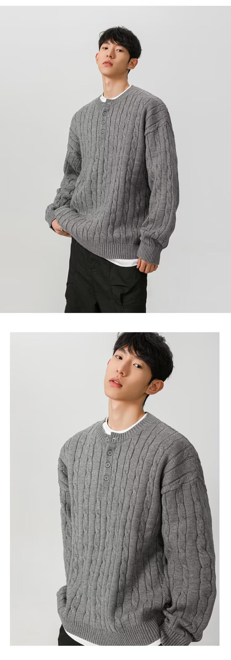 American Henry Collar Sweater Men's Autumn and Winter Cleanfit Loose Lazy Twist Knit Sweater with Bottoming Top Gray XL