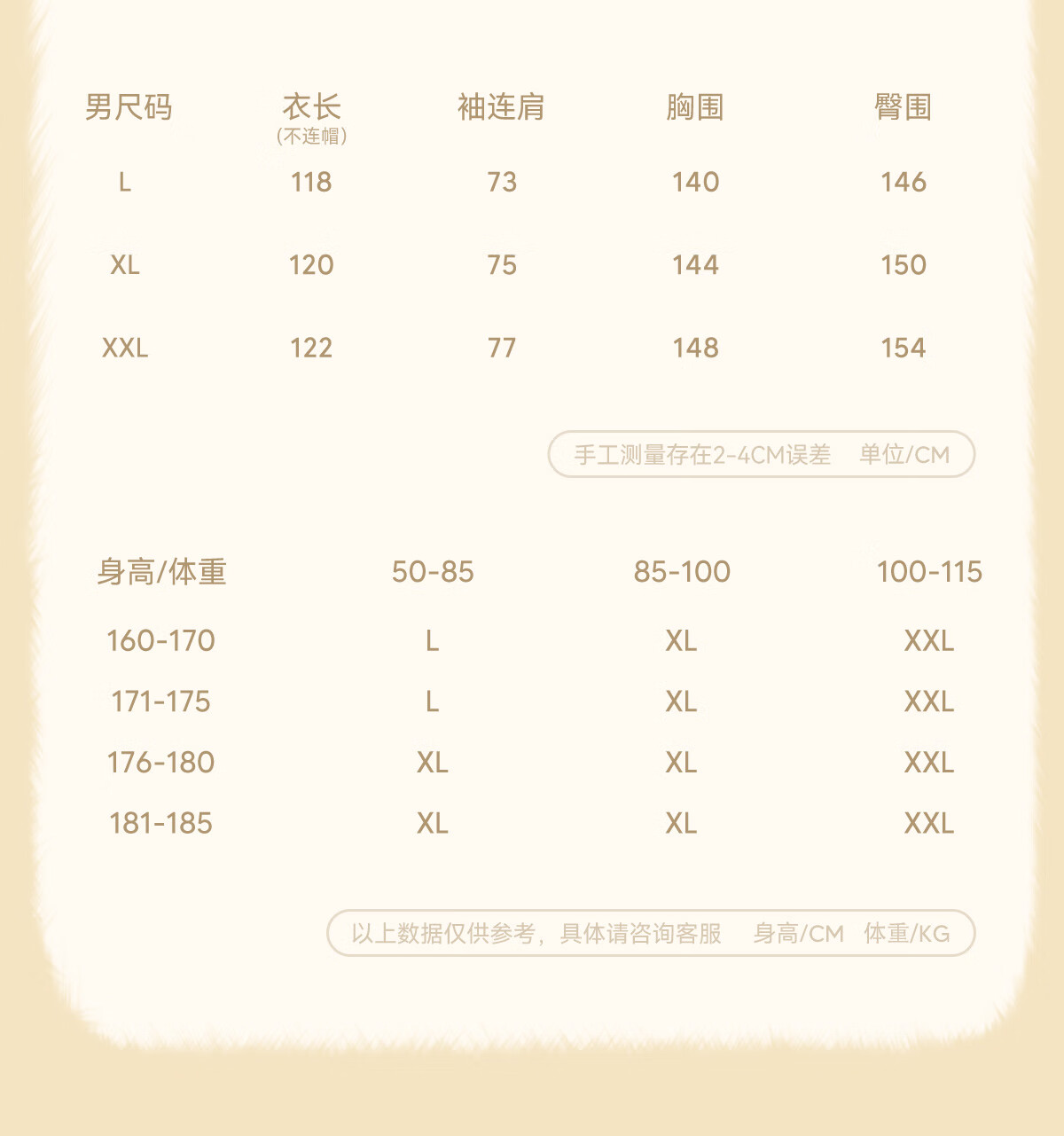 China (cm) 165 / 88-90 170 / 96-98 175 / 108-110 180 / 118-122 185 / 126-130