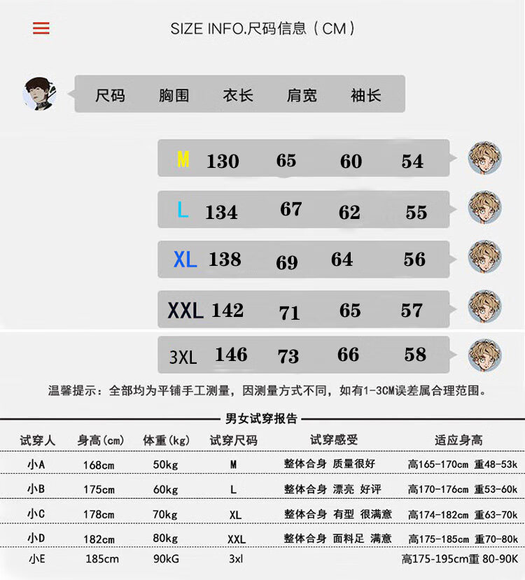 China (cm) 160-165/84-86 165-170 / 88-90 167-172 / 92-96 168-173 / 98-102 170-176 / 106-110