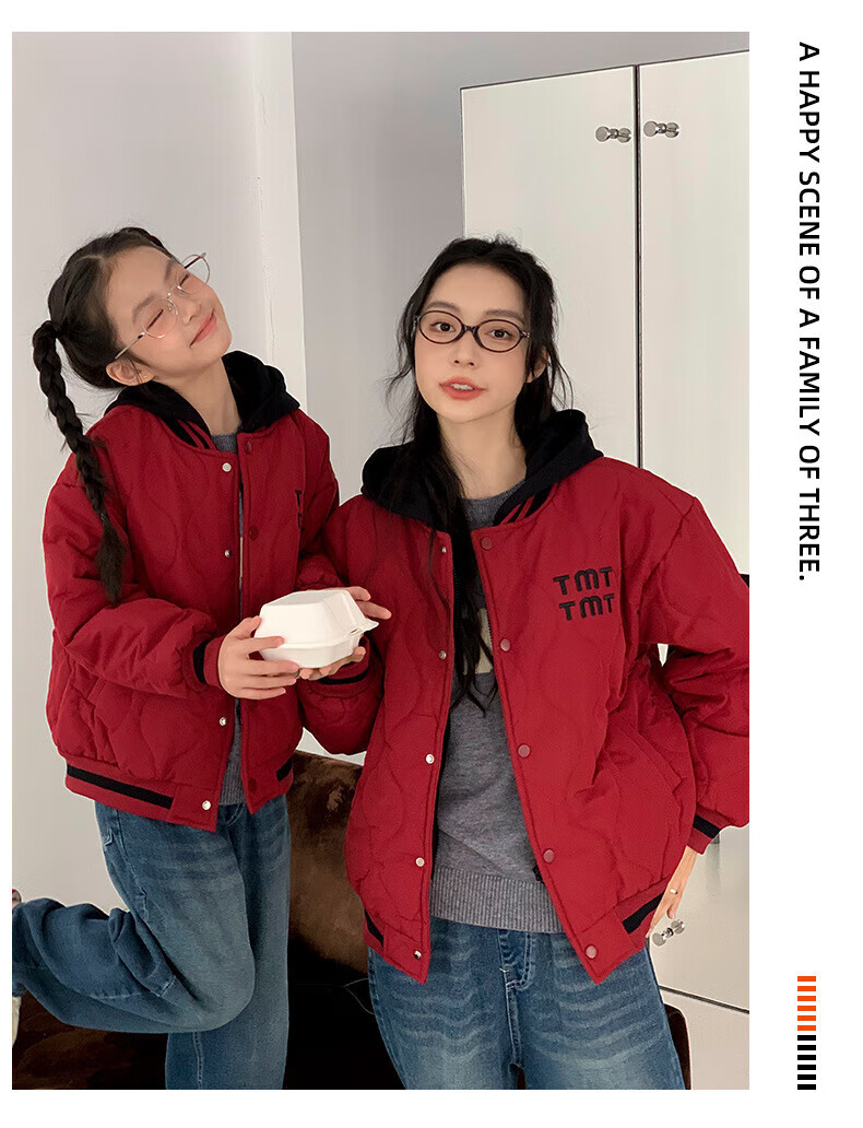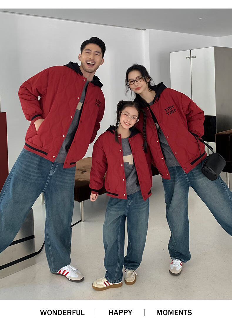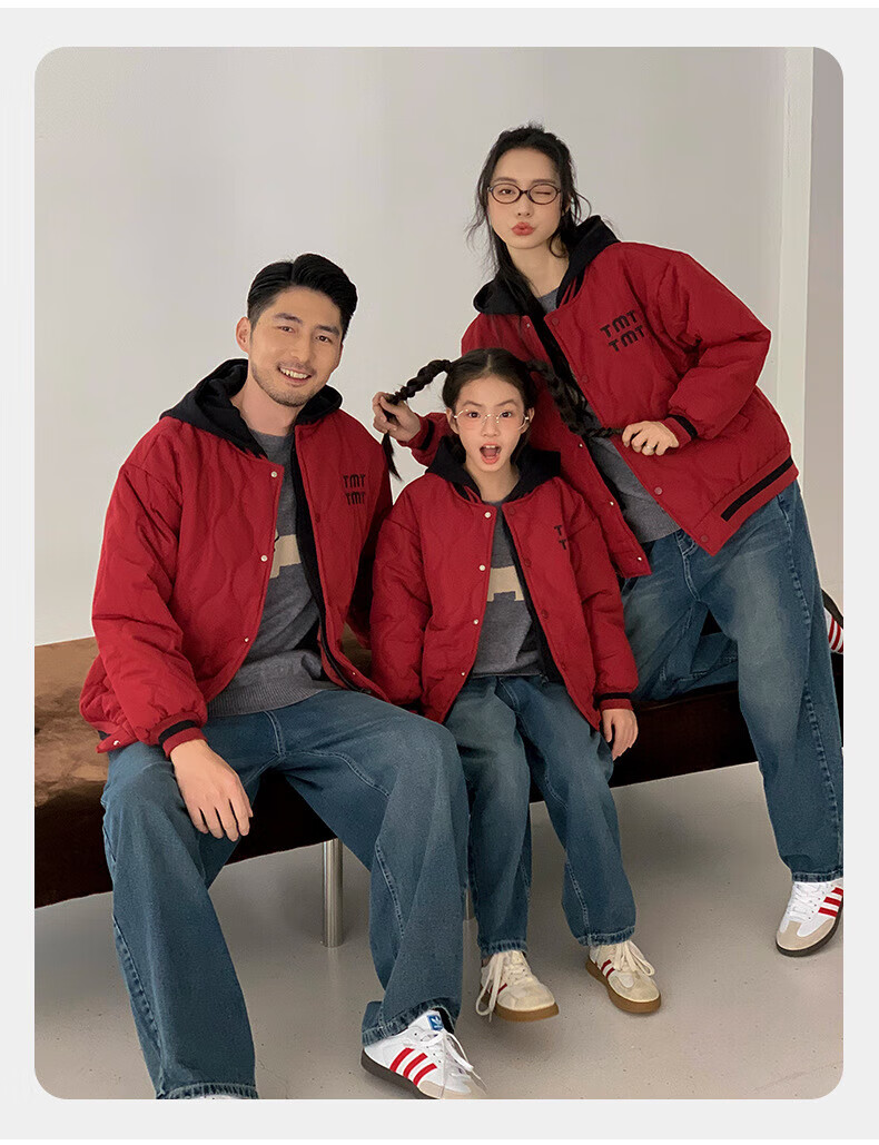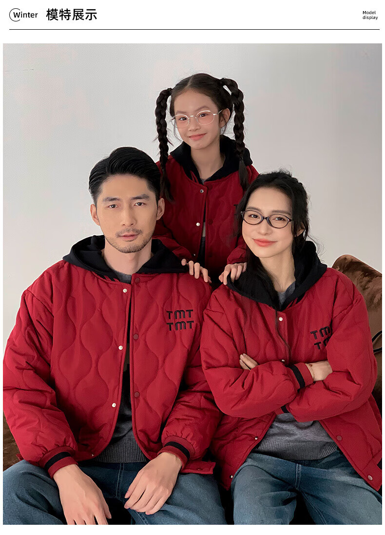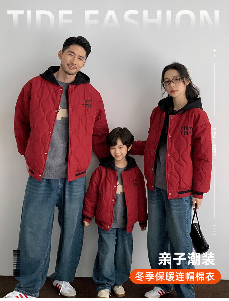 Jiaojing family of three parent-child clothing winter cotton clothes New Year red winter casual hooded four mother and son mother and daughter style warm and burgundy Korean version style 140 Height 135-145cm/Weight 50-60 Jin Jin is equal to 0.5 kg