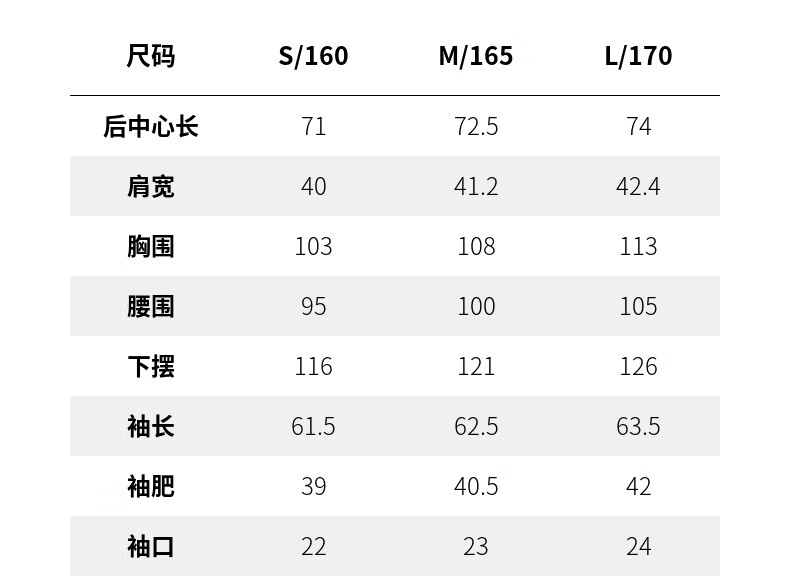 China (cm) 160-165/84-86 165-170 / 88-90 167-172 / 92-96 168-173 / 98-102 170-176 / 106-110
