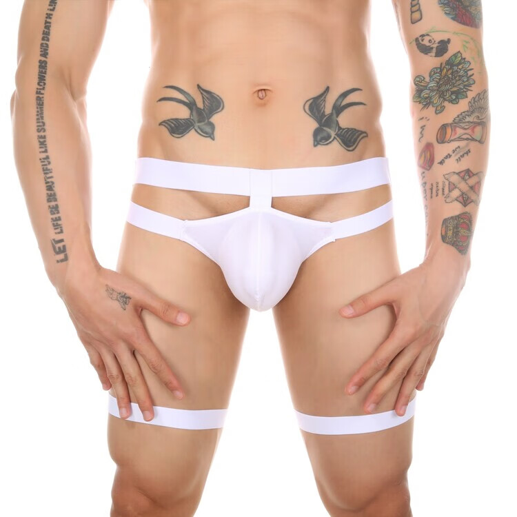 Men's sexy underwear, high-cut thong, gay men's bikini, hollow leg straps, jumpsuit, white M