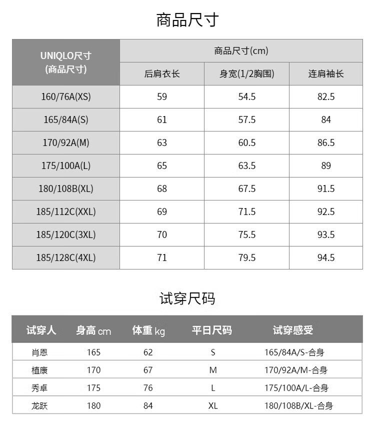 China (cm) 165 / 88-90 170 / 96-98 175 / 108-110 180 / 118-122 185 / 126-130