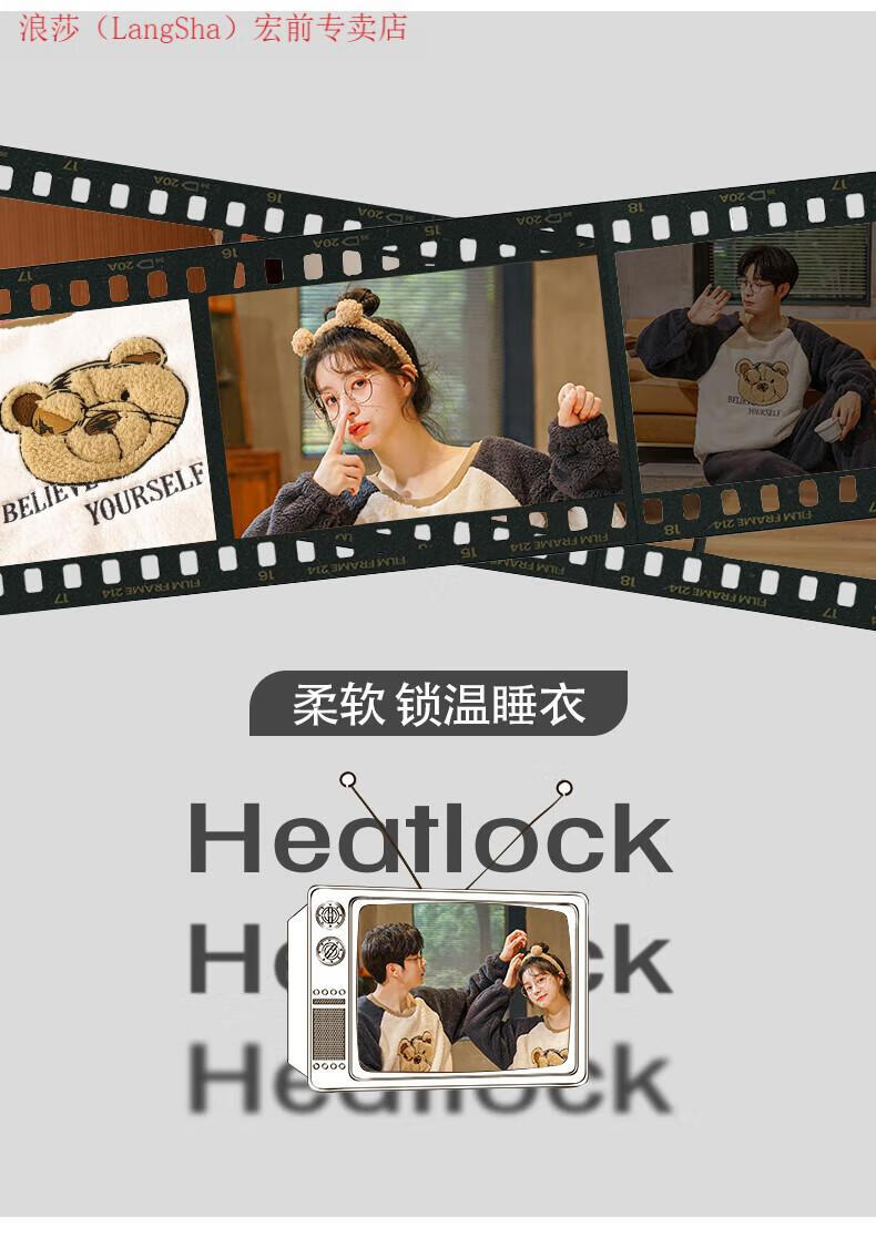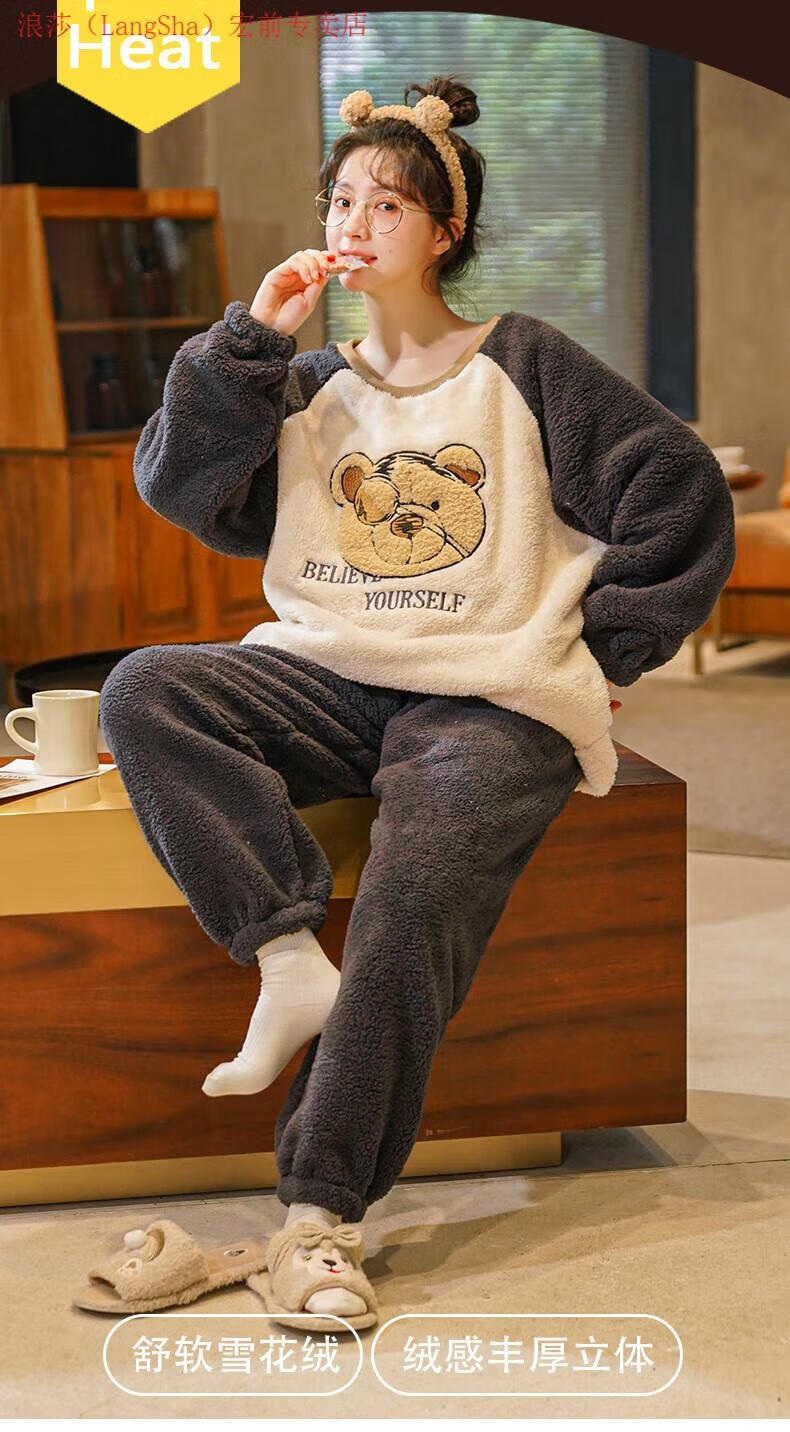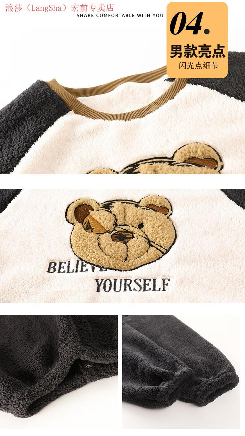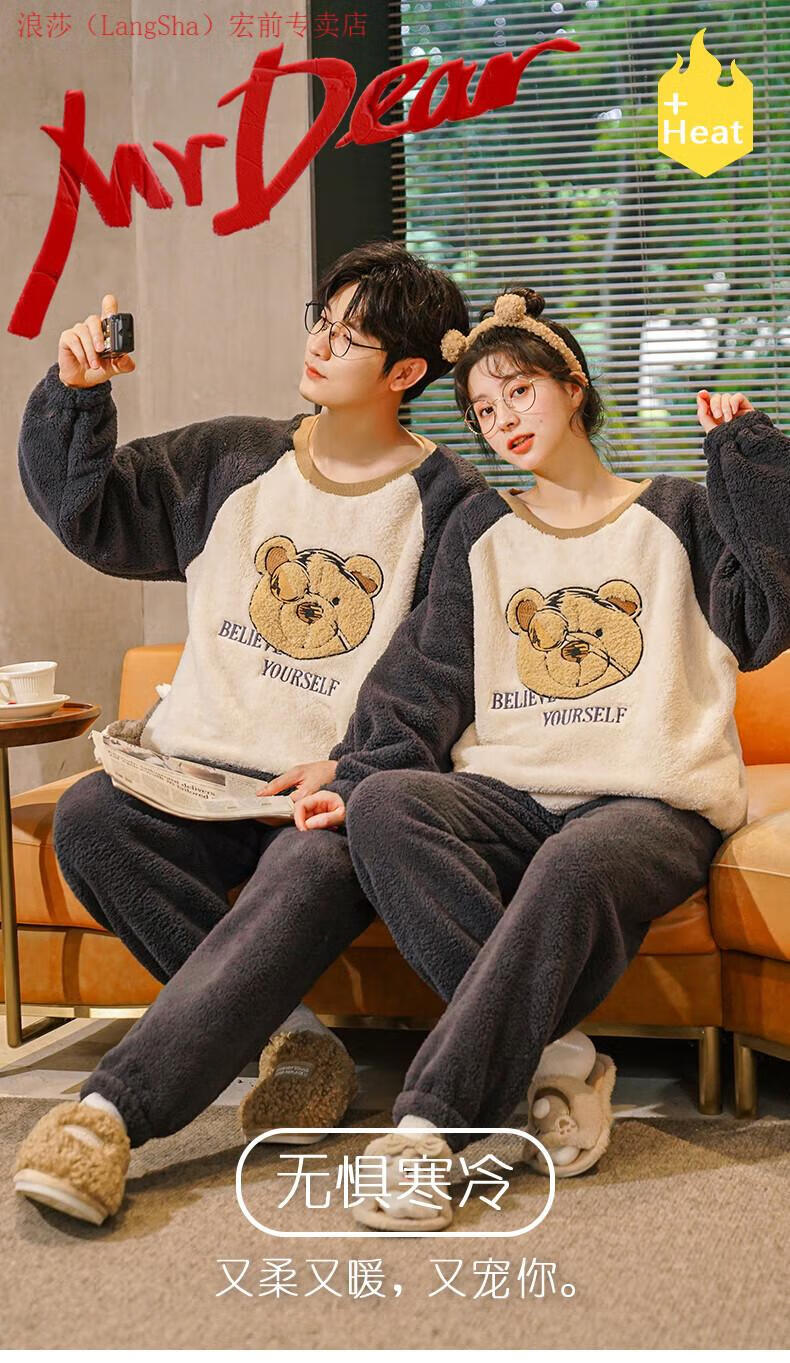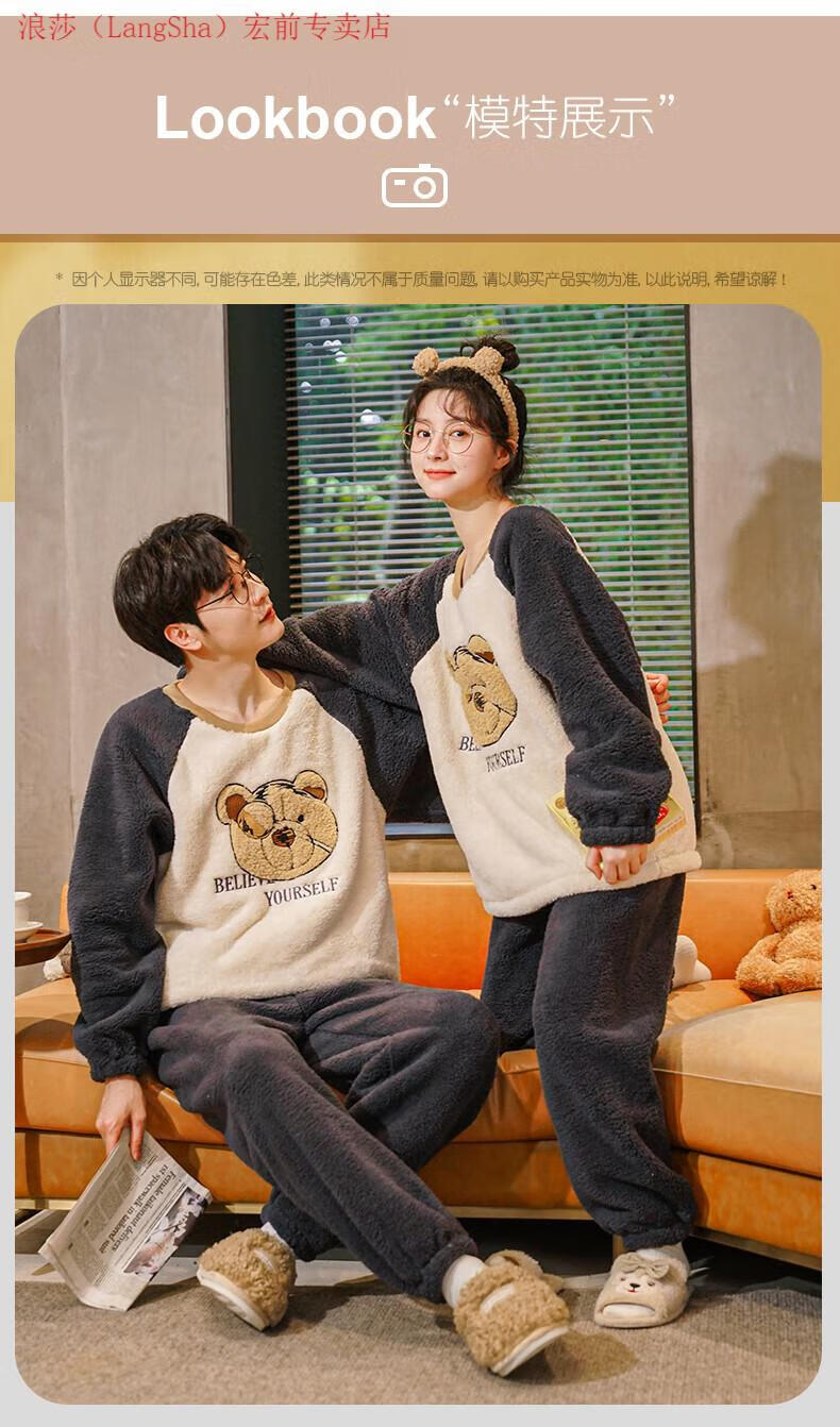 Langsha Autumn and Winter Coral Velvet Pajamas Couple Style Sweet Cartoon Plus Velvet Thickened Winter Men and Women Warm Flannel Suit Coral Velvet Round Neck Suit-HMF7908 2XL Male Recommended 150-170 Jin Jin equals 0.5 kg