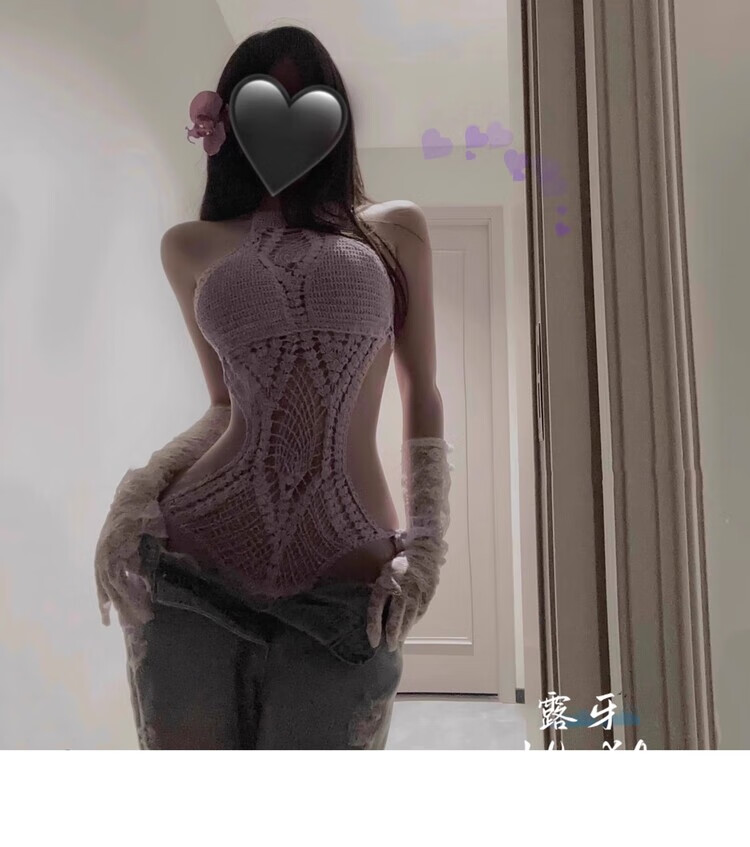 Xing Mei Xian Sexy Pure Desire Fishbone Bra Halter Neck Purple Jumpsuit Handmade Knitted Beautiful Back Sweater Strap Tube Top Women Pink Single Jumpsuit One Size 80-120Jin Jin is equal to about 0.5 kg