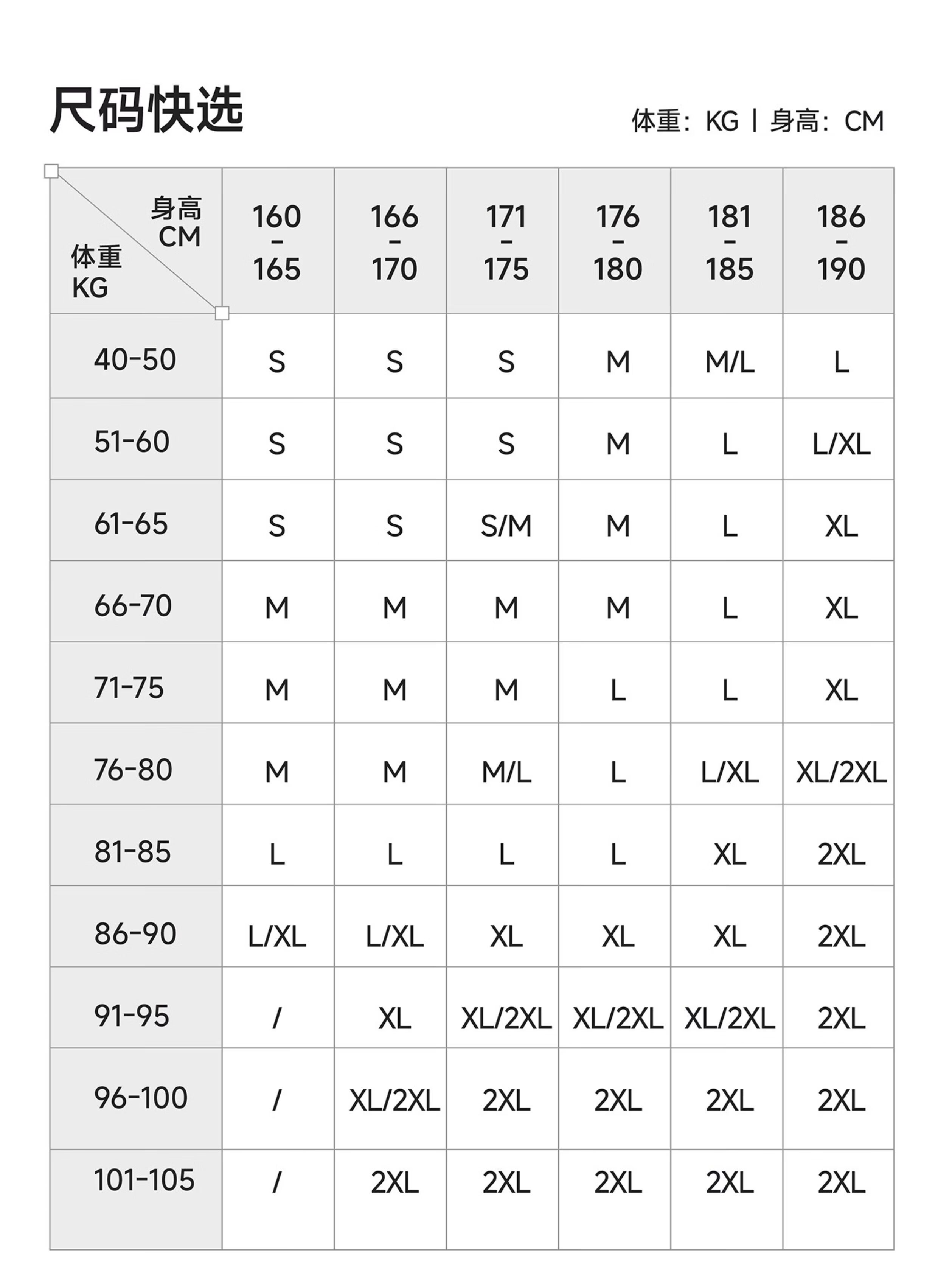 China (cm) 160-165/84-86 165-170 / 88-90 167-172 / 92-96 168-173 / 98-102 170-176 / 106-110
