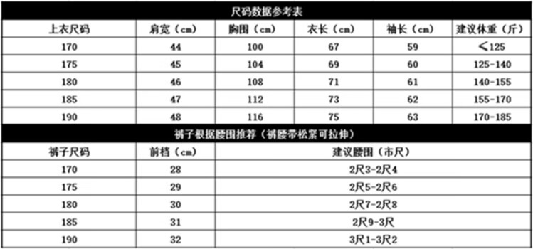 China (cm) 165 / 88-90 170 / 96-98 175 / 108-110 180 / 118-122 185 / 126-130