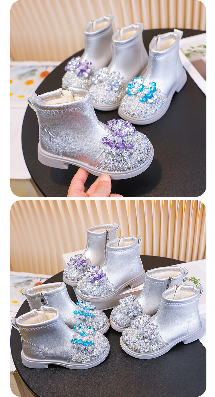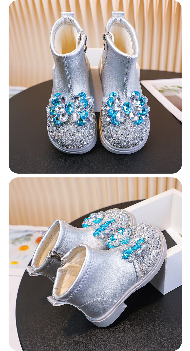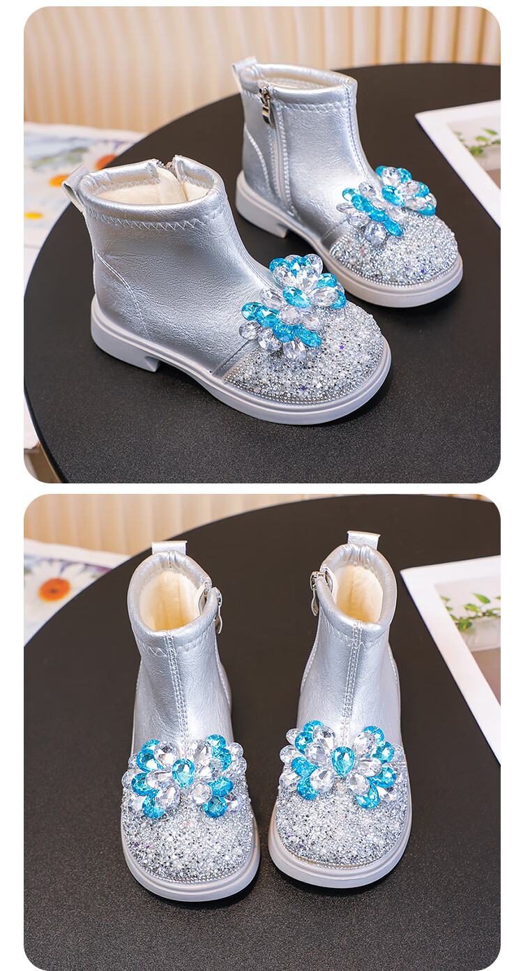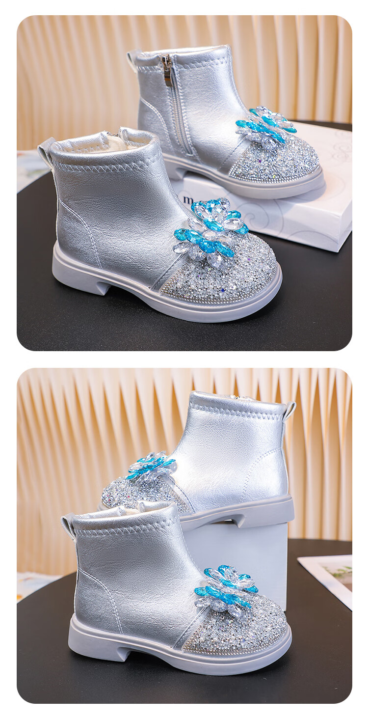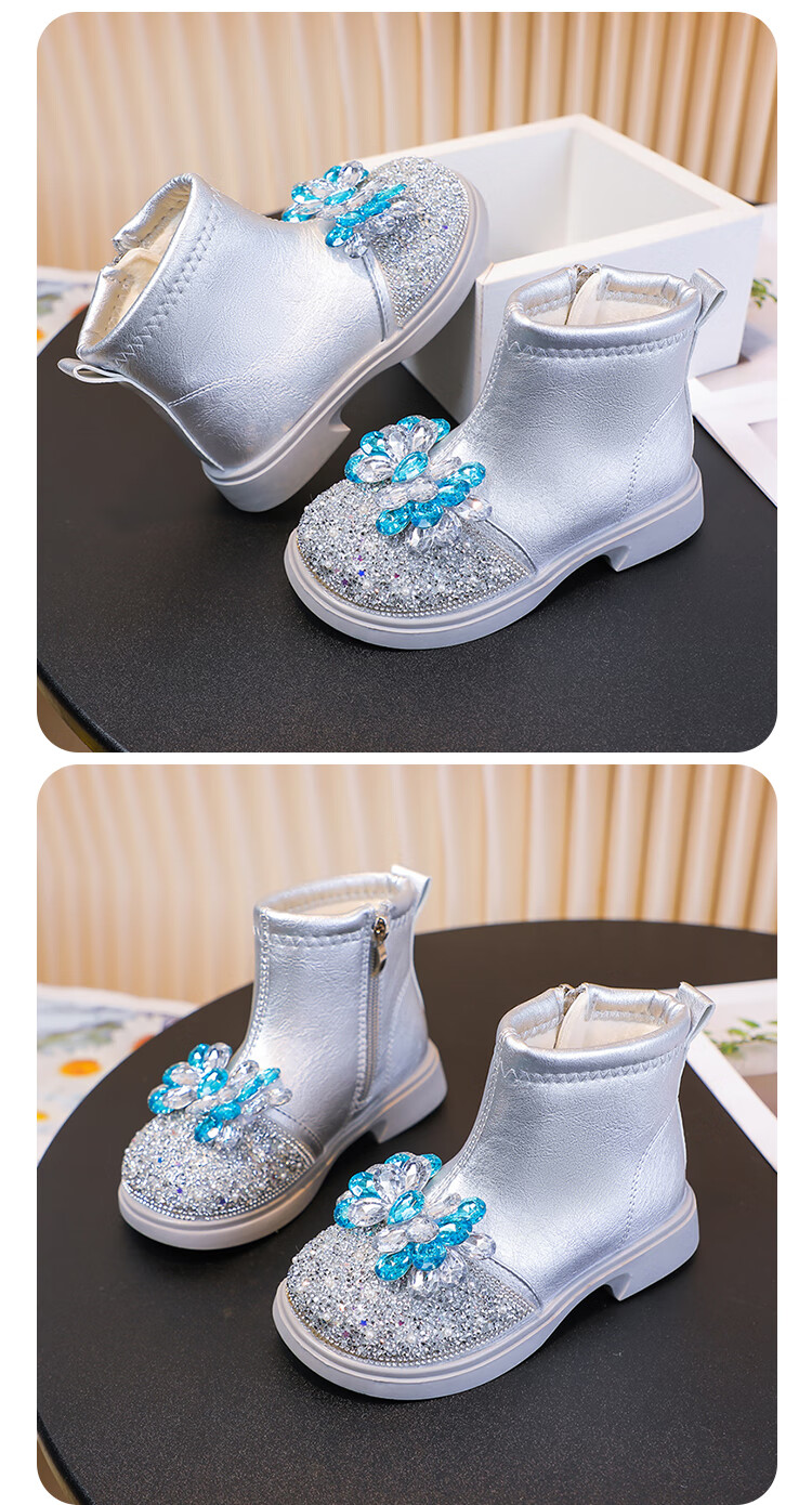 Velvet girls' boots 2025 spring, autumn and winter children's Elsa Princess shoes girls Martin boots crystal short leather boots winter blue size 28 inner length 17 cm