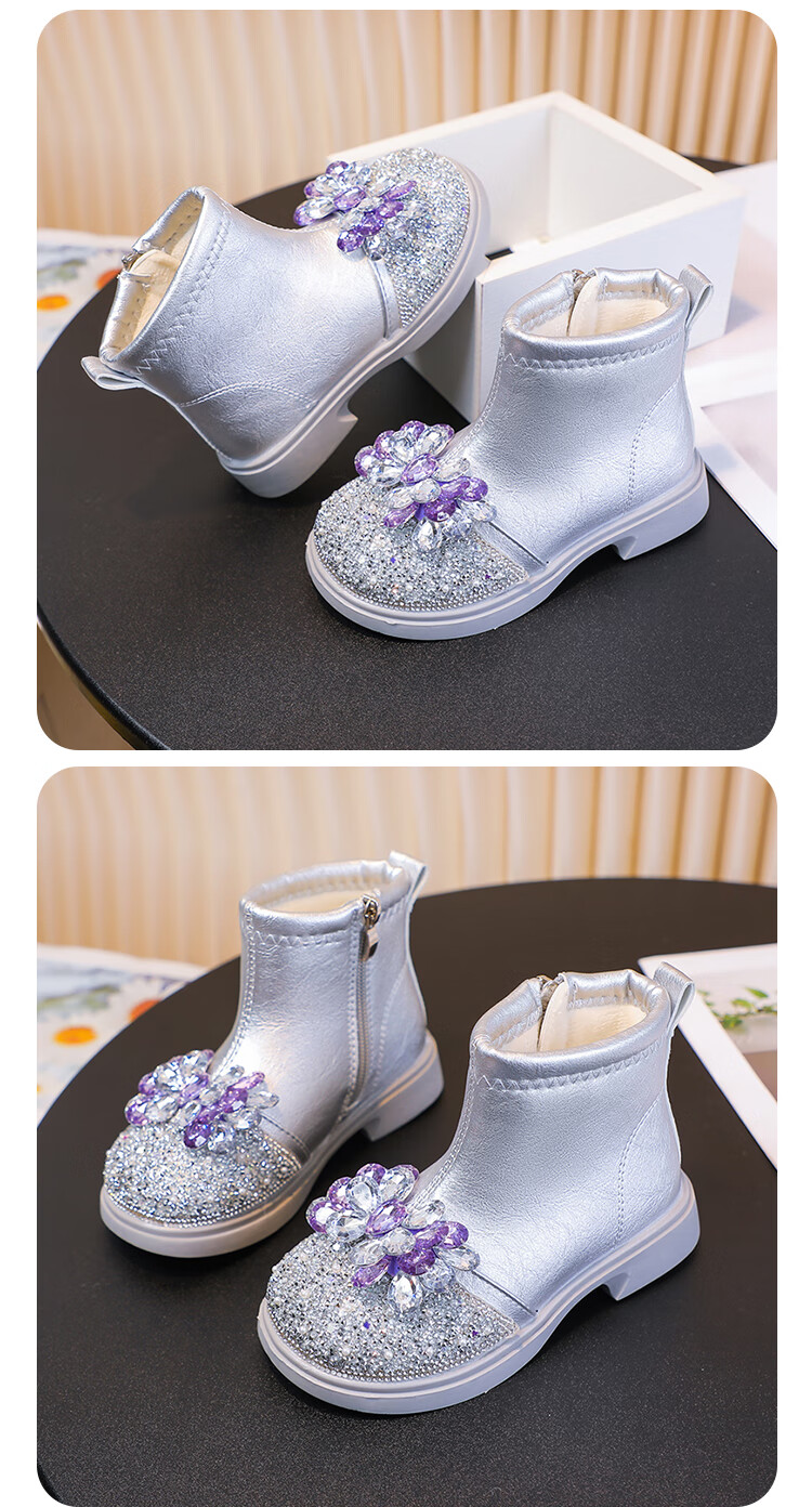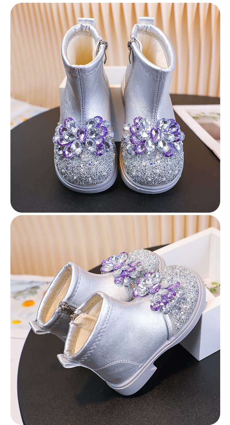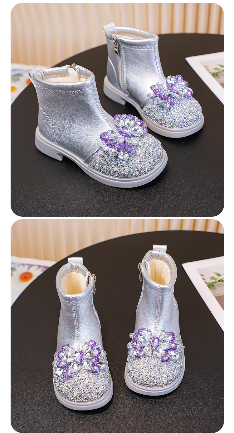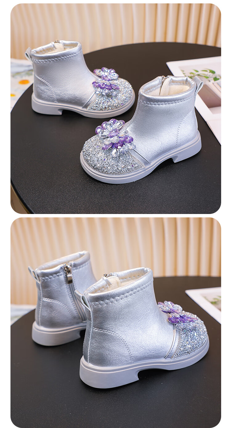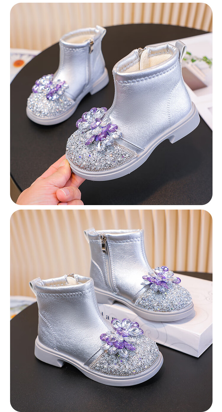 Velvet girls' boots 2025 spring, autumn and winter children's Elsa Princess shoes girls Martin boots crystal short leather boots winter blue size 28 inner length 17 cm