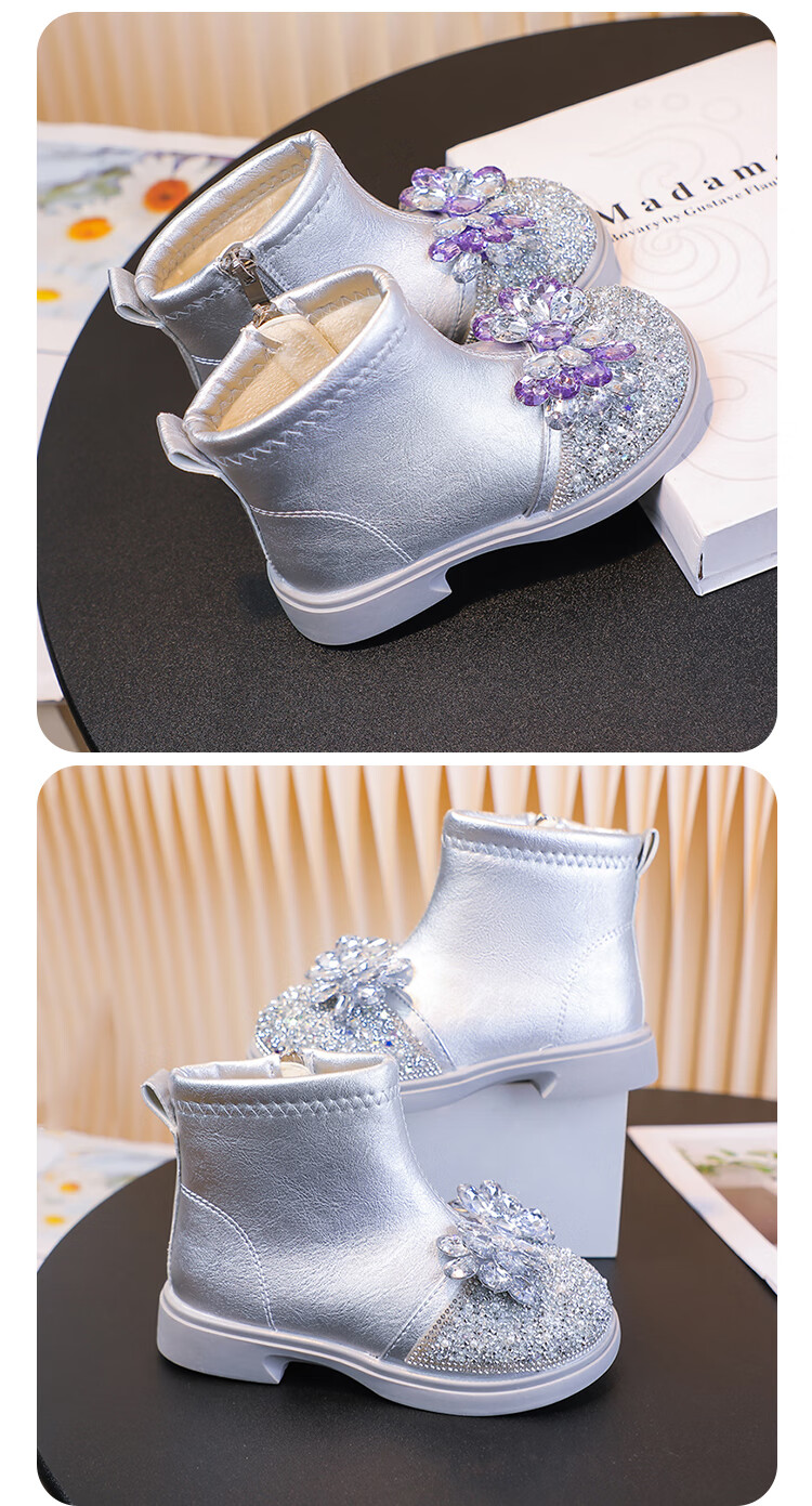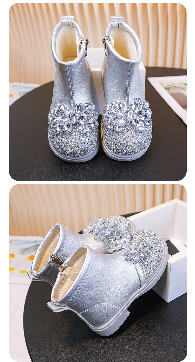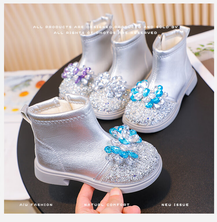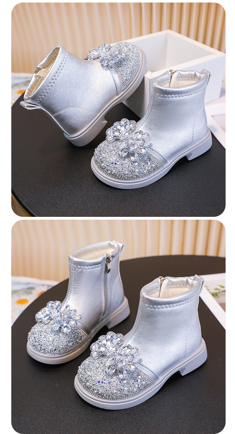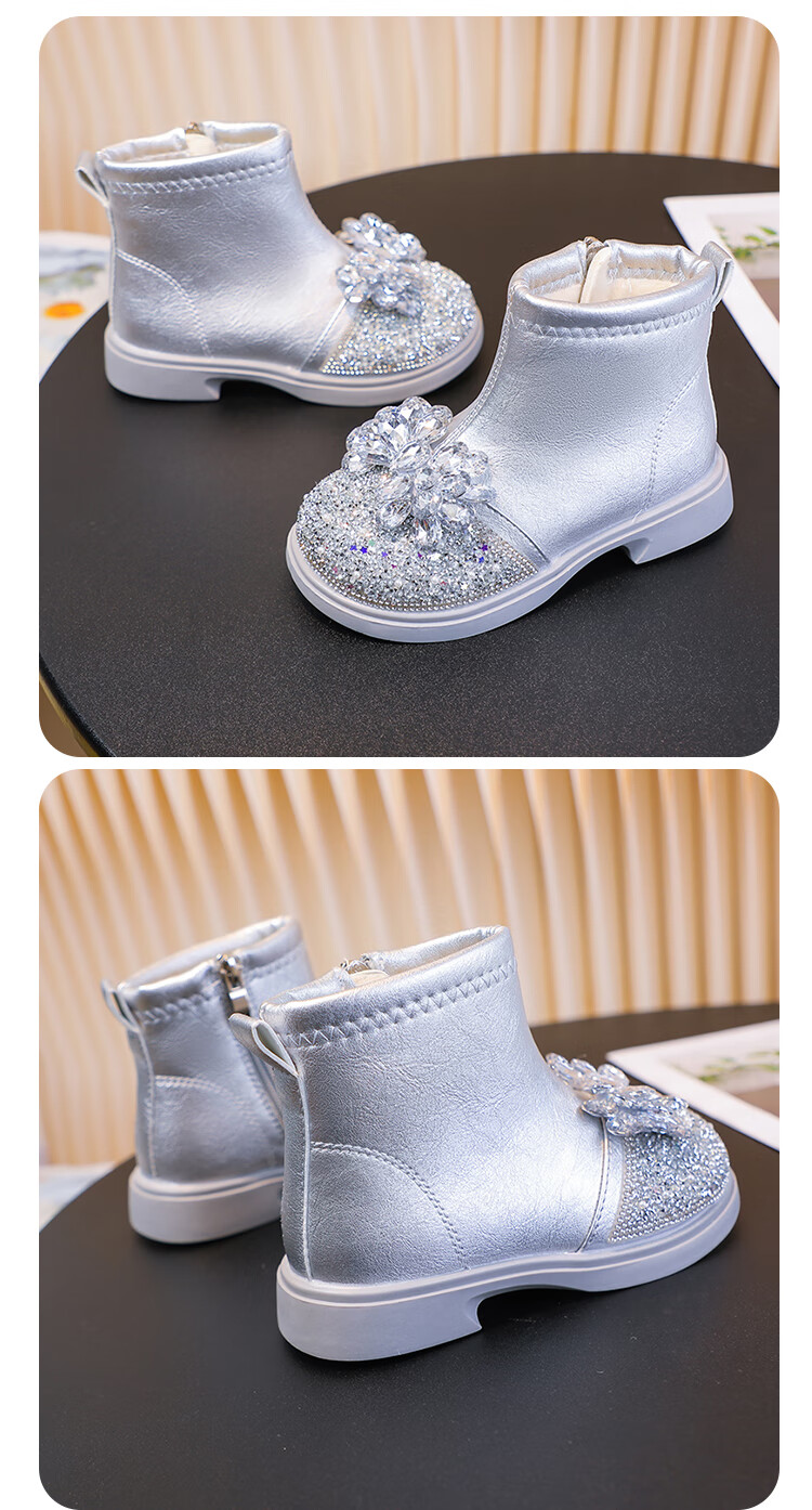 Velvet girls' boots 2025 spring, autumn and winter children's Elsa Princess shoes girls Martin boots crystal short leather boots winter blue size 28 inner length 17 cm