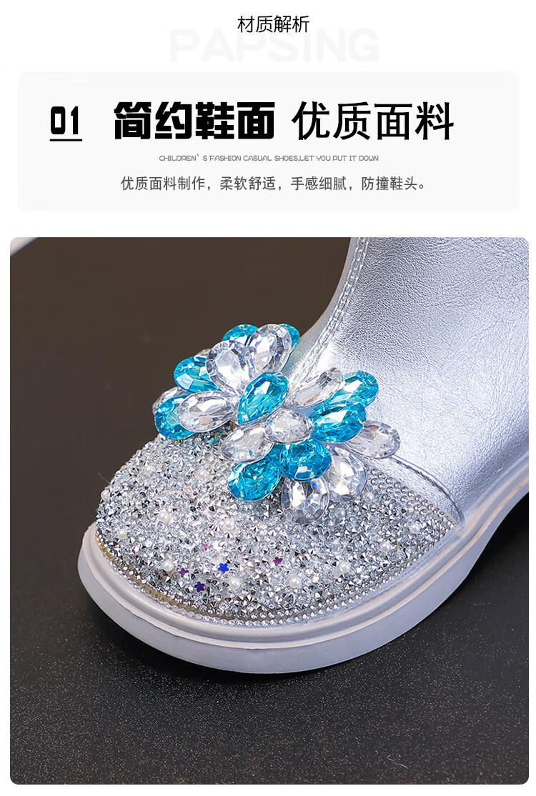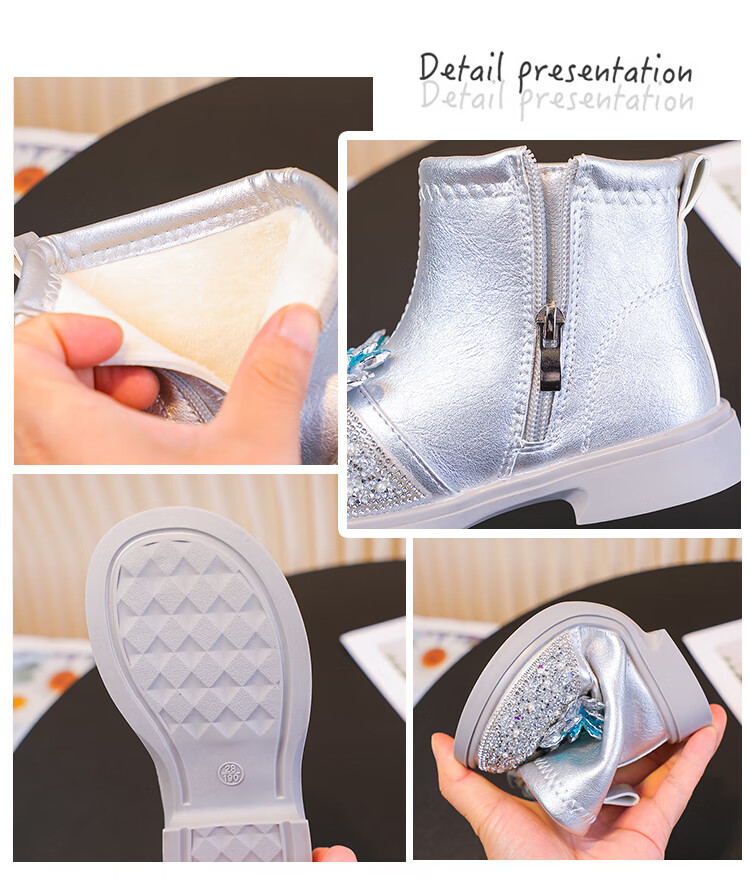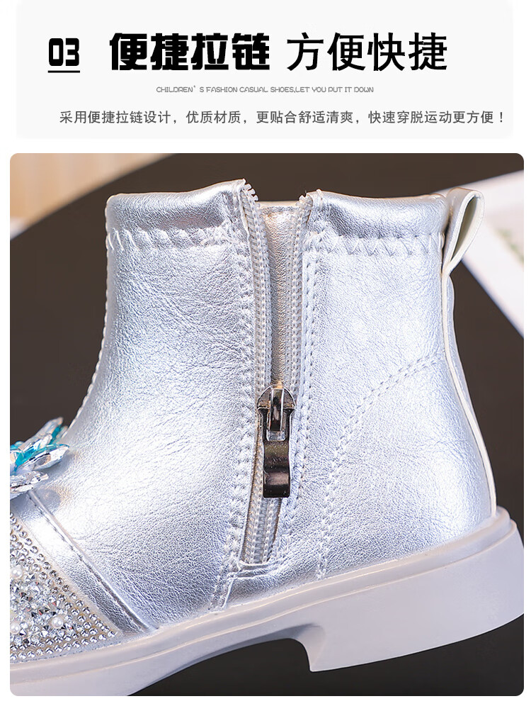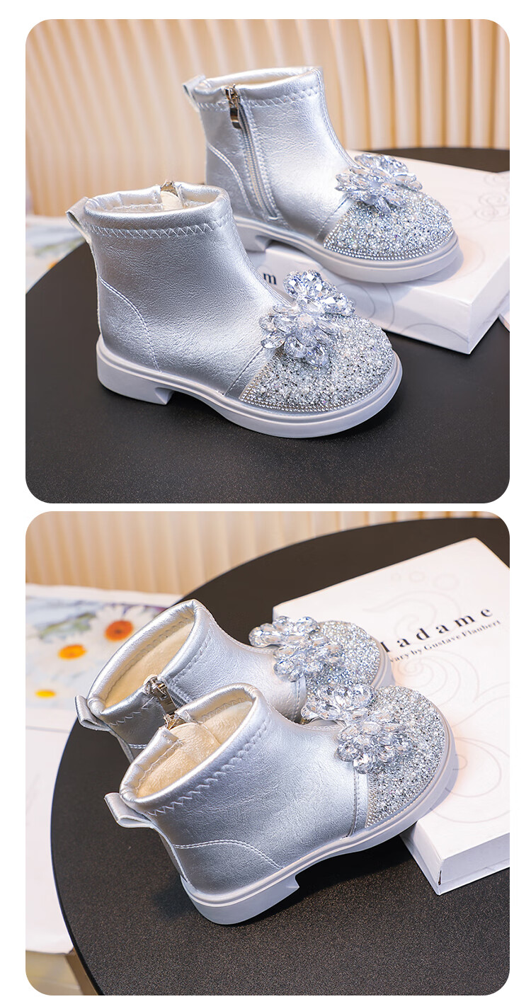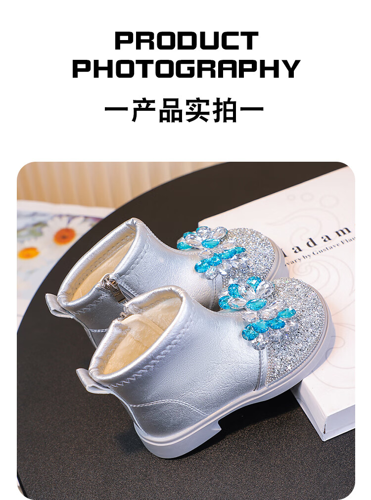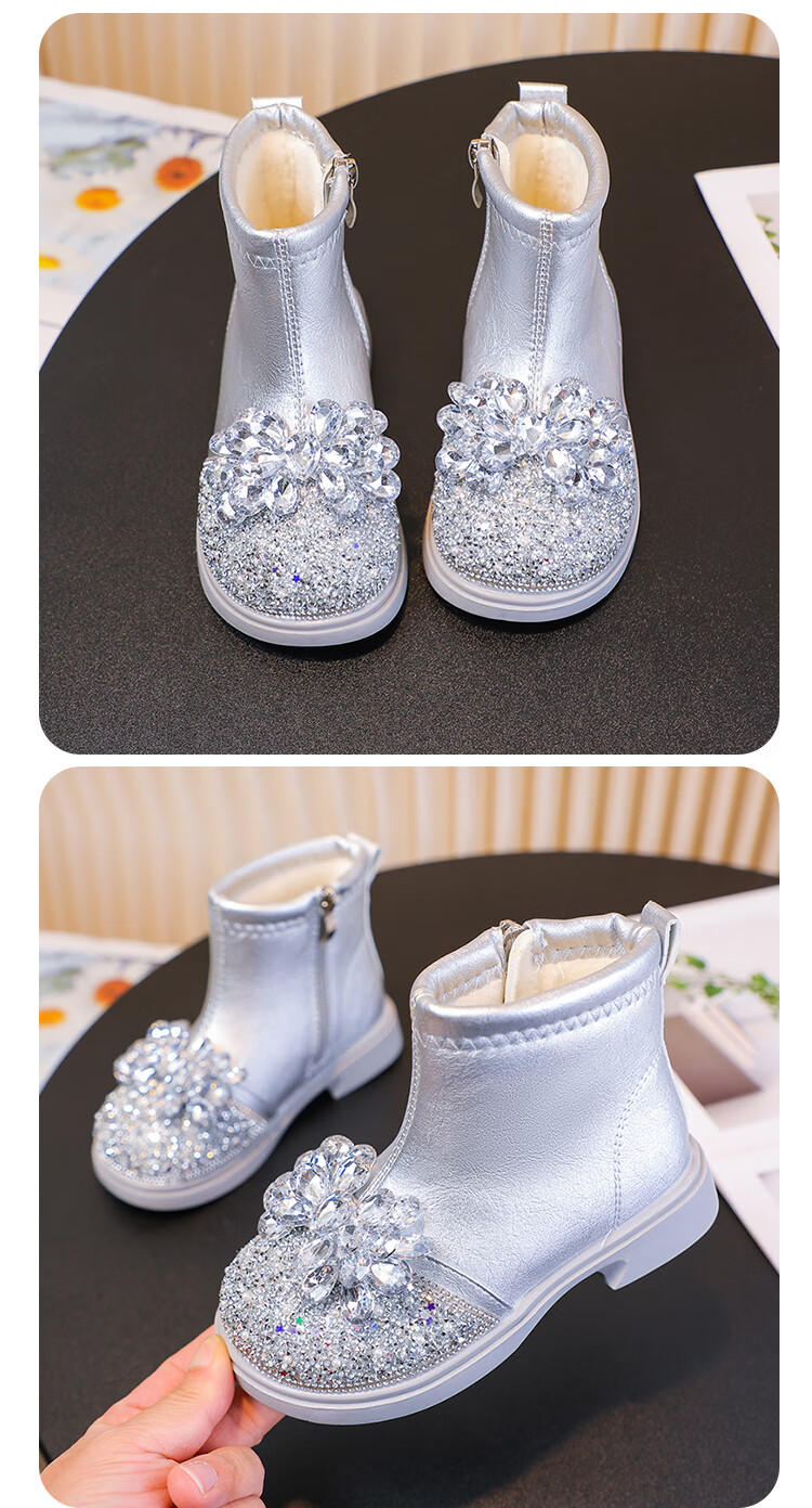 Velvet girls' boots 2025 spring, autumn and winter children's Elsa Princess shoes girls Martin boots crystal short leather boots winter blue size 28 inner length 17 cm