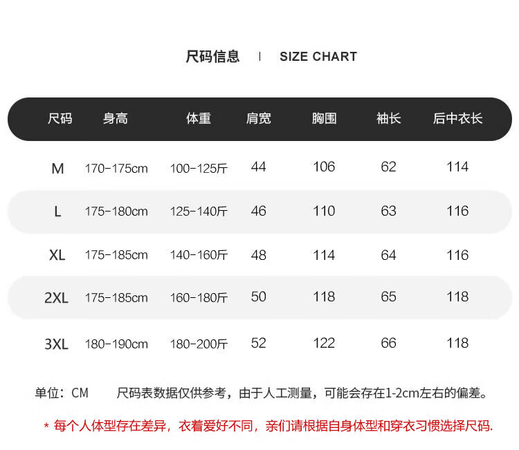 China (cm) 165 / 88-90 170 / 96-98 175 / 108-110 180 / 118-122 185 / 126-130