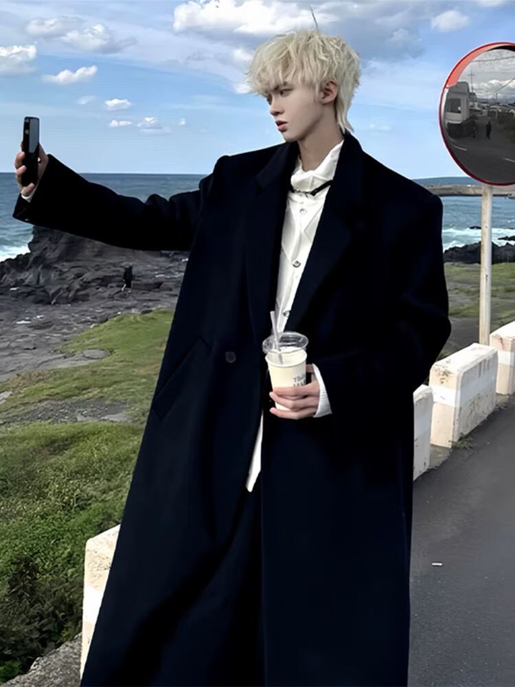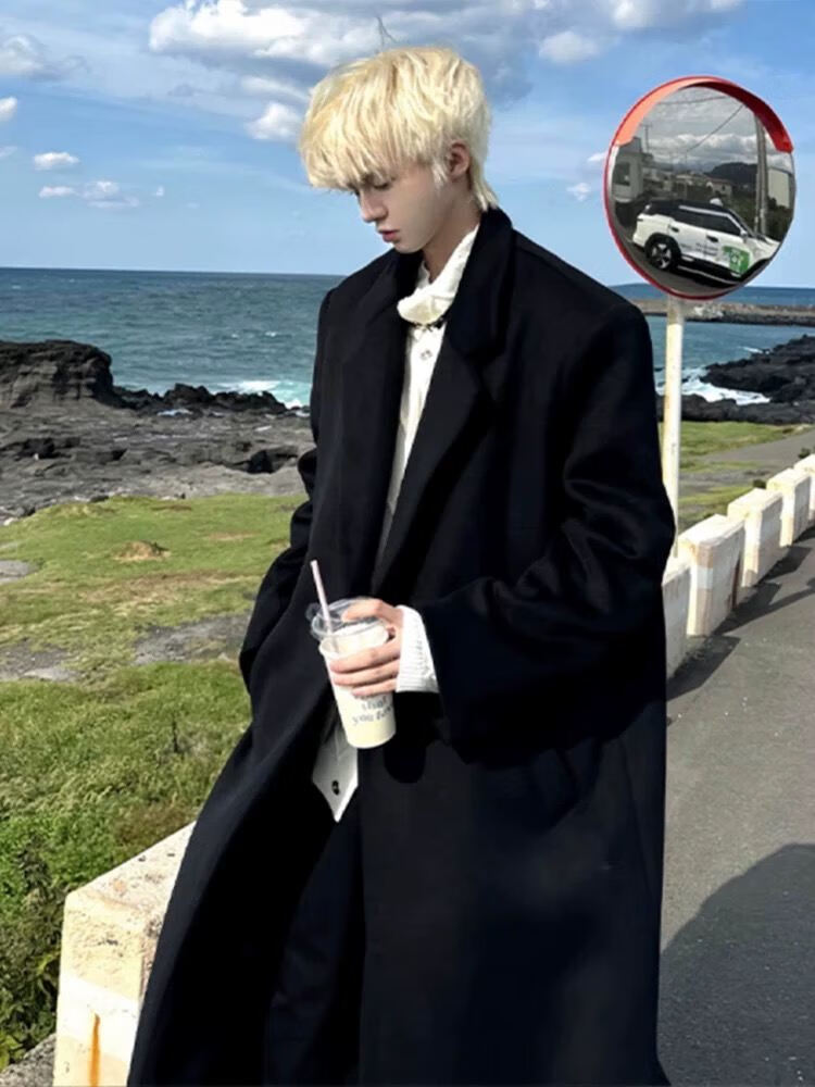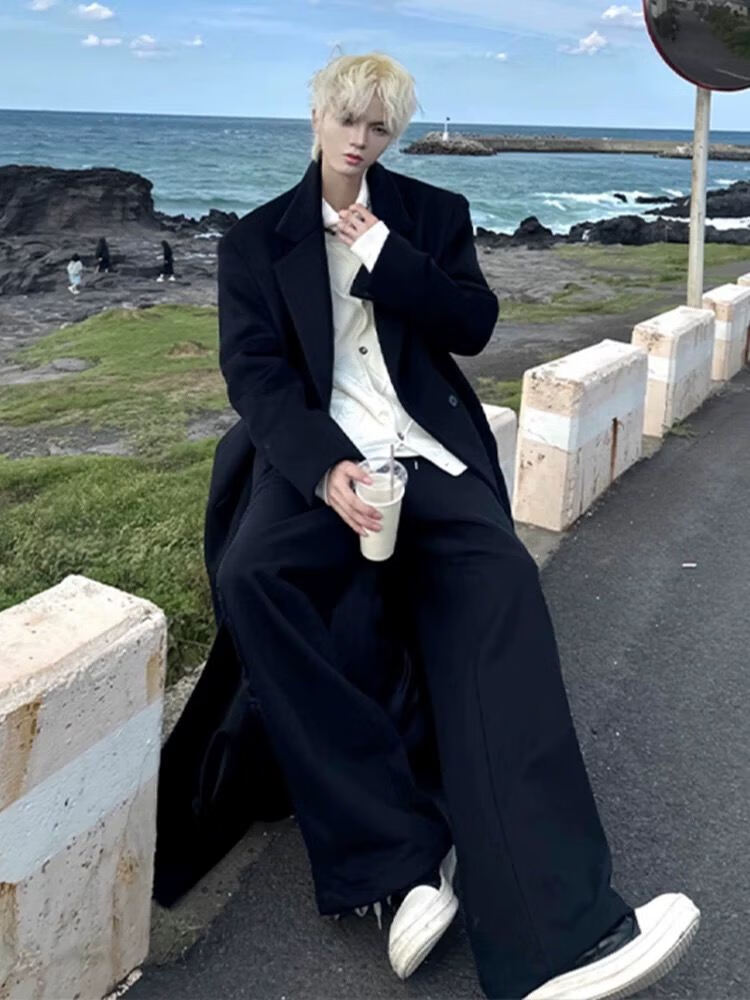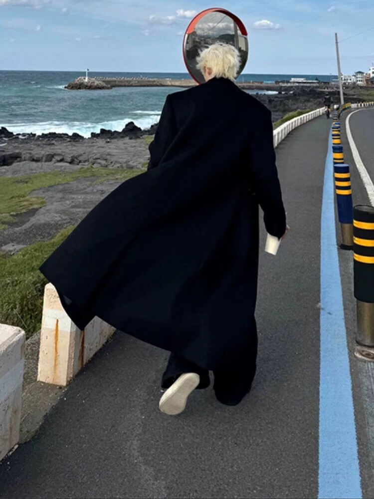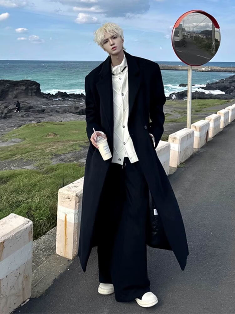 Nuevo abrigo cálido cruzado con cuello de traje de lana de otoño e invierno de Ivansby, abrigo grueso de estilo perezoso, cortavientos por encima de la rodilla para hombre, algodón negro 3XL