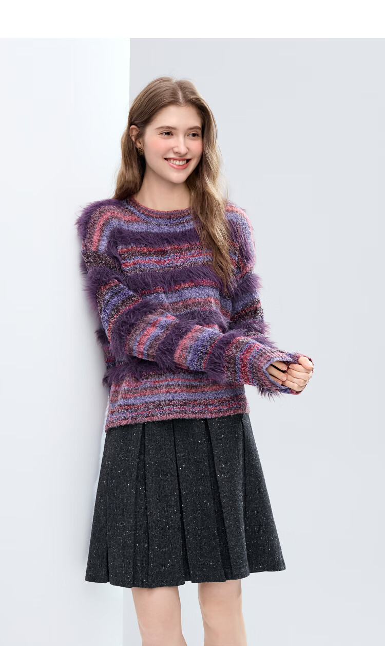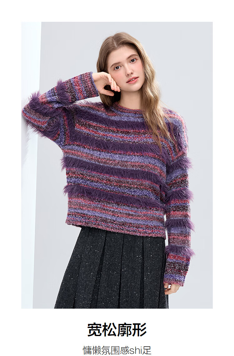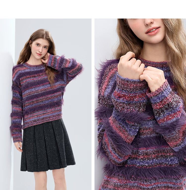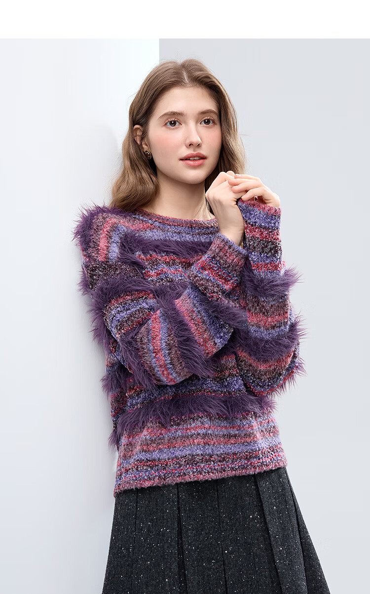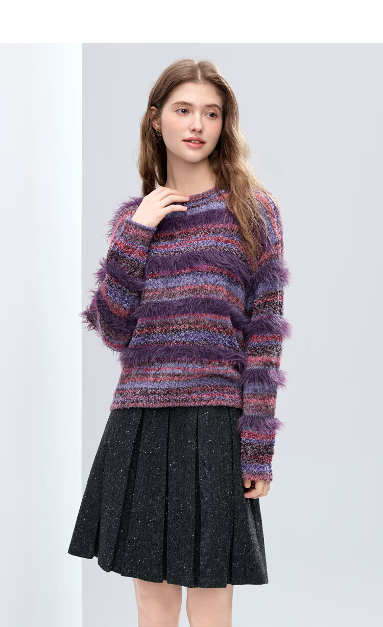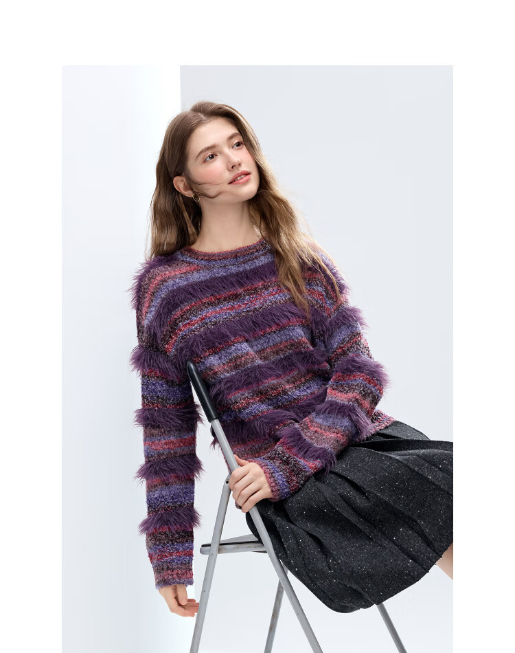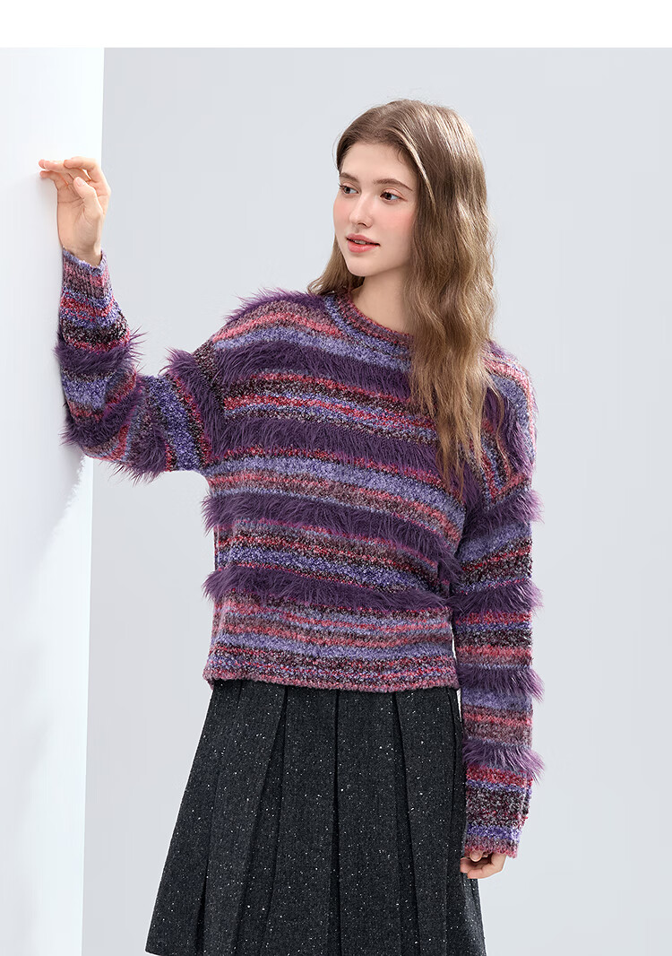 Betu Women's 2025 Winter New Sweater Round Neck Gradient Stripe Plush Decoration Slim Top Women 2511T43 Dark Purple M