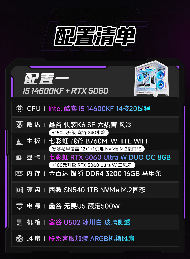 Colorful Core i5 14600KF/245KF/5060/5060Ti/5070 E-Sports Host Pure White Game Live Computer Design Rendering Productivity 3A FPS High Frame Equipped with Five i5 14600KF+5060Ti D5 Single Host