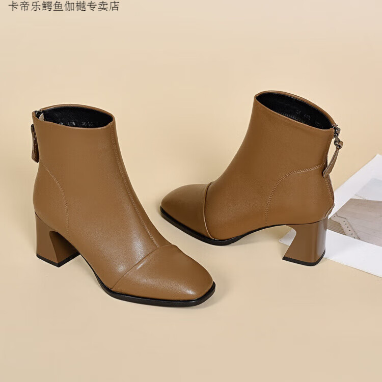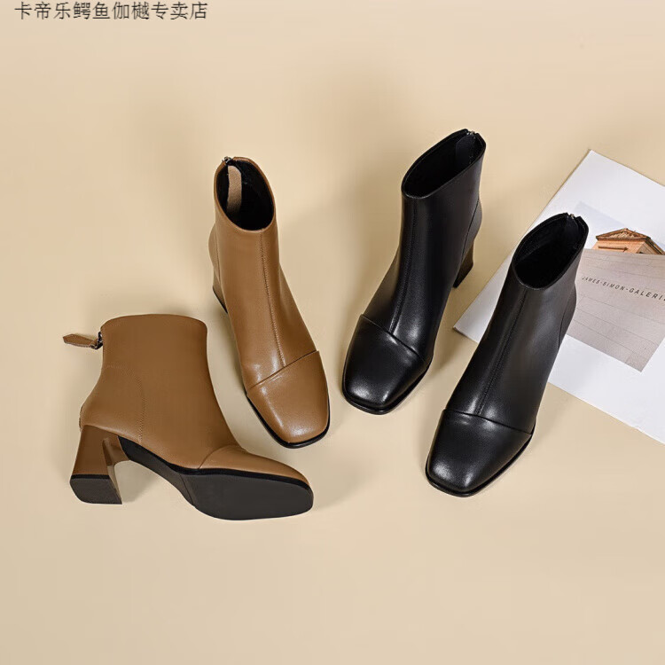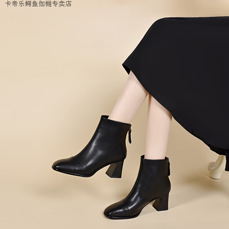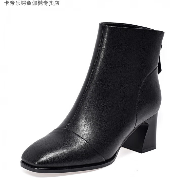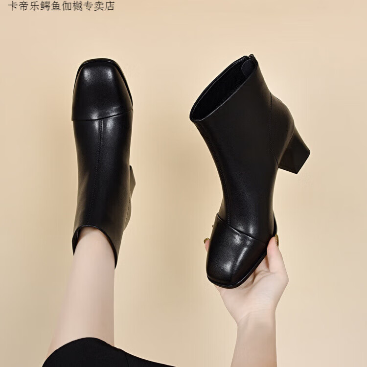 CARTELO Genuine Leather Martin Boots High Heel Short Boots Women's Square Toe Soft Sole Temperament French Slim Boots Thickened Wool Cotton Boots Autumn and Winter Black Wool-5cm 34