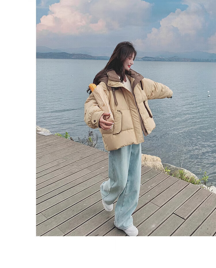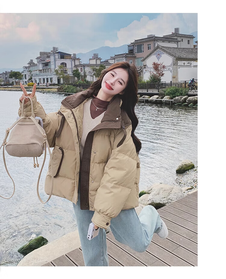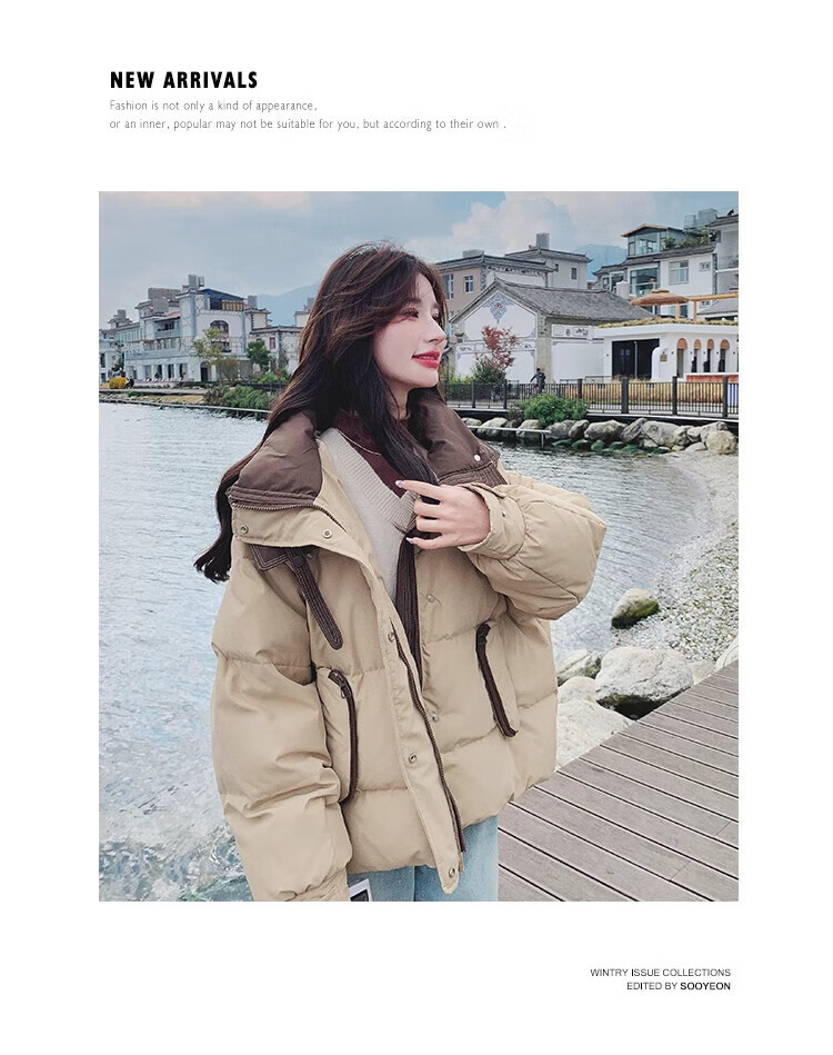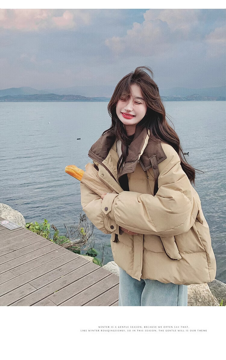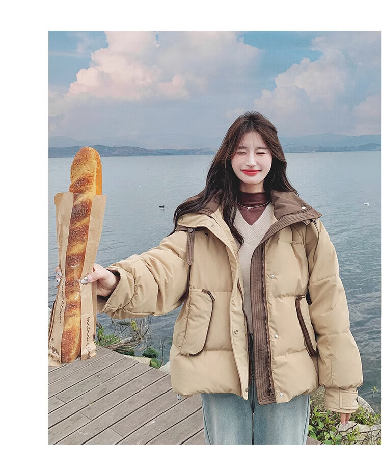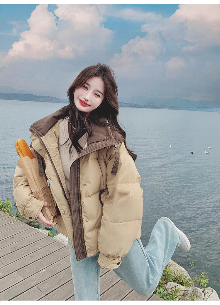 Miao Yijia Cotton Clothes Women's 2025 New Winter Jackets Cotton Clothes Cotton Jackets Short Style Western Style Student Small People High-end Fashion Khaki Contrast Color Zipper Pocket Cotton Clothes One Size Recommended 120Jin Jin is equal to 0.5kg within