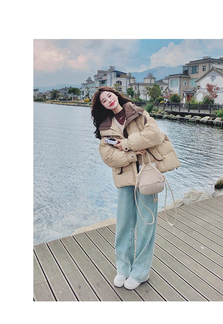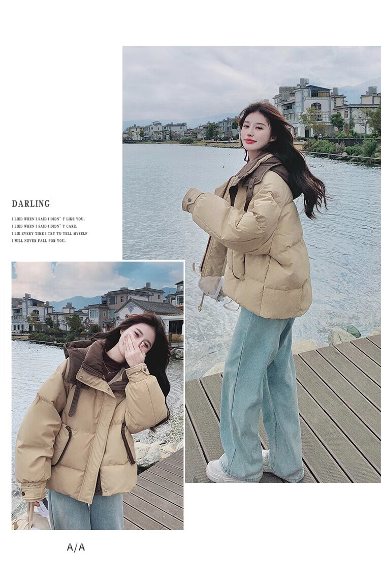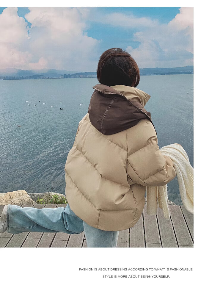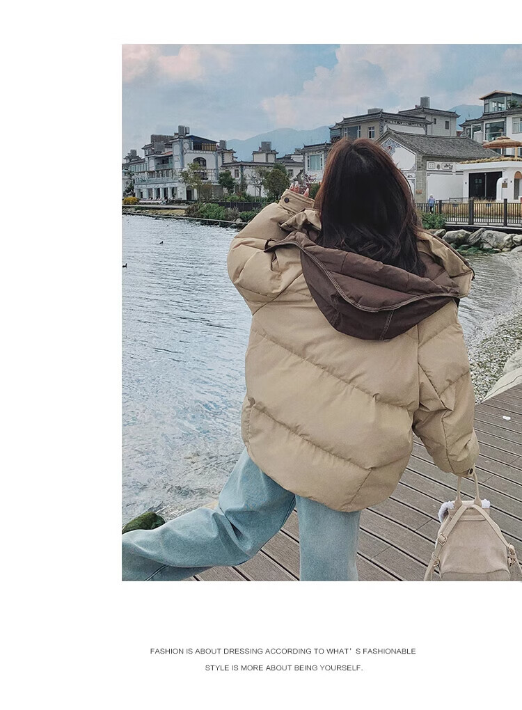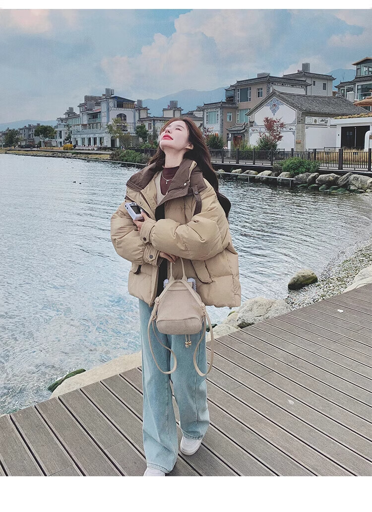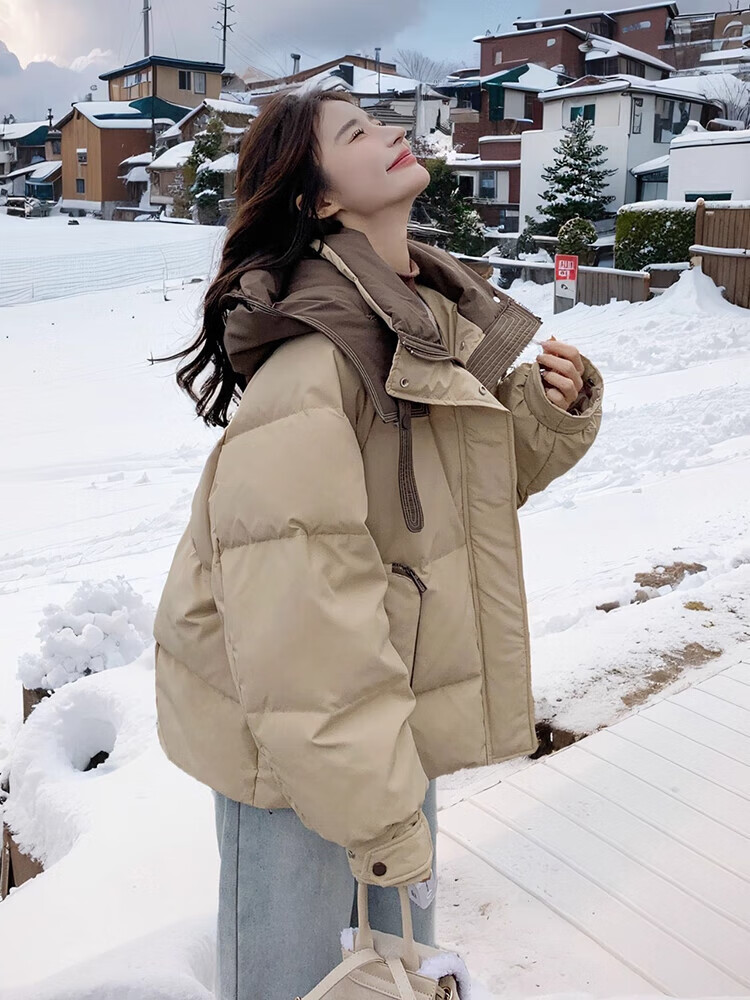 Miao Yijia Cotton Clothes Women's 2025 New Winter Jackets Cotton Clothes Cotton Jackets Short Style Western Style Student Small People High-end Fashion Khaki Contrast Color Zipper Pocket Cotton Clothes One Size Recommended 120Jin Jin is equal to 0.5kg within
