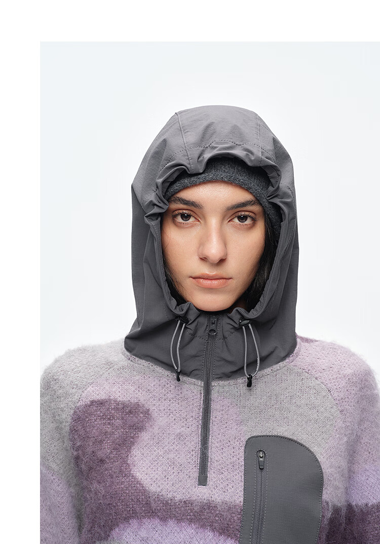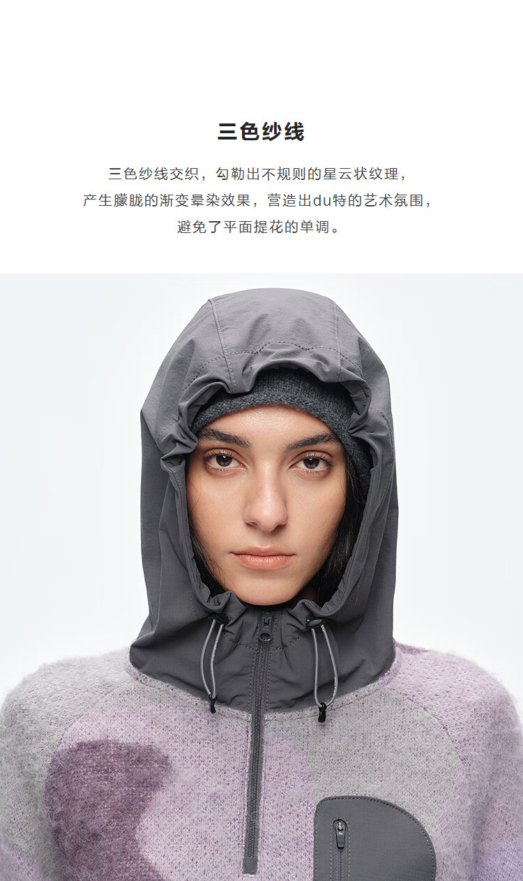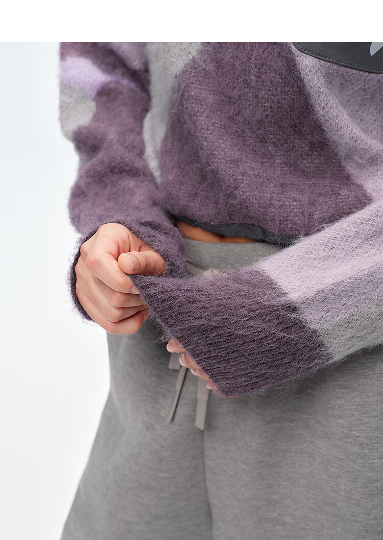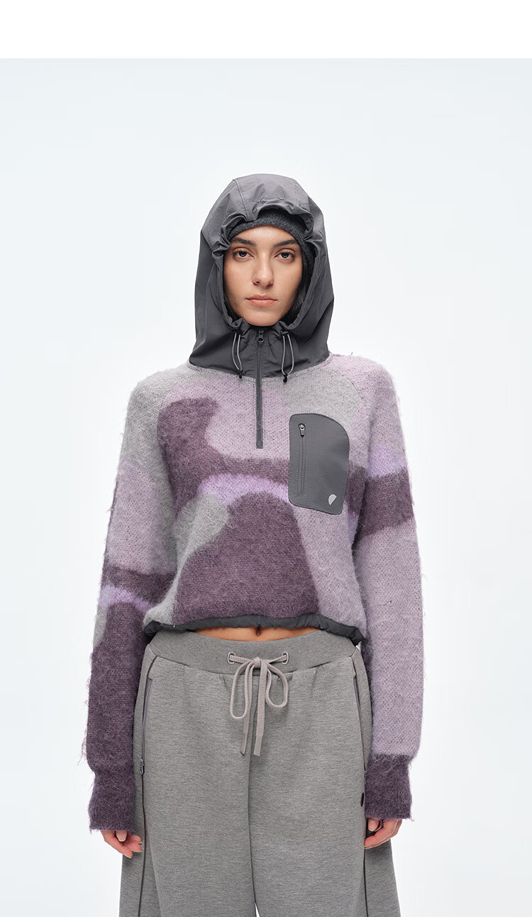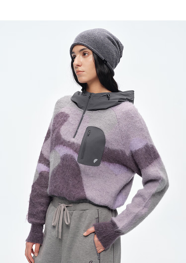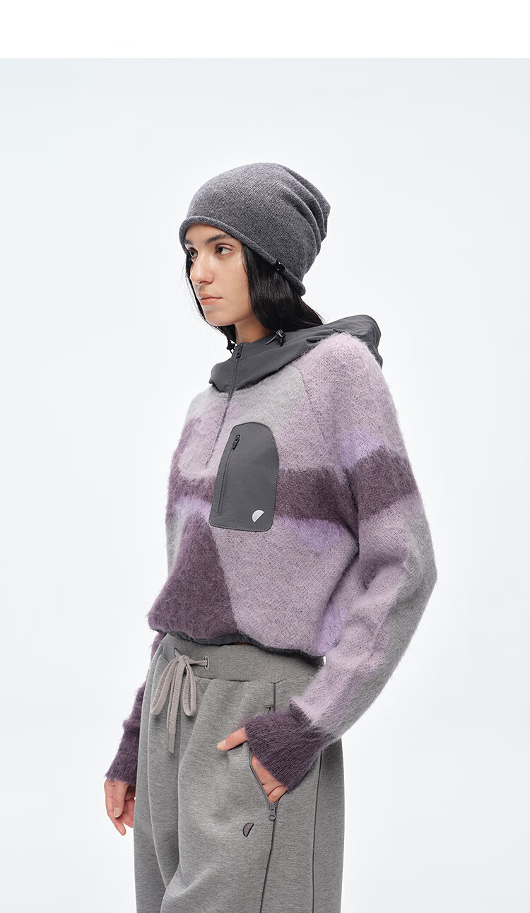 Semicircular three-color yarn interwoven women's sports 2025 winter hooded irregular jacquard texture sweater for women, twilight purple (pre-sale) M