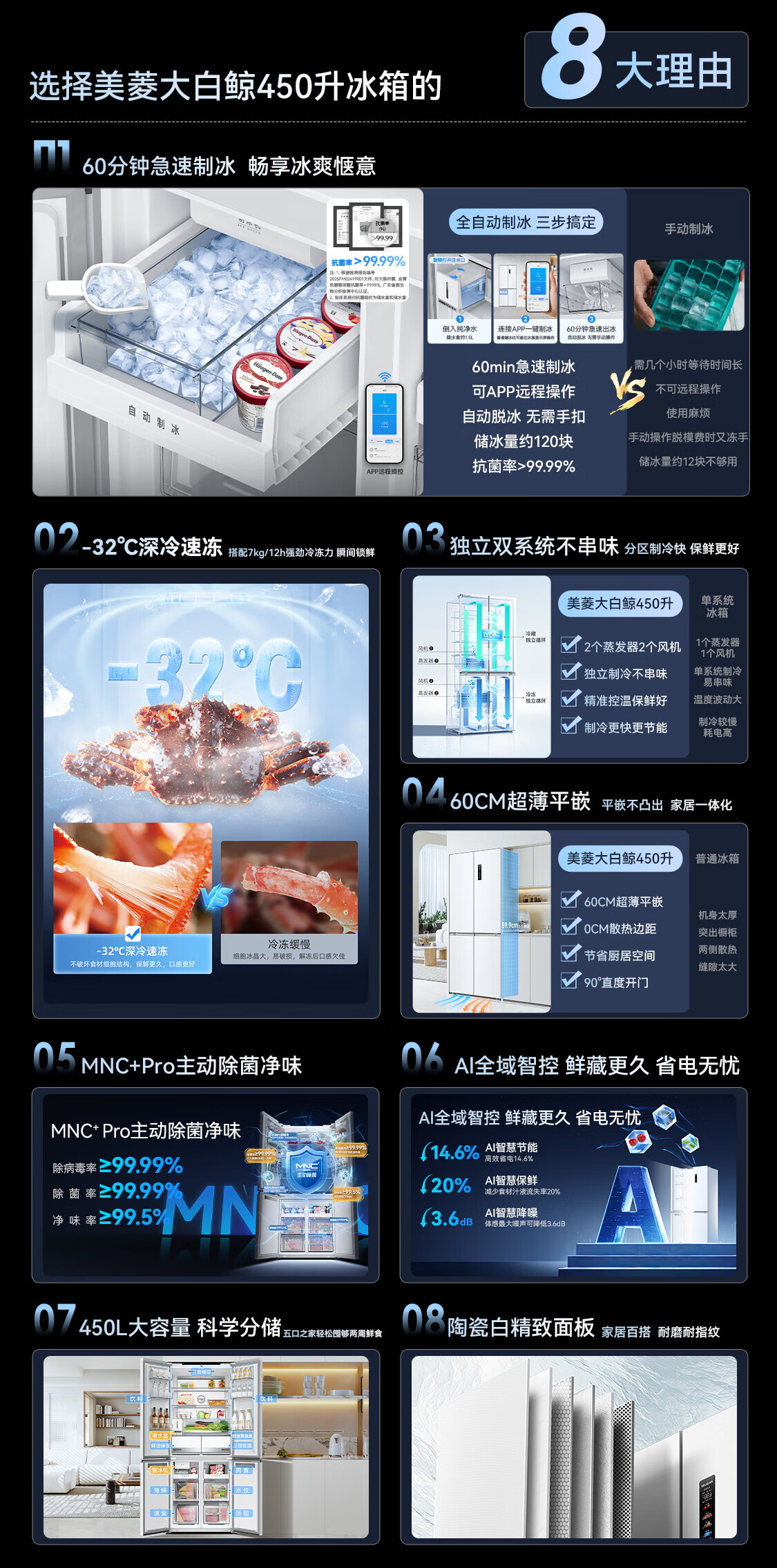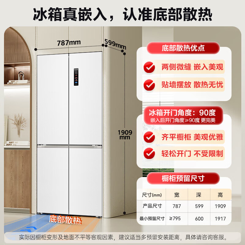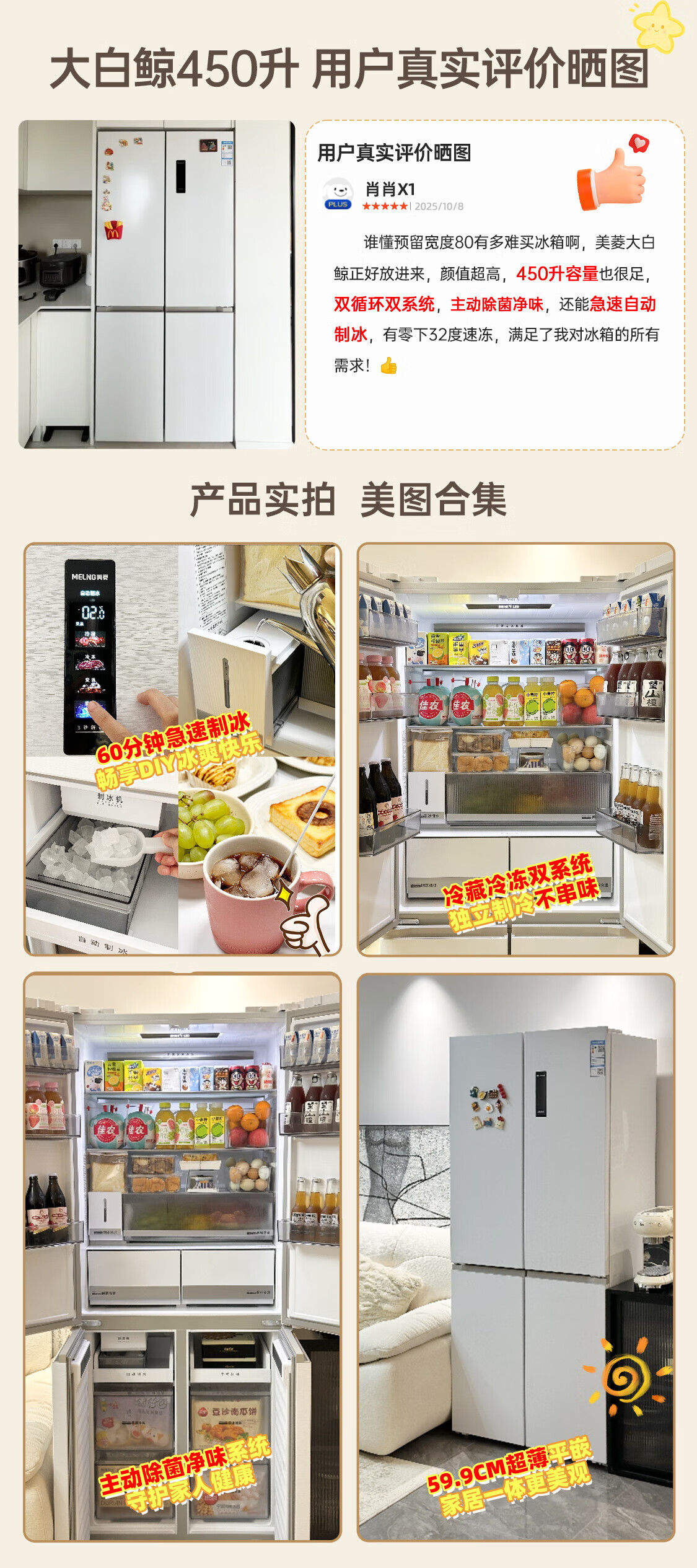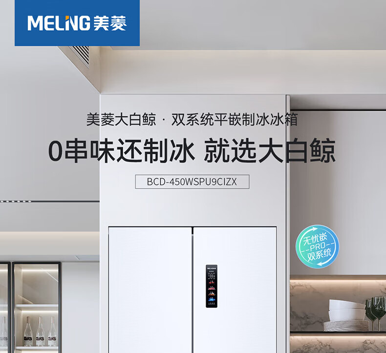 MeiLing 450-liter cross-door refrigerator Beluga dual-cycle dual-system active sterilization and deodorization fully automatic ice making ultra-thin zero-embedded household large capacity 450WSPU9CIZX