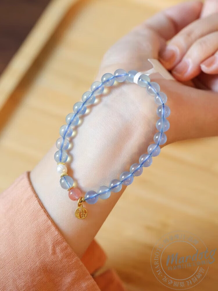Cute Fox Yuan Aquamarine Bracelet Women's Blue Crystal Bracelet as a Gift for Girlfriend 6mm Bead Diameter