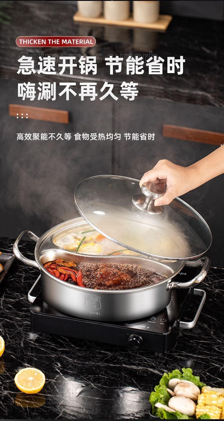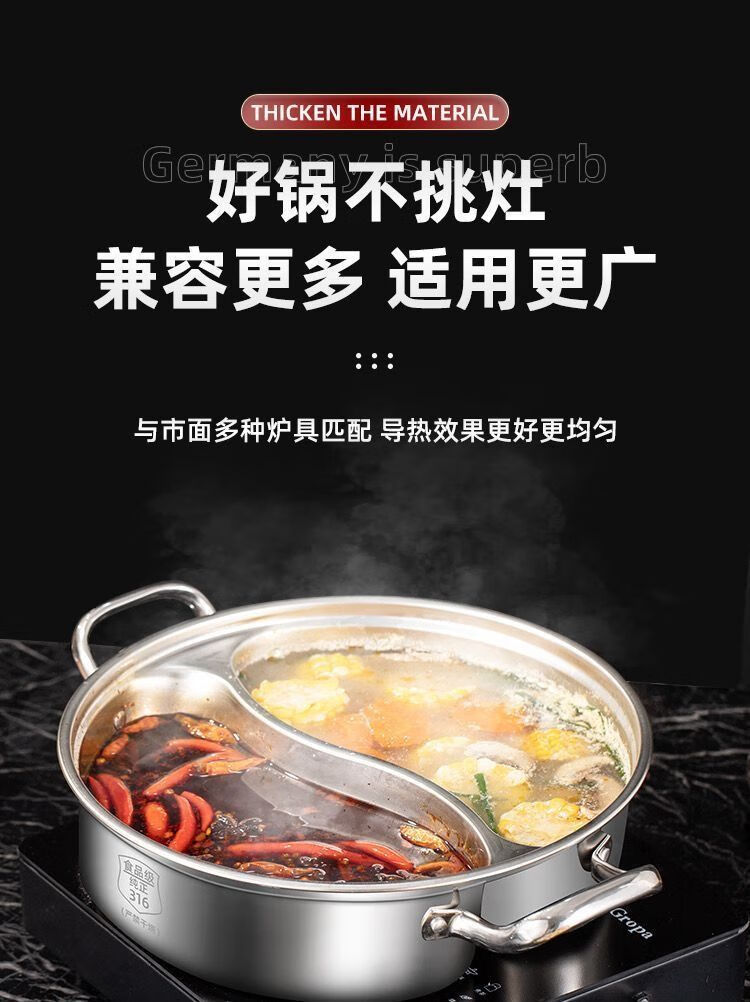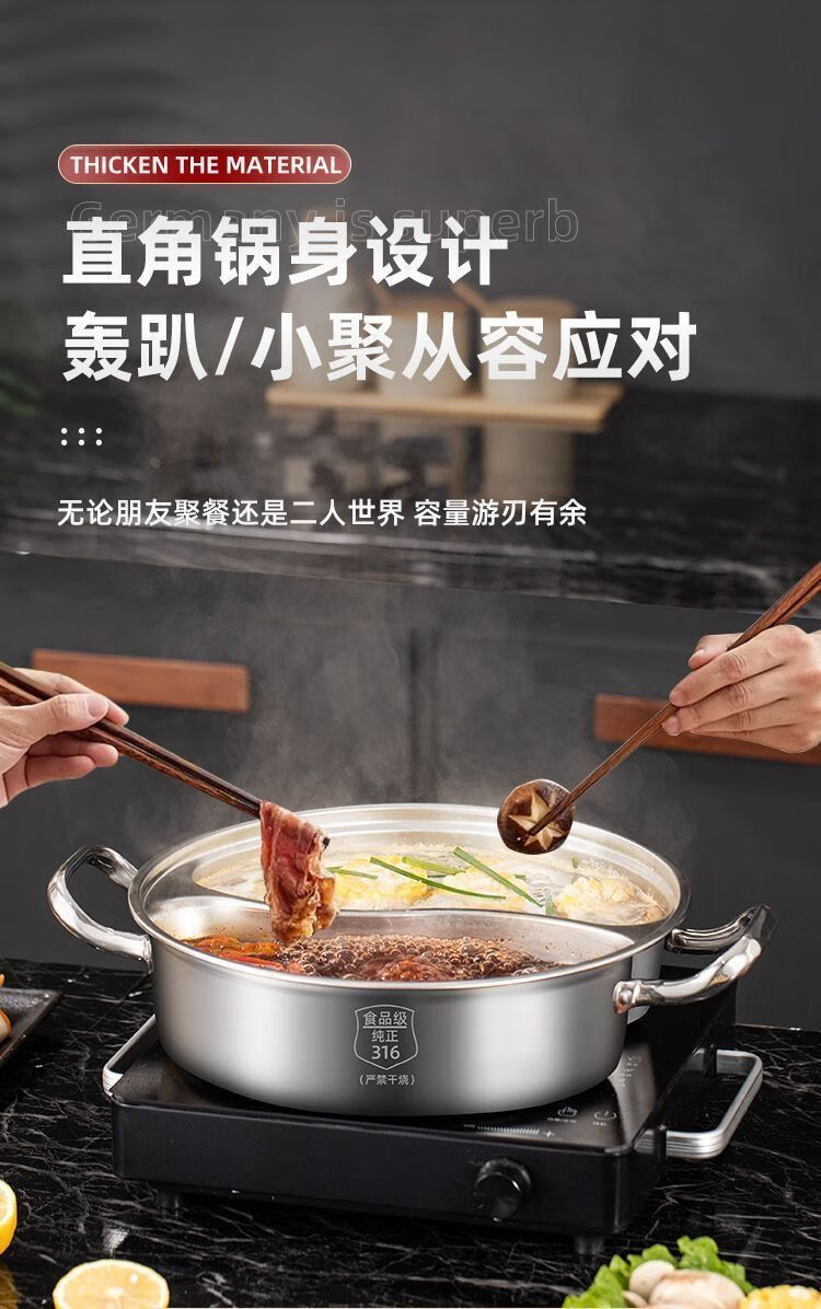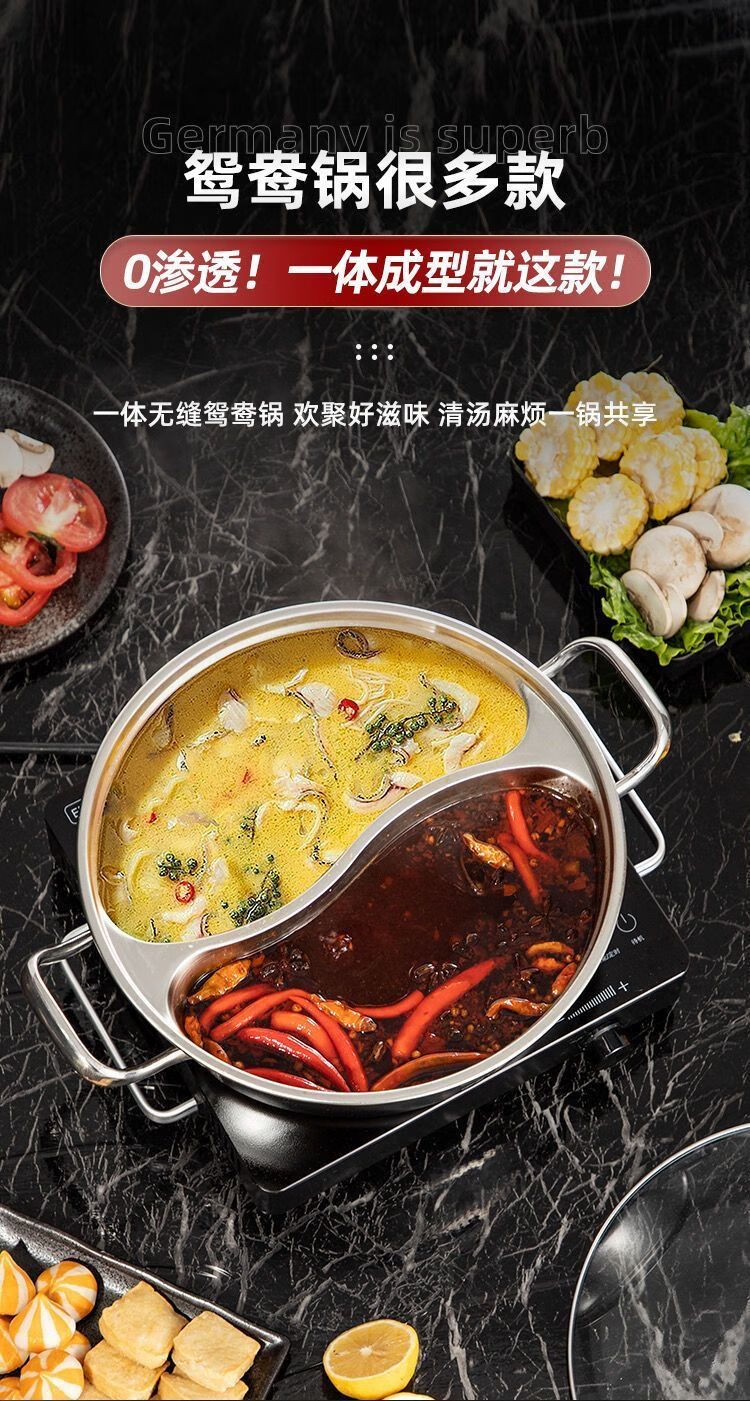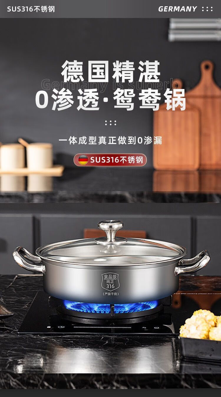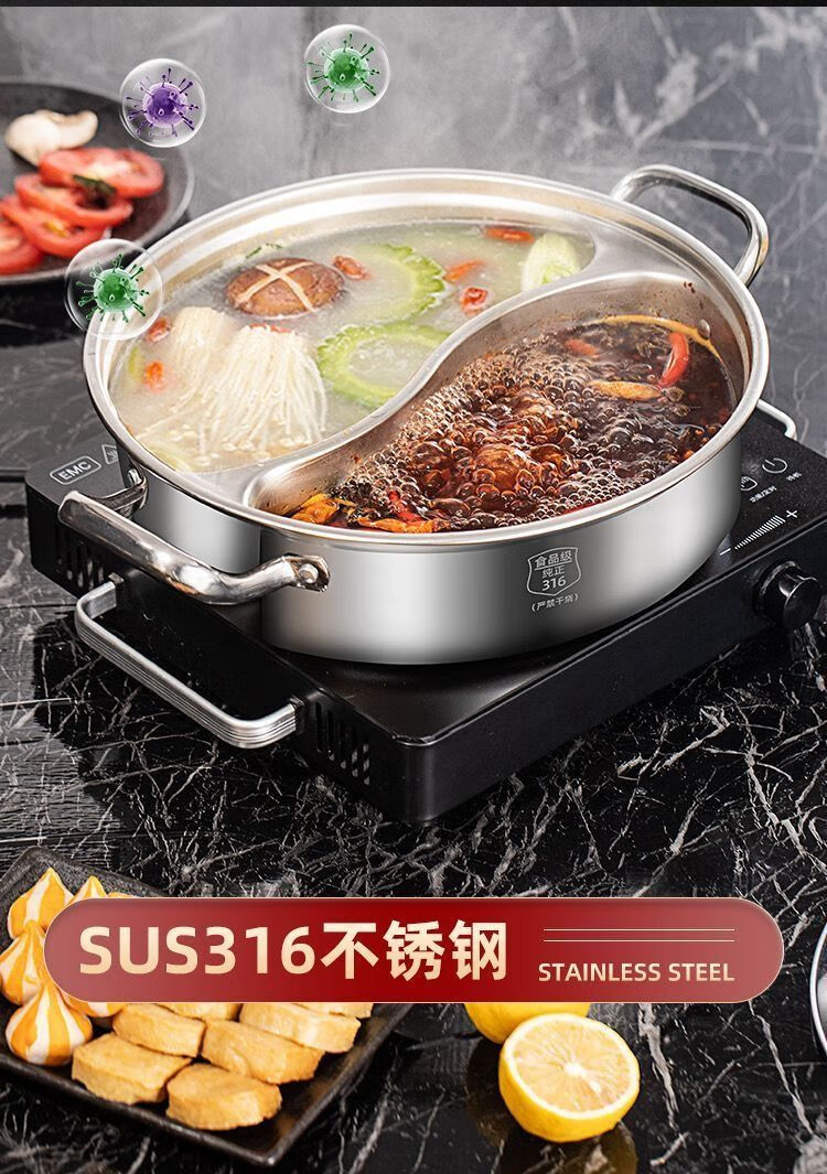 Huamuxi food grade 316 stainless steel mandarin duck pot hot pot shabu-shabu one-piece hot pot induction gas stove 316L antibacterial grade mandarin duck pot 1 inch 32CM with lid huge thick + mandarin duck pot