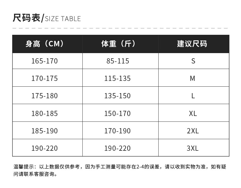 China (cm) 165 / 88-90 170 / 96-98 175 / 108-110 180 / 118-122 185 / 126-130
