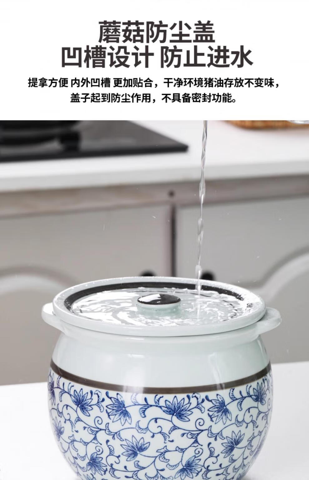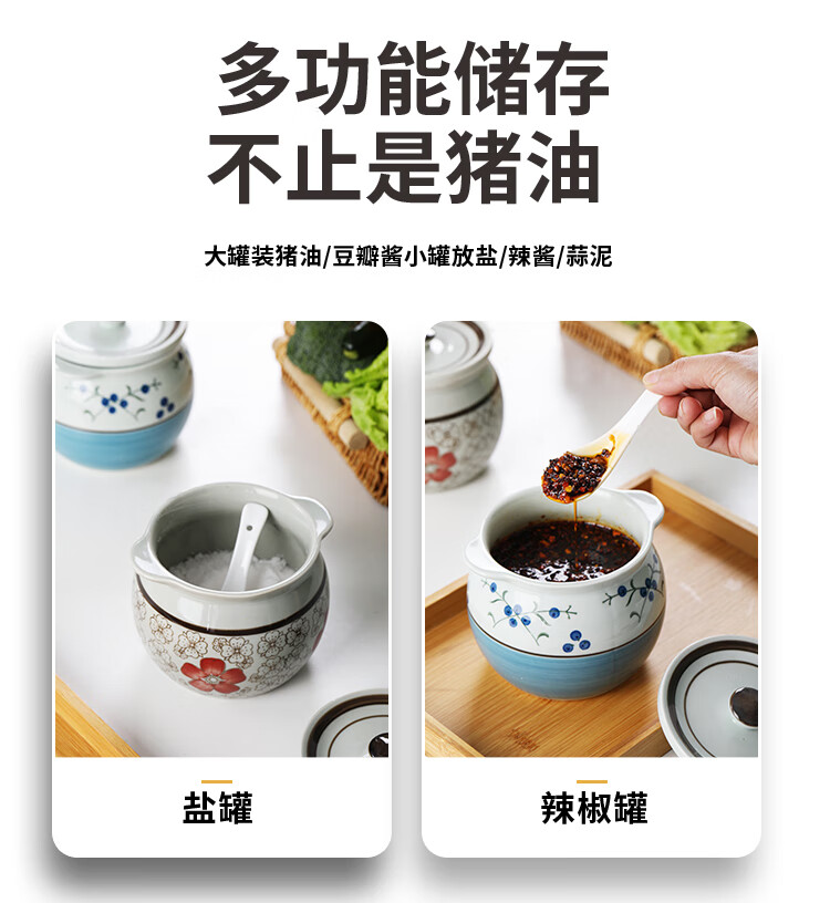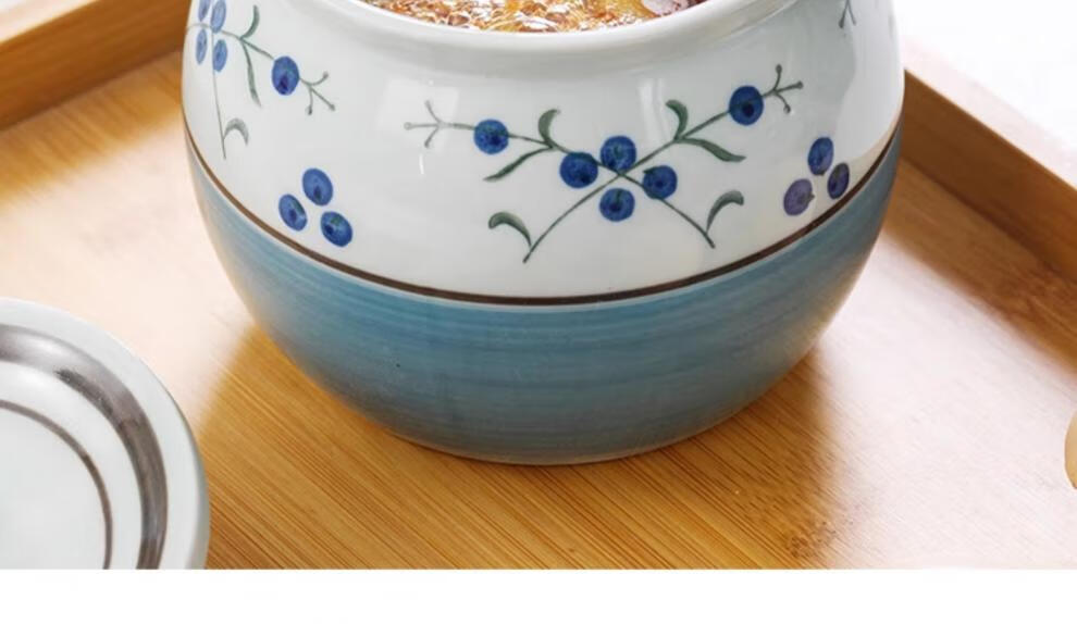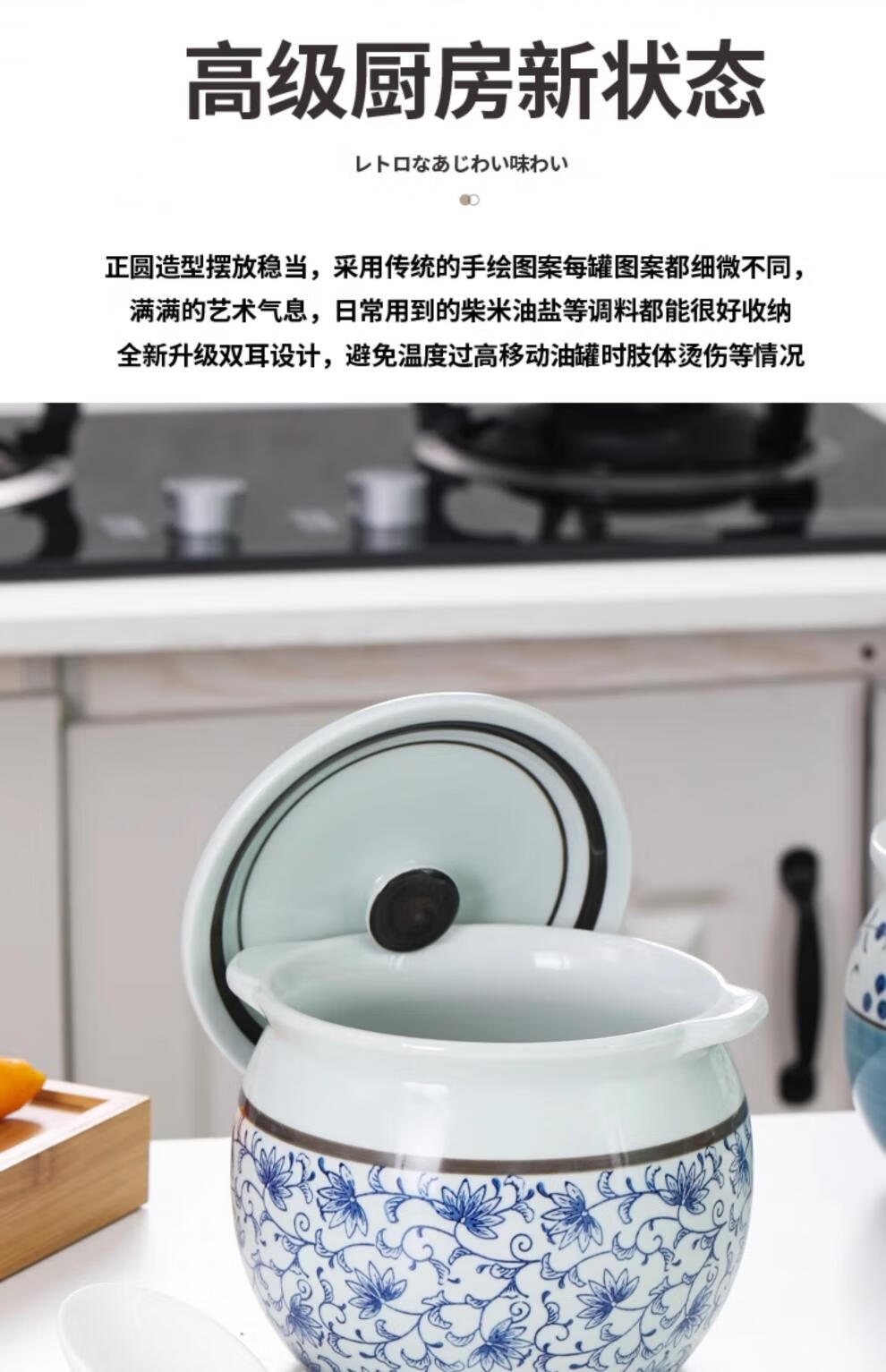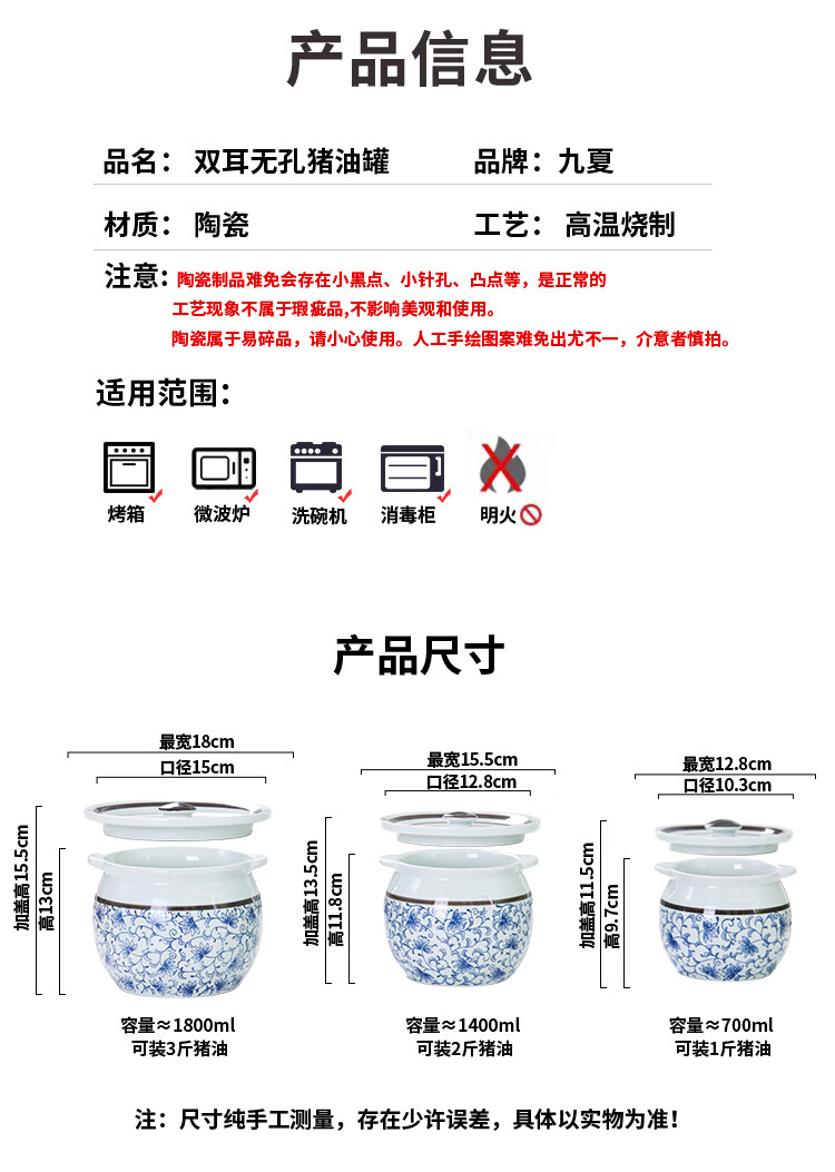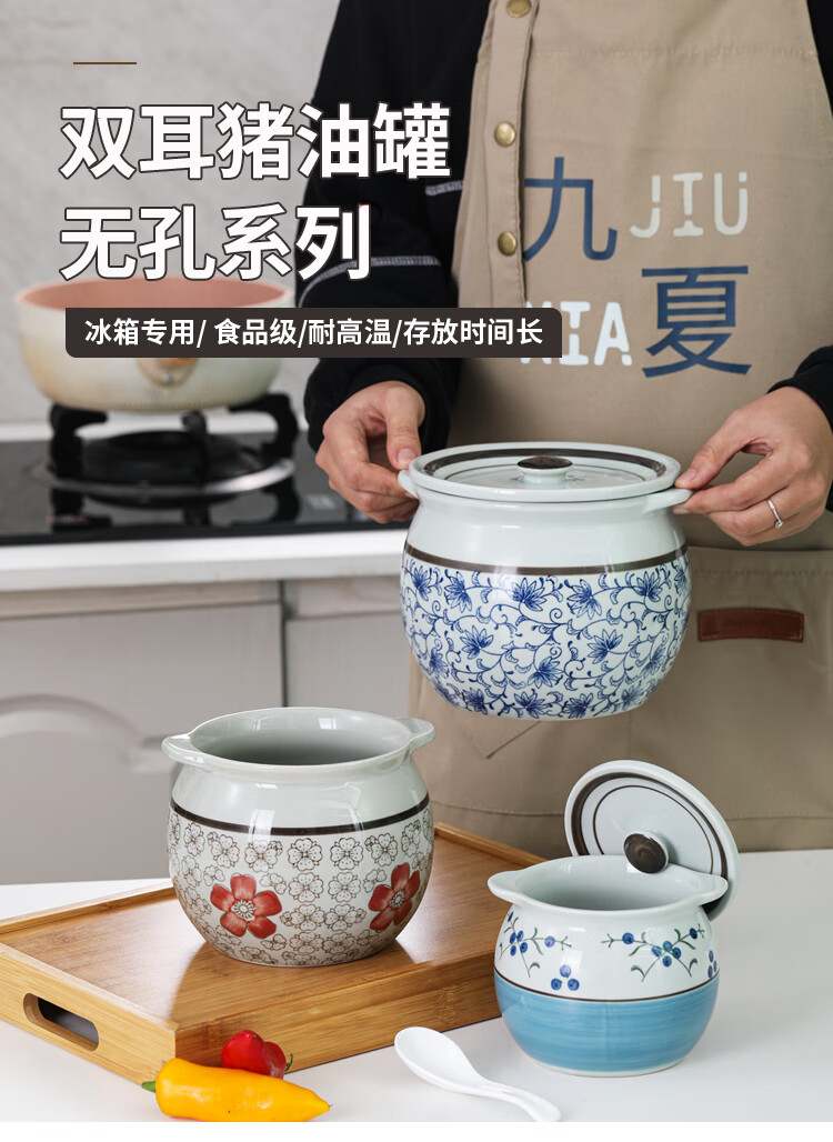 Jiuxia lard jar ceramic non-porous high temperature resistant kitchen household chili jar old-fashioned oil jar sealed salt jar chili jar non-porous double ears blue and white 1800ml