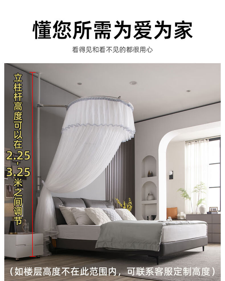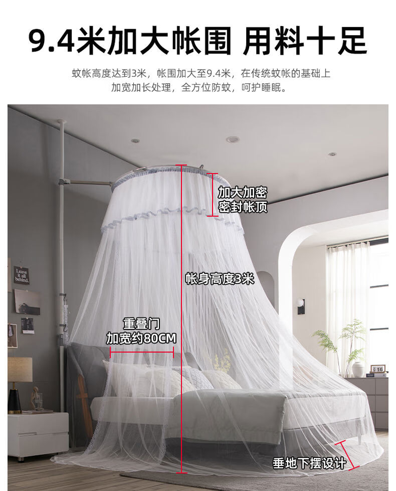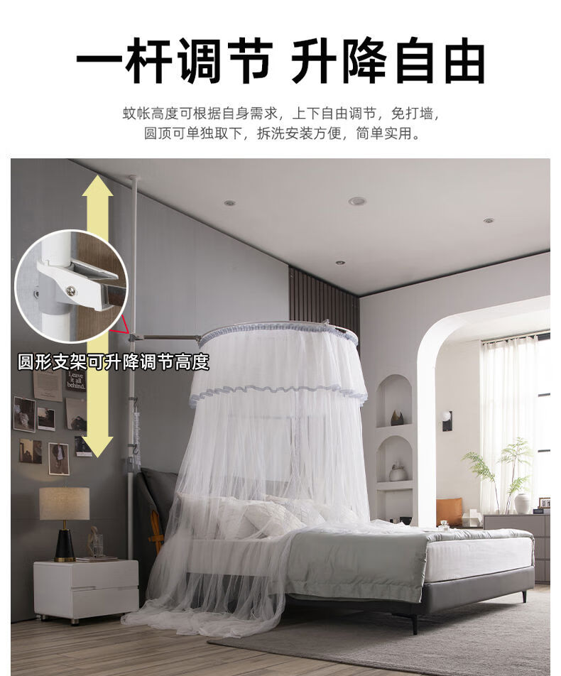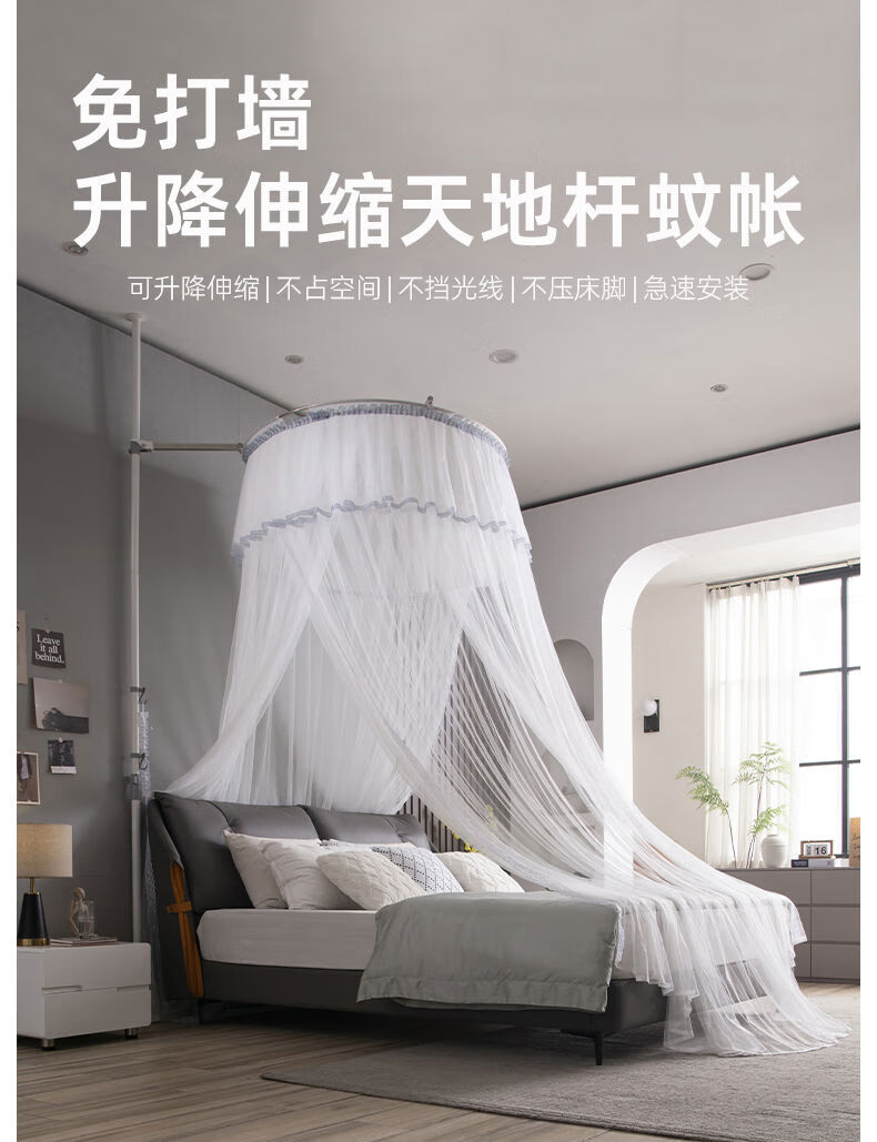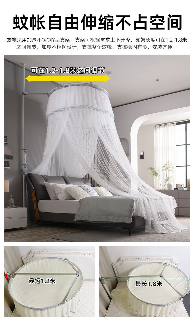 Yusenyi Tiandi Pole Mosquito Net Round Ceiling Princess 18m Bed Home Bedroom Telescopic Bracket 2 Meters The diameter of the mosquito net dome is 1.2 meters, one-size-fits-all, you can choose any size when placing an order. Width 0.9, length 2.0