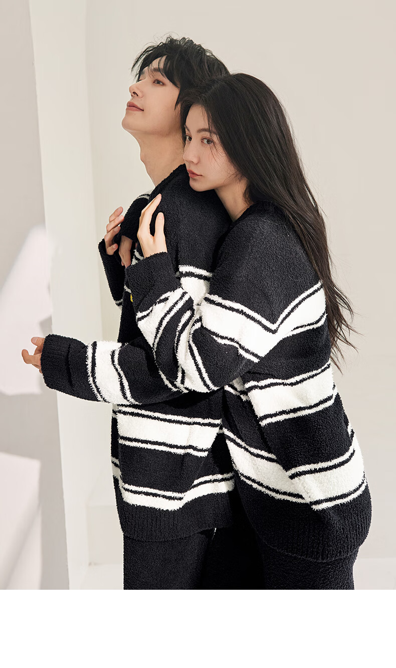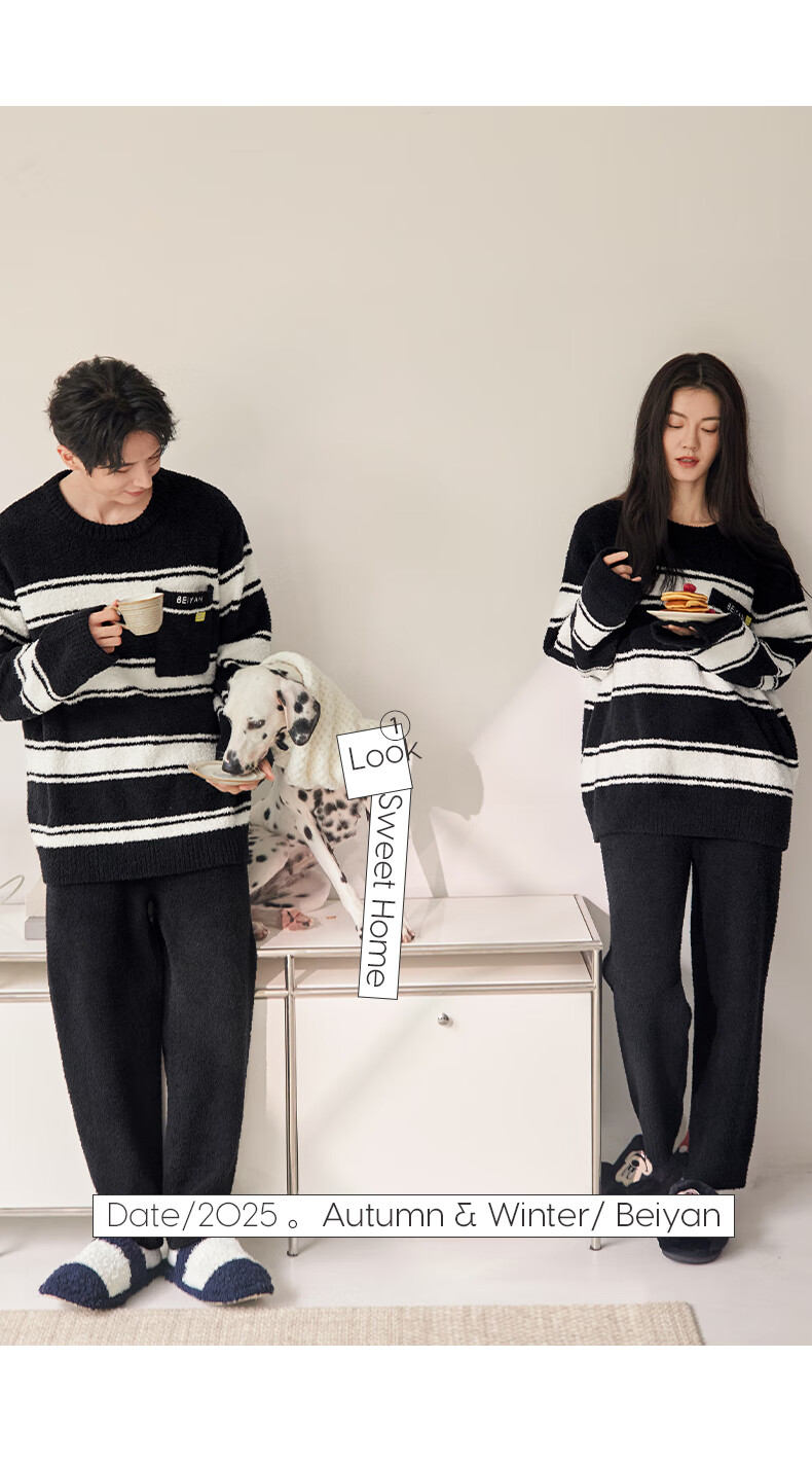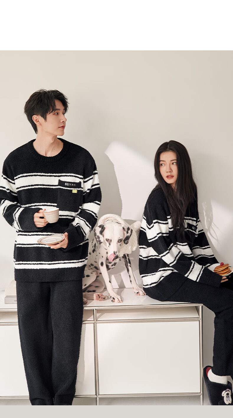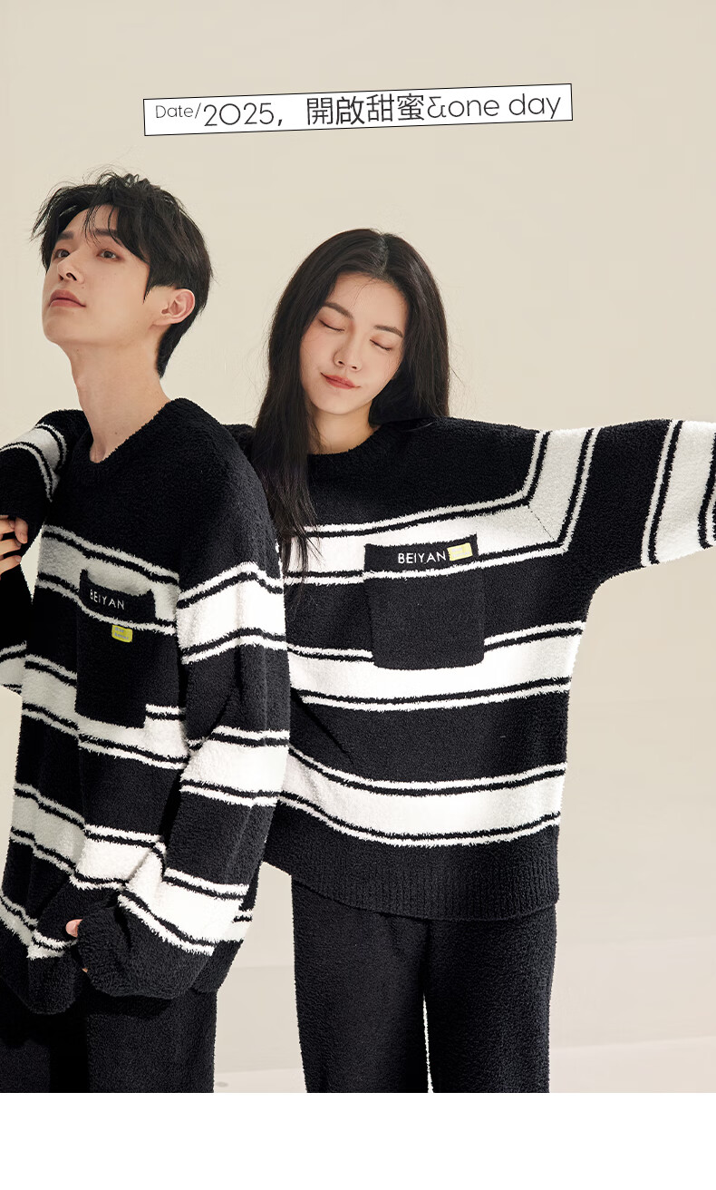 Beiyan Half Velvet Couple Pajamas for Men and Women New Autumn and Winter Striped Coral Velvet Warm Home Clothing Casual Outerwear Suit F60621 Men's L