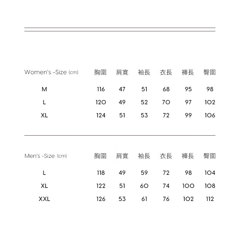China (cm) 160-165/84-86 165-170 / 88-90 167-172 / 92-96 168-173 / 98-102 170-176 / 106-110