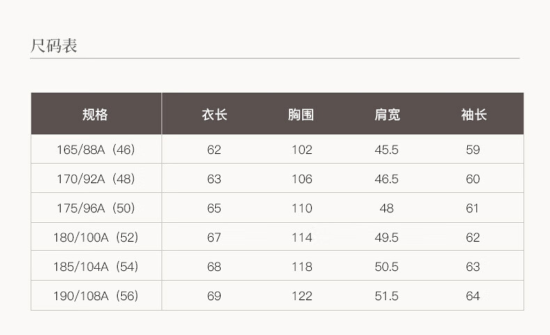 China (cm) 165 / 88-90 170 / 96-98 175 / 108-110 180 / 118-122 185 / 126-130