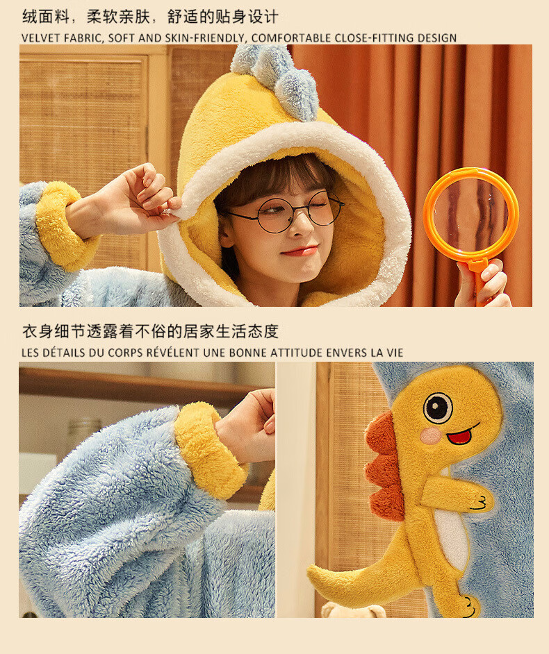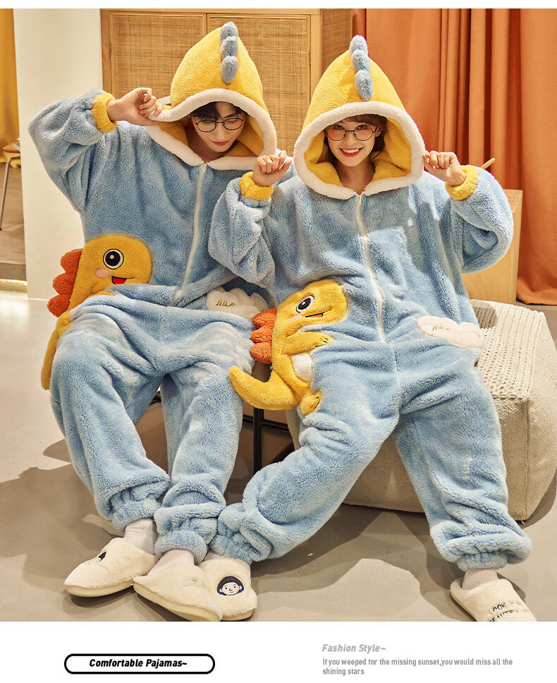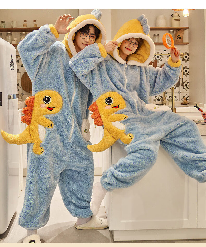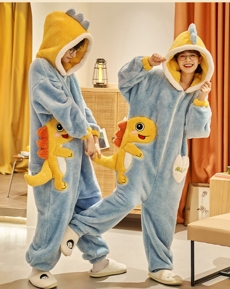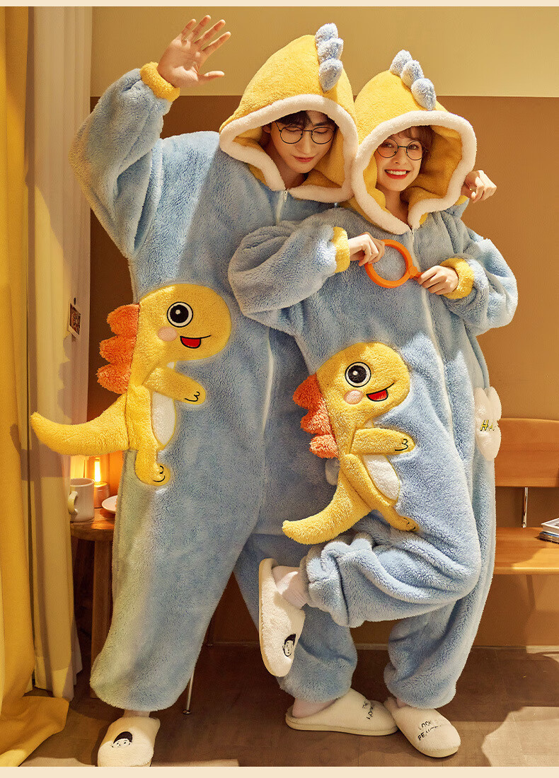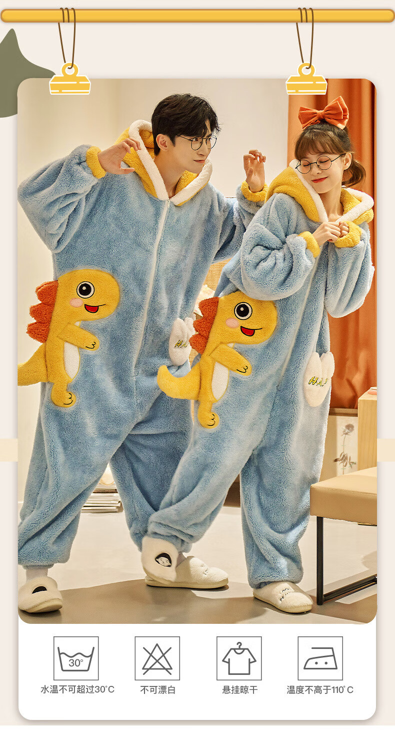 Skingcond autumn and winter coral velvet couple pajamas women's one-piece plus velvet thickened warm cartoon cute hooded home clothes can be worn outside Yellow Little Dinosaur L Women's 110-130Jin Jin equals 0.5 kg